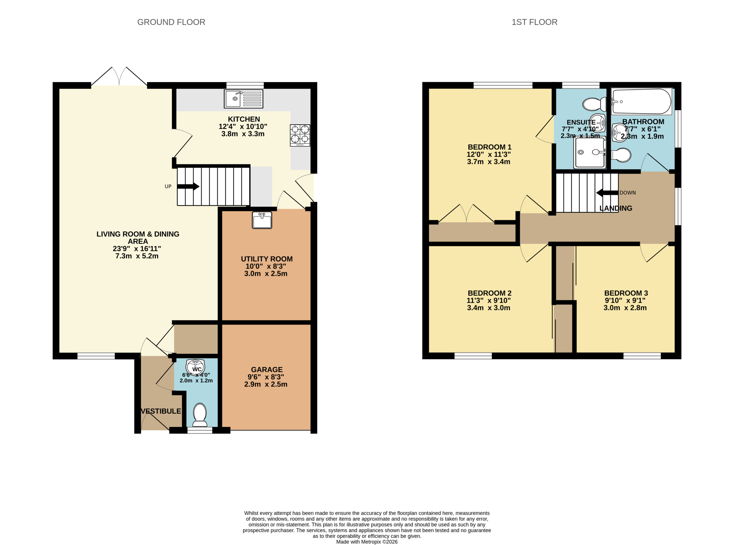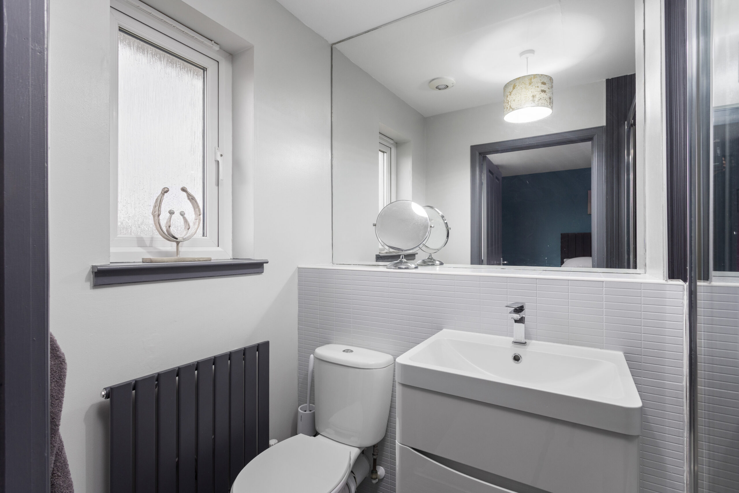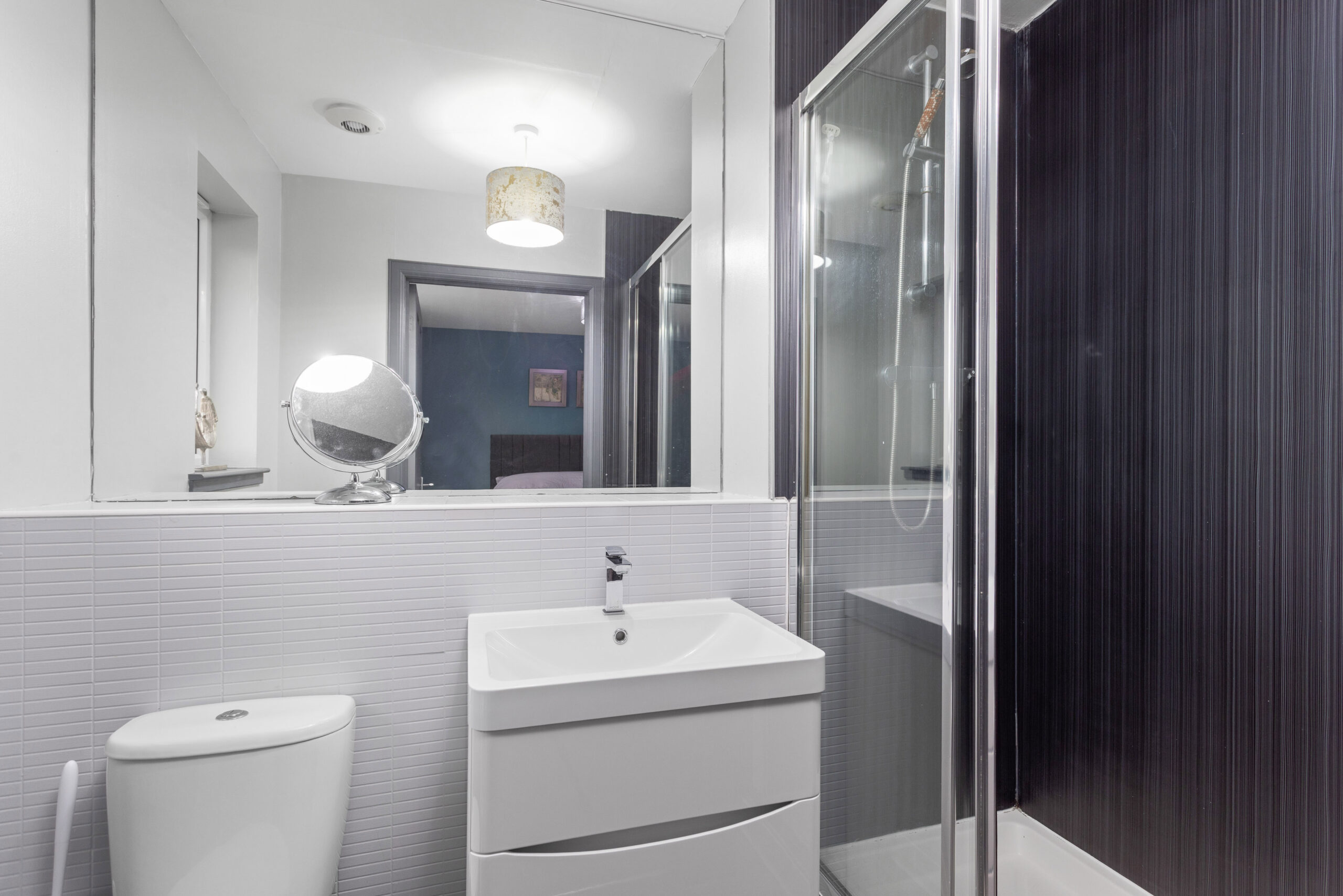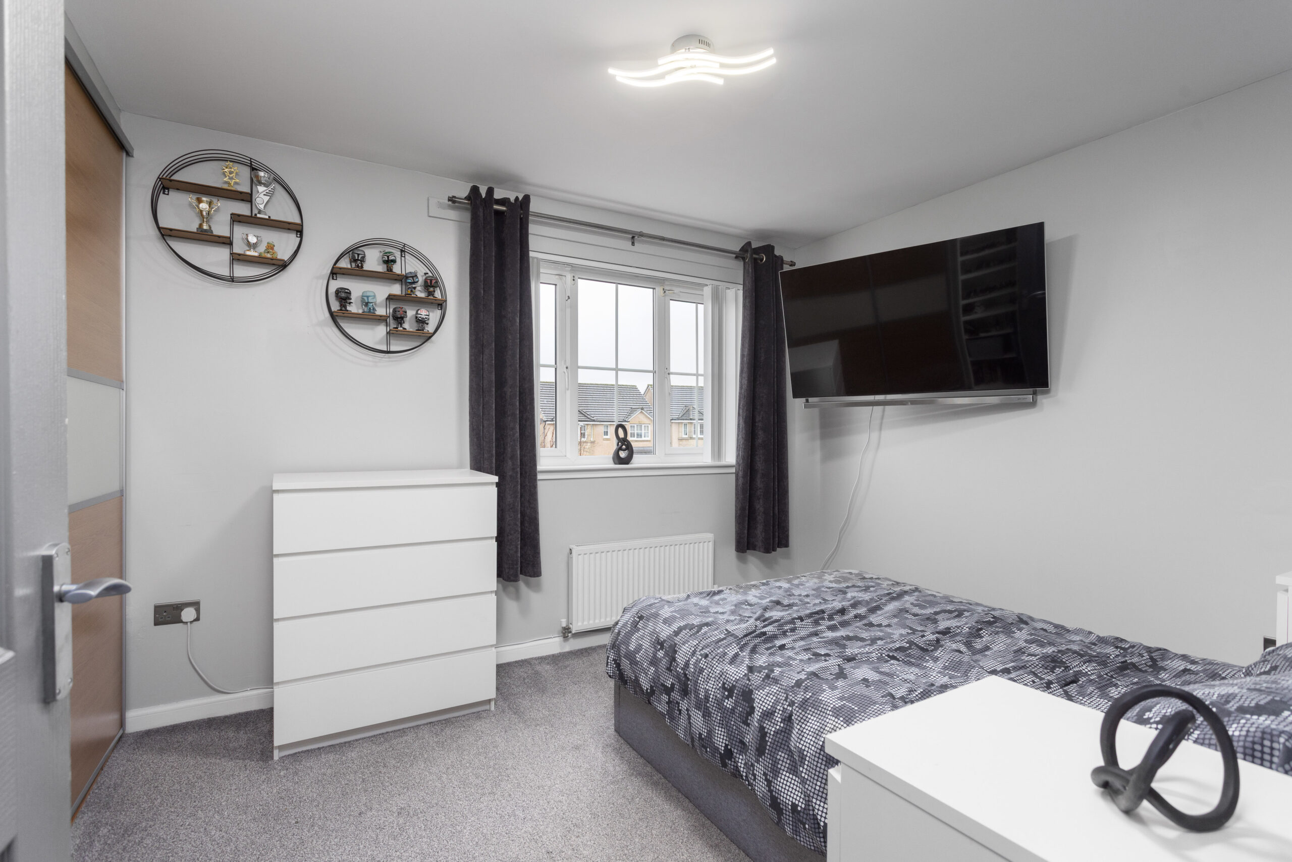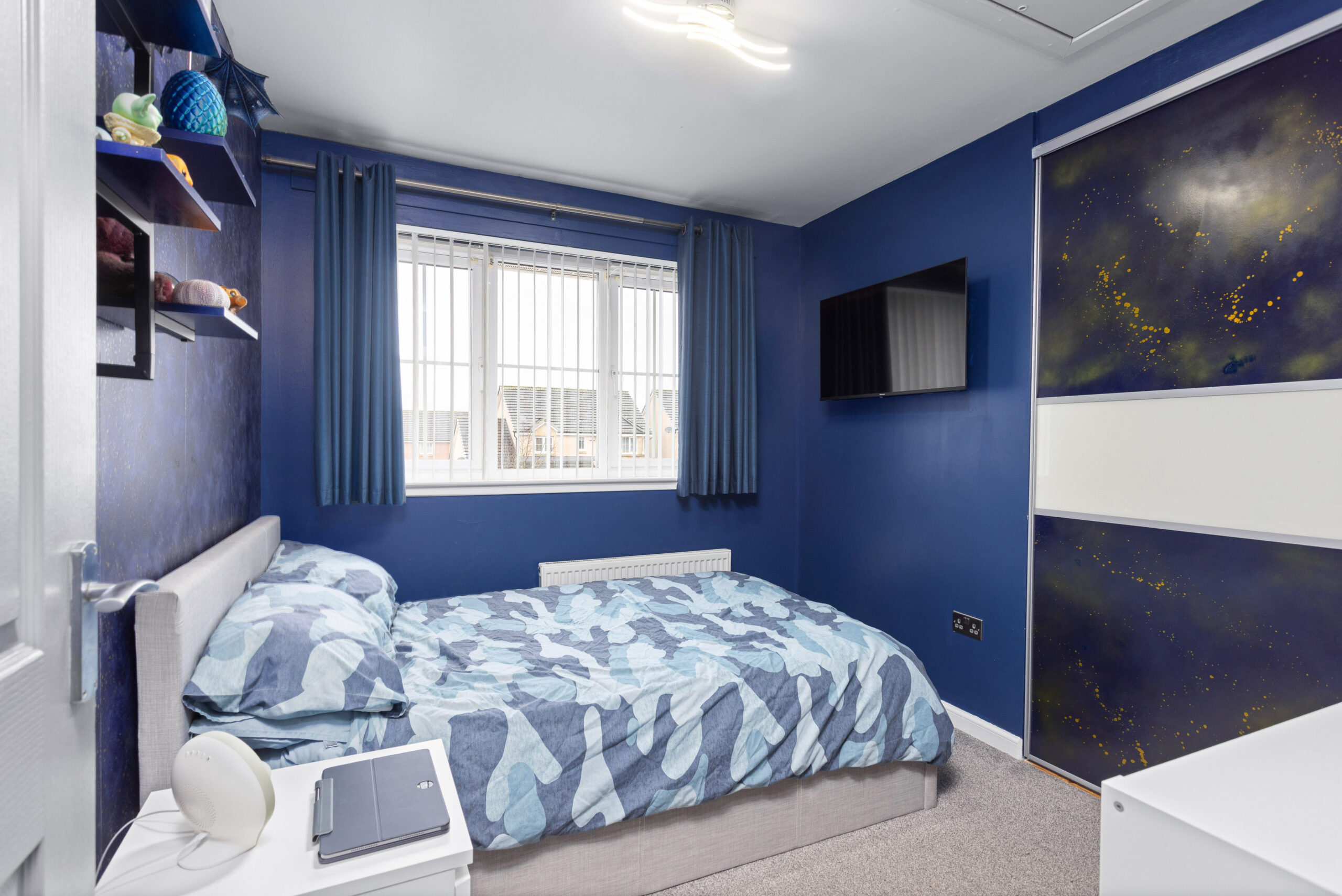 Upstairs, the home continues to impress. The principal bedroom, positioned to the front, comfortably accommodates a king size bed with bedside cabinets and benefits from a double fitted wardrobe. It also features a private ensuite shower room, finished with wet wall tiling, chrome fittings, a standing shower and natural ventilation via a window. Bedroom two is another generous double room with fitted wardrobe space and excellent natural light, ideal for guests or family members. Bedroom three also comfortably fits a double bed and includes a fitted wardrobe, offering flexibility for use as a bedroom, office or nursery.