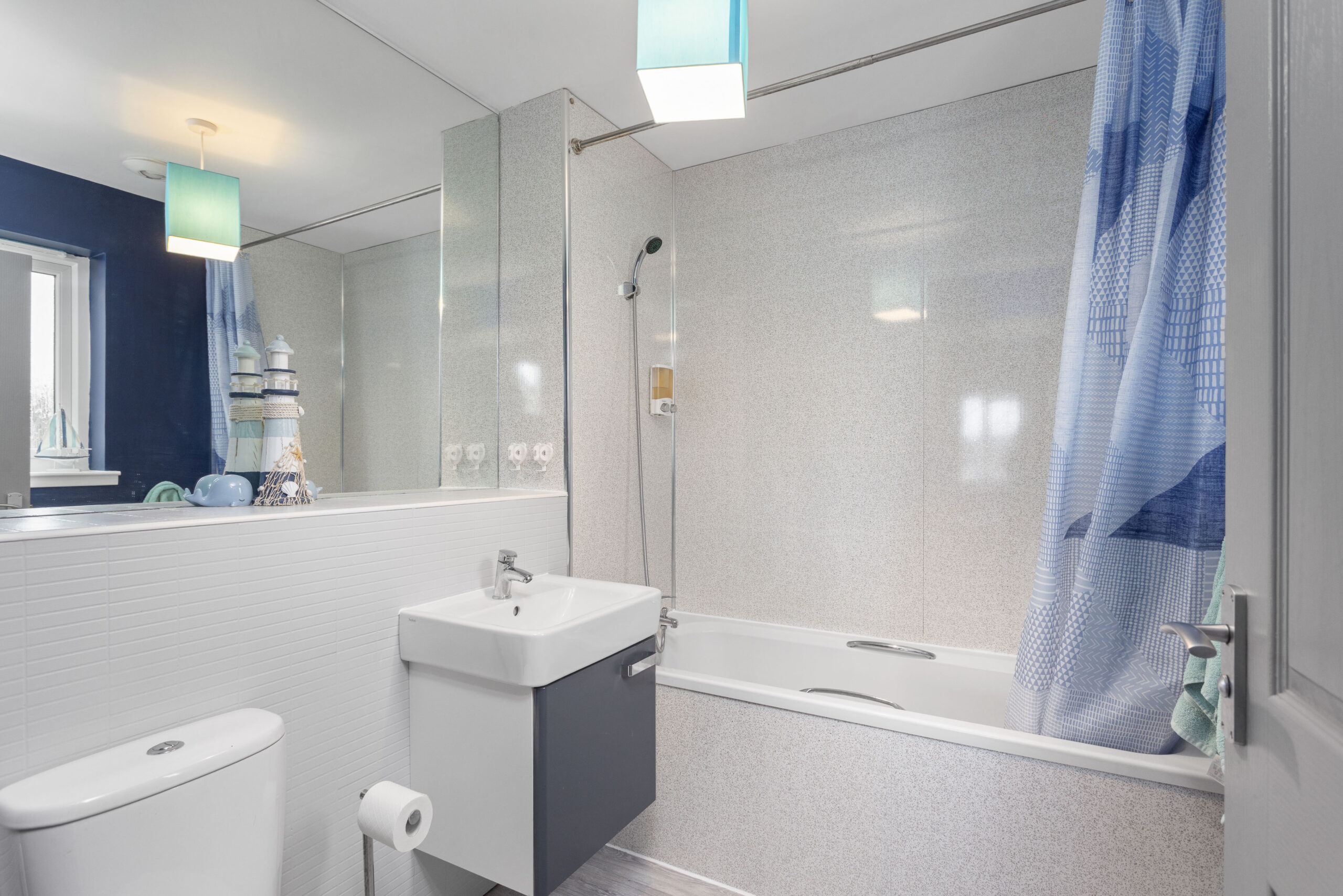The main family bathroom is fitted with a modern three piece suite comprising a bathtub with overhead shower, wet wall tiling, chrome accents and a made to measure mirror, creating a clean and contemporary finish.