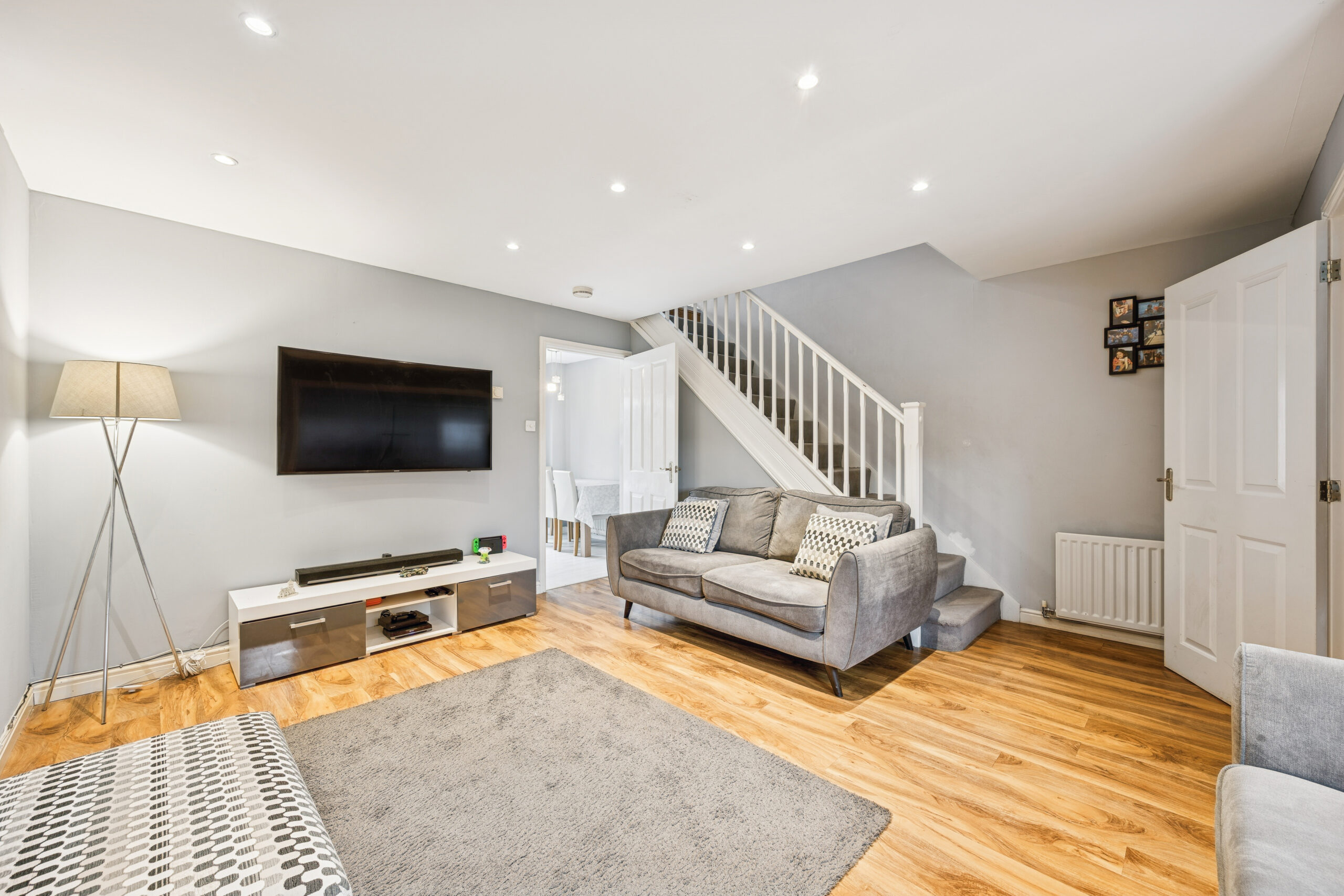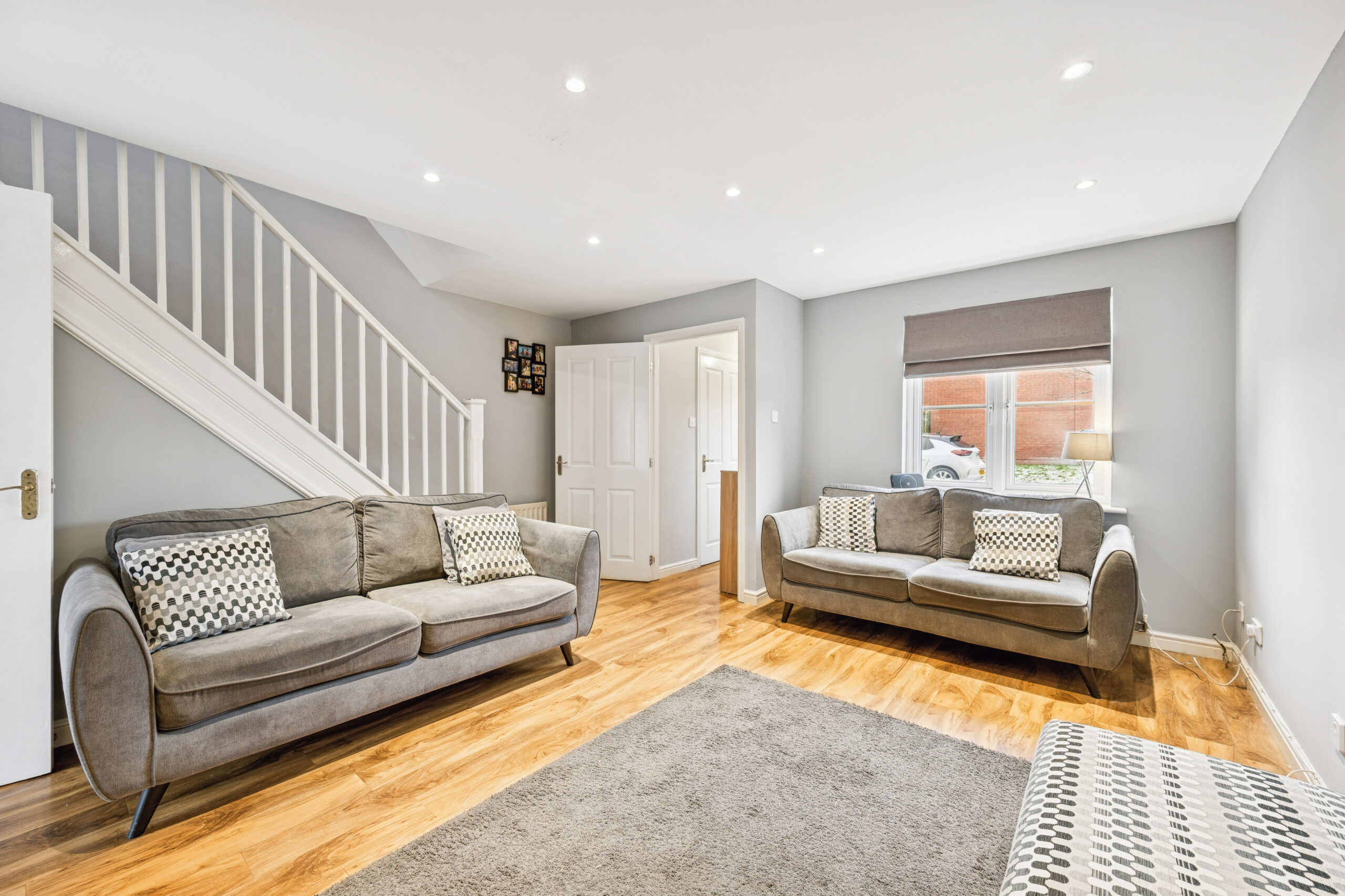 Moving from the hallway into the heart of the home which is the generously proportioned lounge, beautifully styled in modern grey tones that effortlessly combines sophistication with a cosy feel. The home features warm wooden laminate flooring flowing seamlessly throughout the entire ground floor and into each of the three upstairs bedrooms, creating a cohesive and elegant backdrop that suits a wide range of personal décor styles. The staircase is finished with soft grey carpeting, adding warmth and comfort as you move between floors.