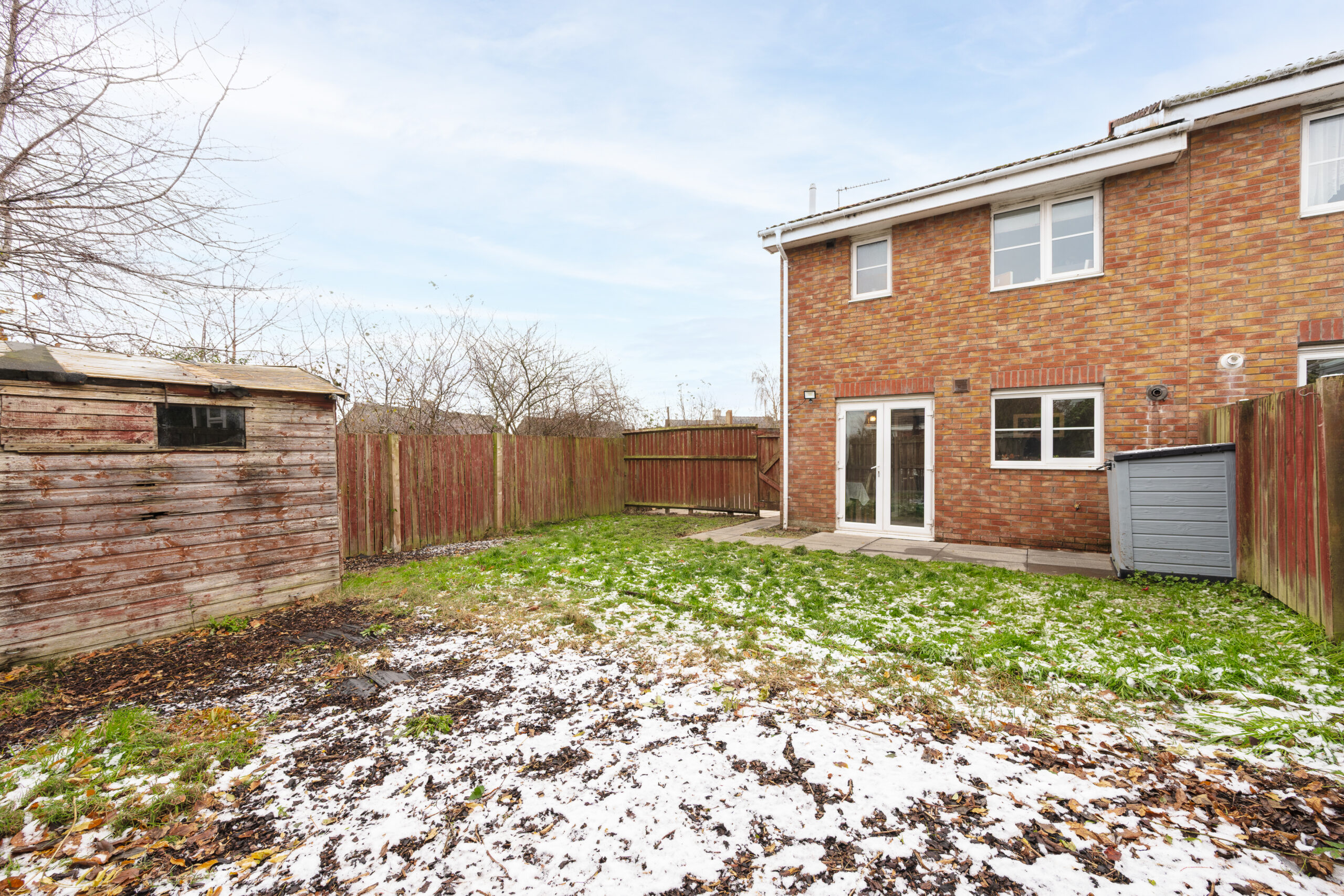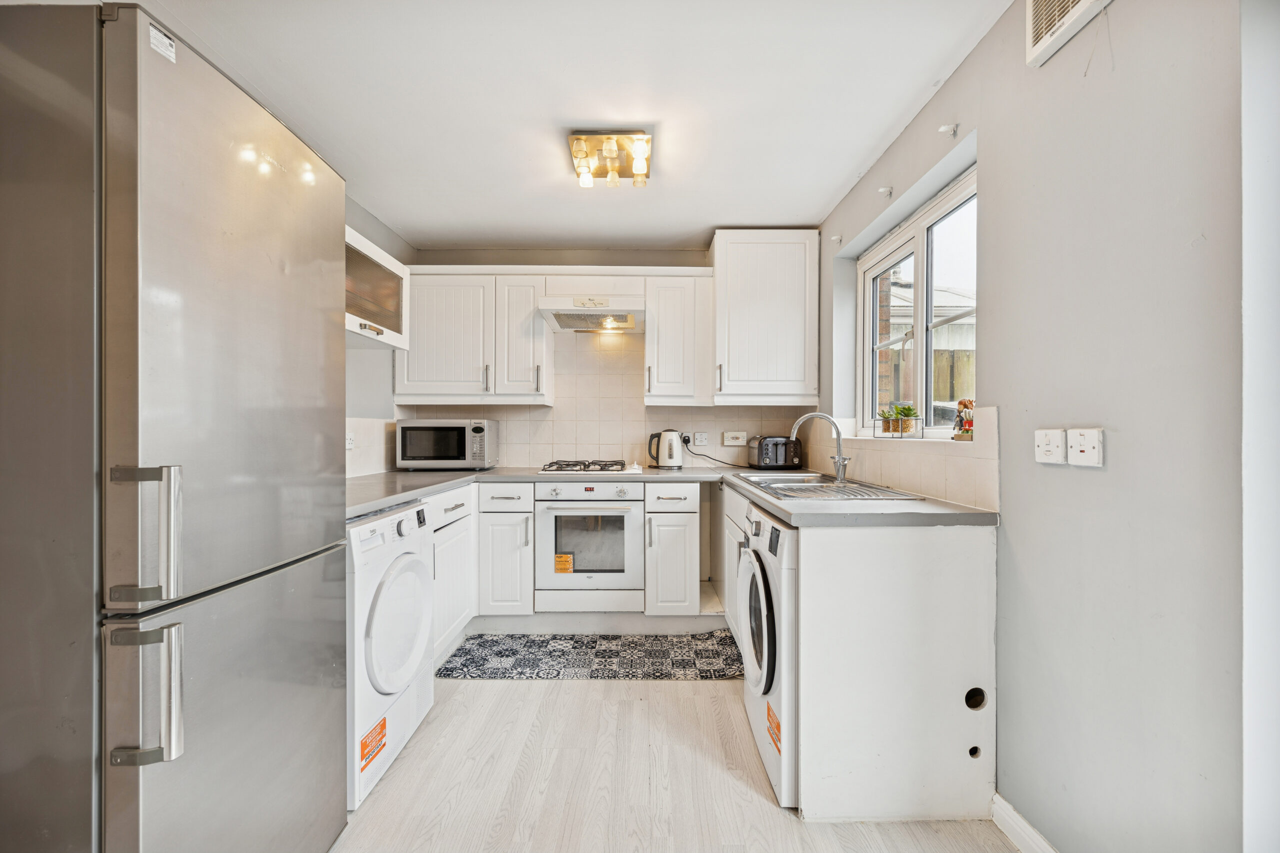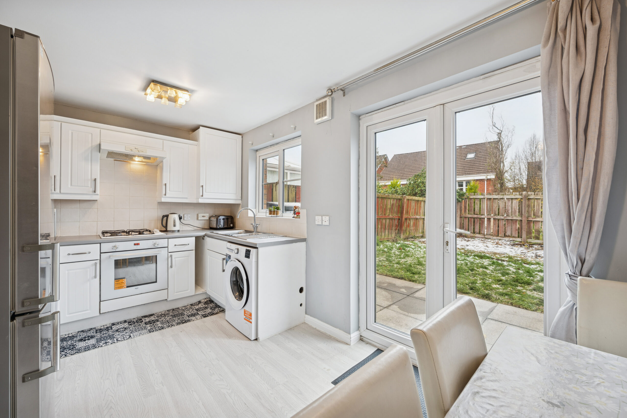 Flowing through from the lounge to the kitchen, you’ll find a space that provides style with functionality. The kitchen is finished with bright white shaker-style cabinetry and contrasting worktops, offering an abundance of storage and preparation space. The warm, light grey laminate flooring complements the design beautifully. A handy built-in storage cupboard under the stairs ensures the room remains clutter-free, while the generous floor space easily accommodates a family dining table, making this the perfect spot for family meals or social gatherings. The double French doors at the rear of the kitchen fill the room with natural light and provide a seamless connection to the garden, enhancing the feeling of openness and inviting the outdoors in during the warmer months.