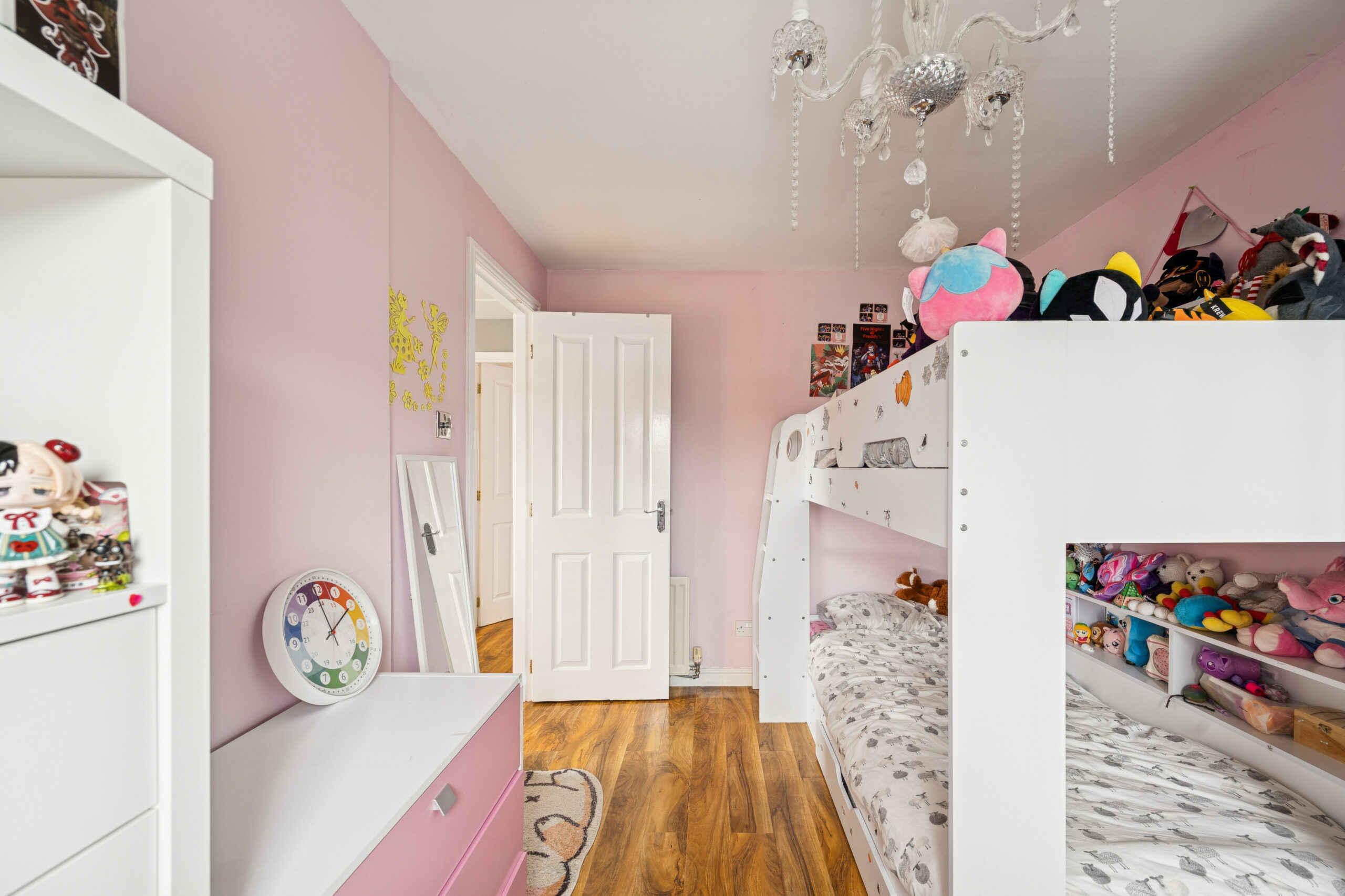 Upstairs, the warm wooden laminate flooring continues to create a bright, polished feel throughout the landing and into each bedroom. The master bedroom is positioned to the front of the property and offers excellent space for a king-sized bed and additional furniture’s such as wardrobe or bedside cabinets to maximise functionality without compromising on style. Bedroom two positioned at the rear of the home and currently styled as a beautifully decorated children’s room, filled with personality and character, yet its generous proportions allow it to comfortably accommodate a double bed, making it an incredibly versatile space as needs evolve. Bedroom three is equally flexible, also positioned to the back of the deal as a single bedroom, home office, nursery, or creative studio. The family bathroom completes this floor and has been finished to an impressive standard, showcasing stunning neutral marble stone-effect tiling that adds a luxurious feel. Its calm, spa-like atmosphere makes it the perfect place to unwind after a long day.