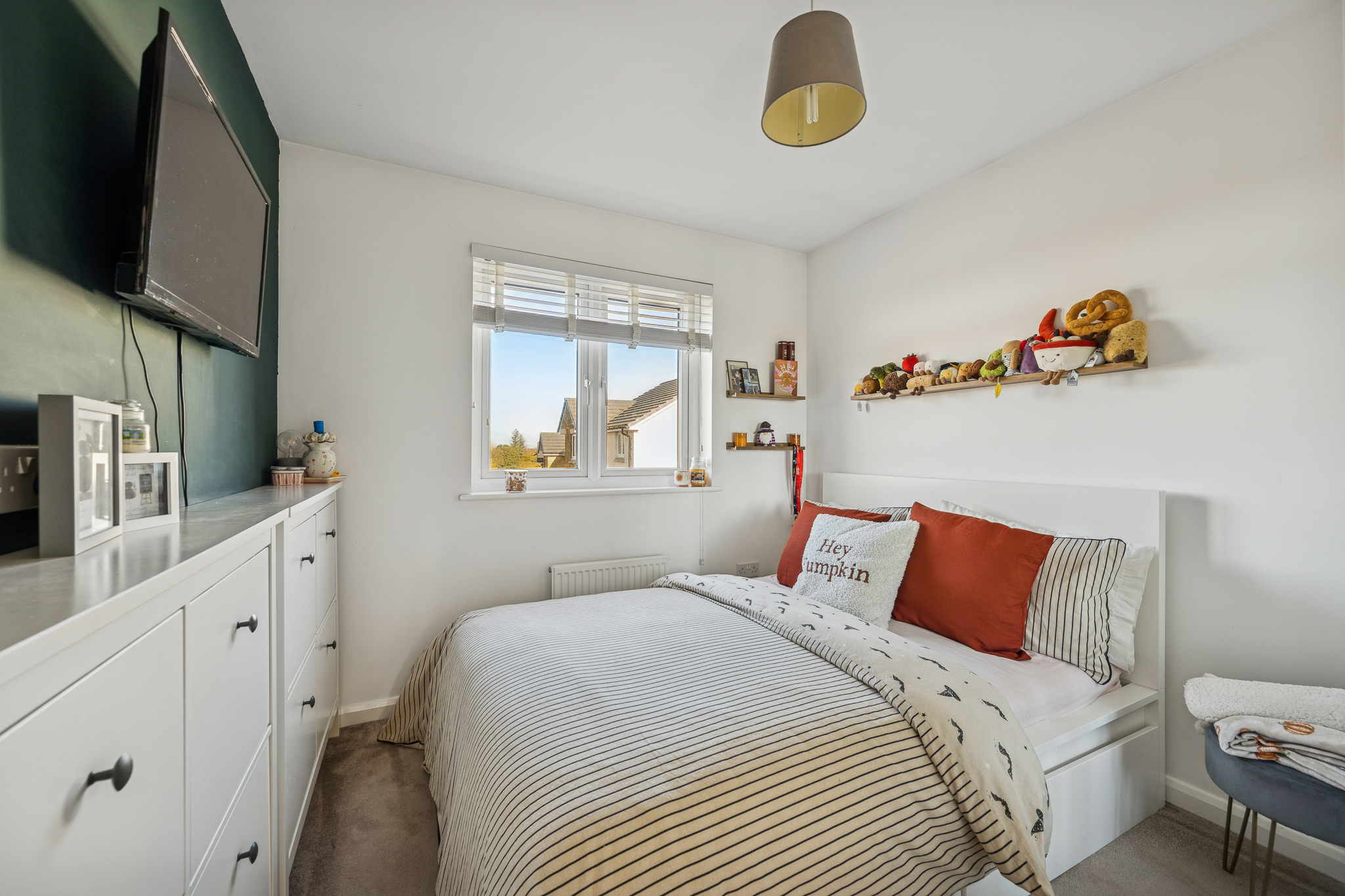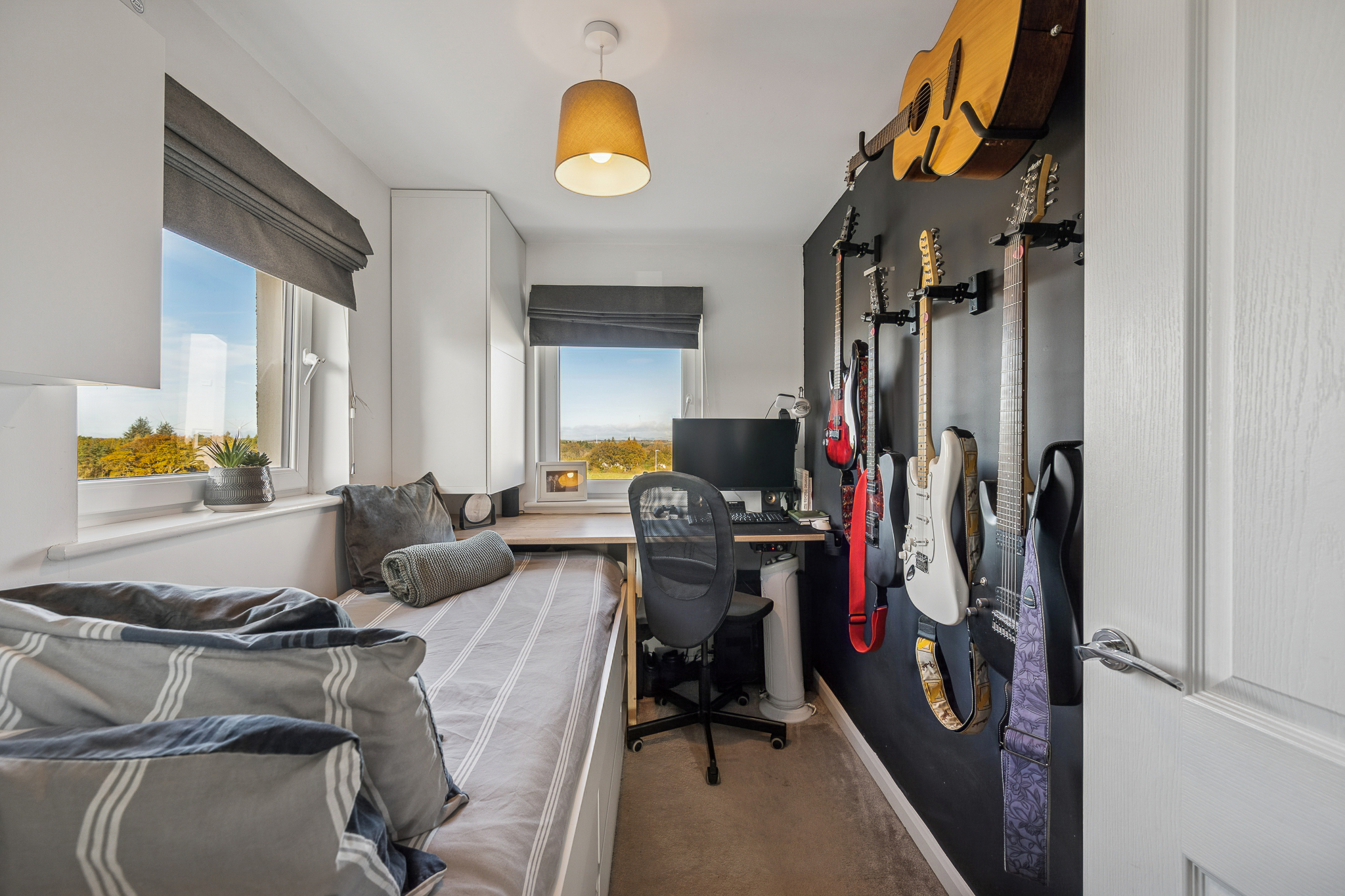 Bedroom two can comfortably fit a double bed with space for a wardrobe and drawers, making it ideal as a guest or second bedroom. Bedroom three is currently used as a single room and workspace, offering flexibility as a nursery, home office, or children’s bedroom. This room enjoys double aspect windows, allowing for an abundance of natural light and lovely open views.