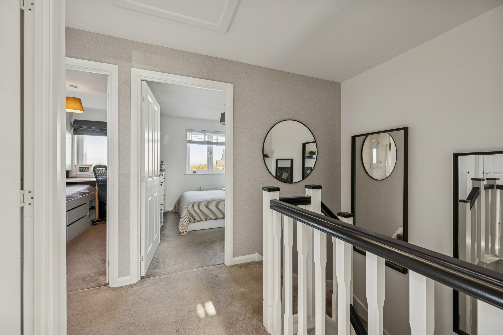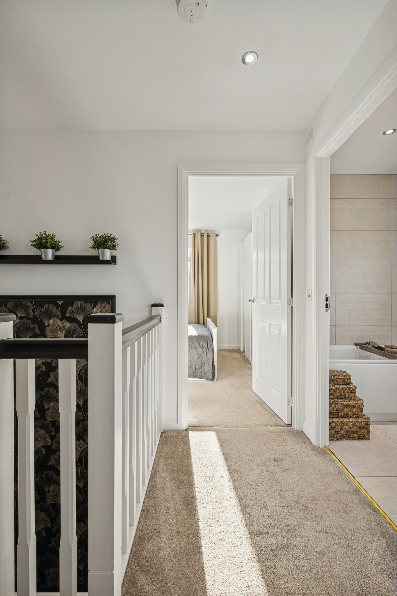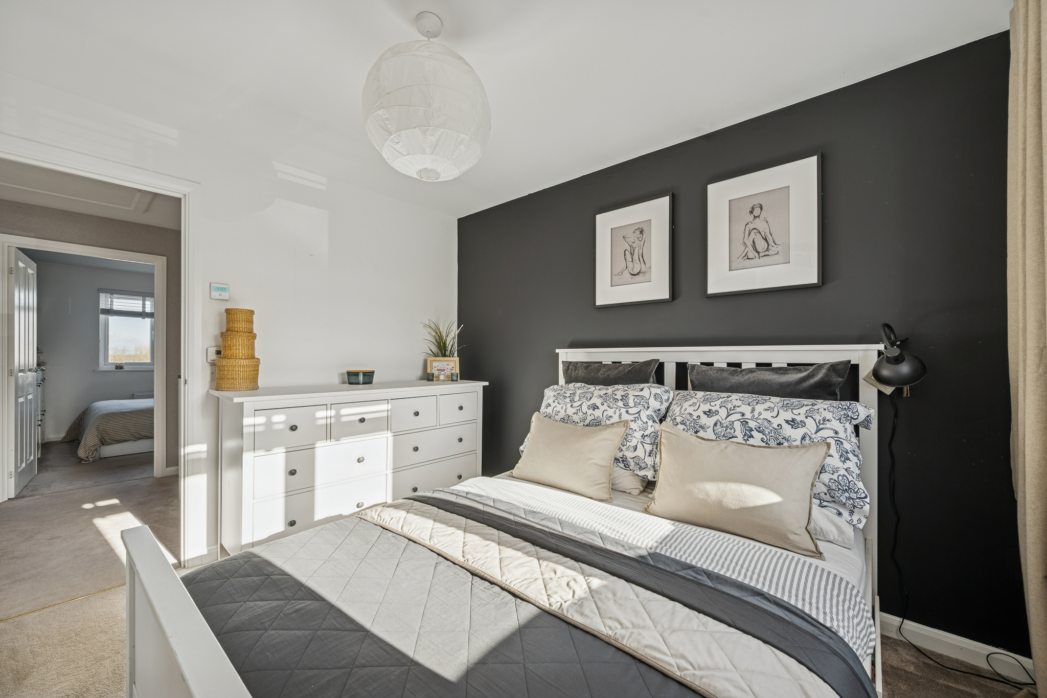 Upstairs, a bright and spacious landing introduces the rest of the home. The principal bedroom can comfortably accommodate a king size bed with bedside cabinets and features space for wardrobes. It also benefits from a private en-suite, a stylish three-piece suite with splashback tiling, a fully tiled shower enclosure, and chrome fixtures providing a touch of luxury to everyday living.