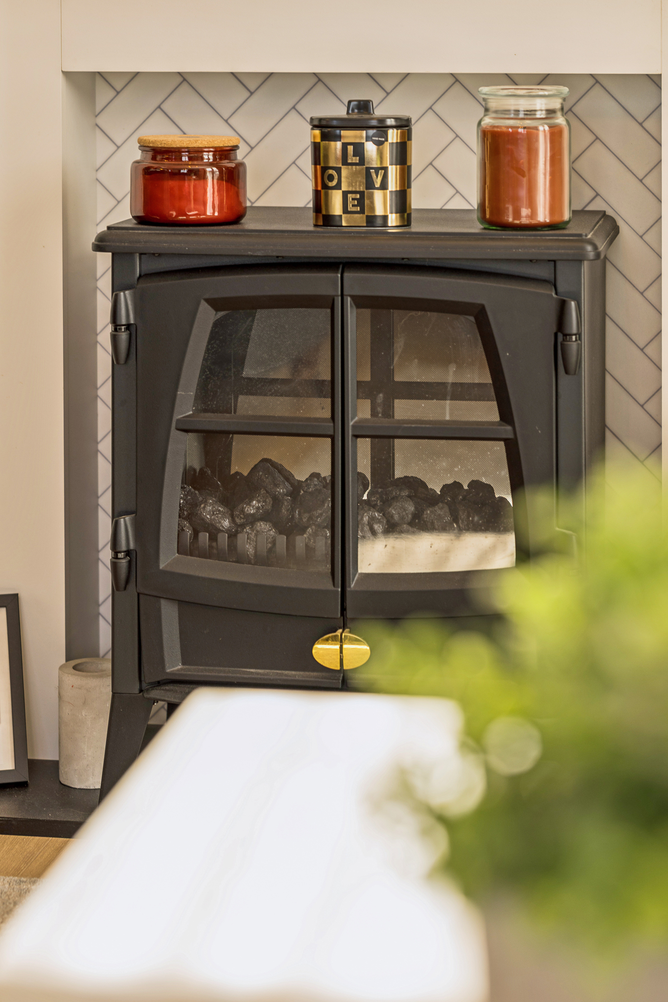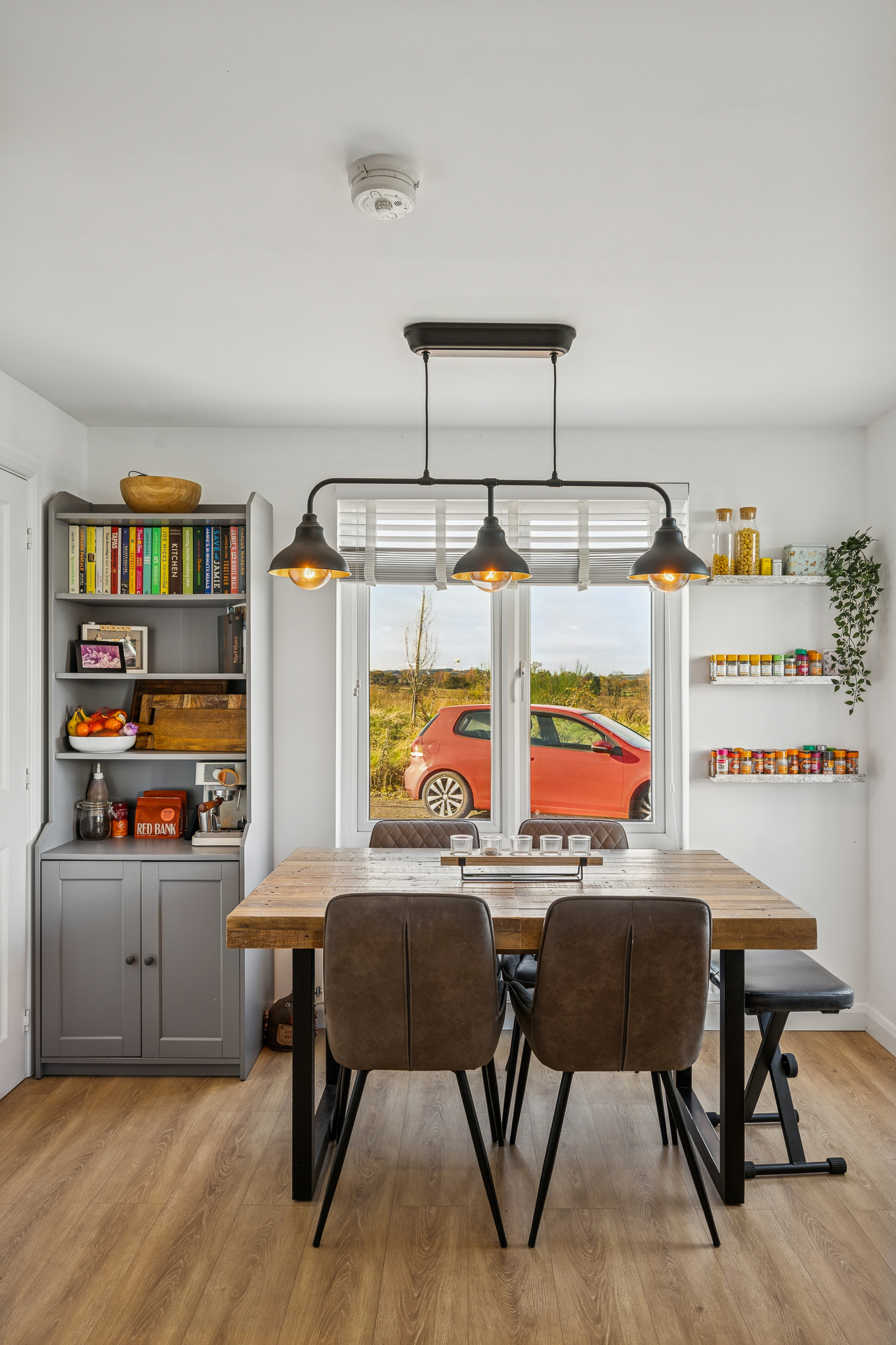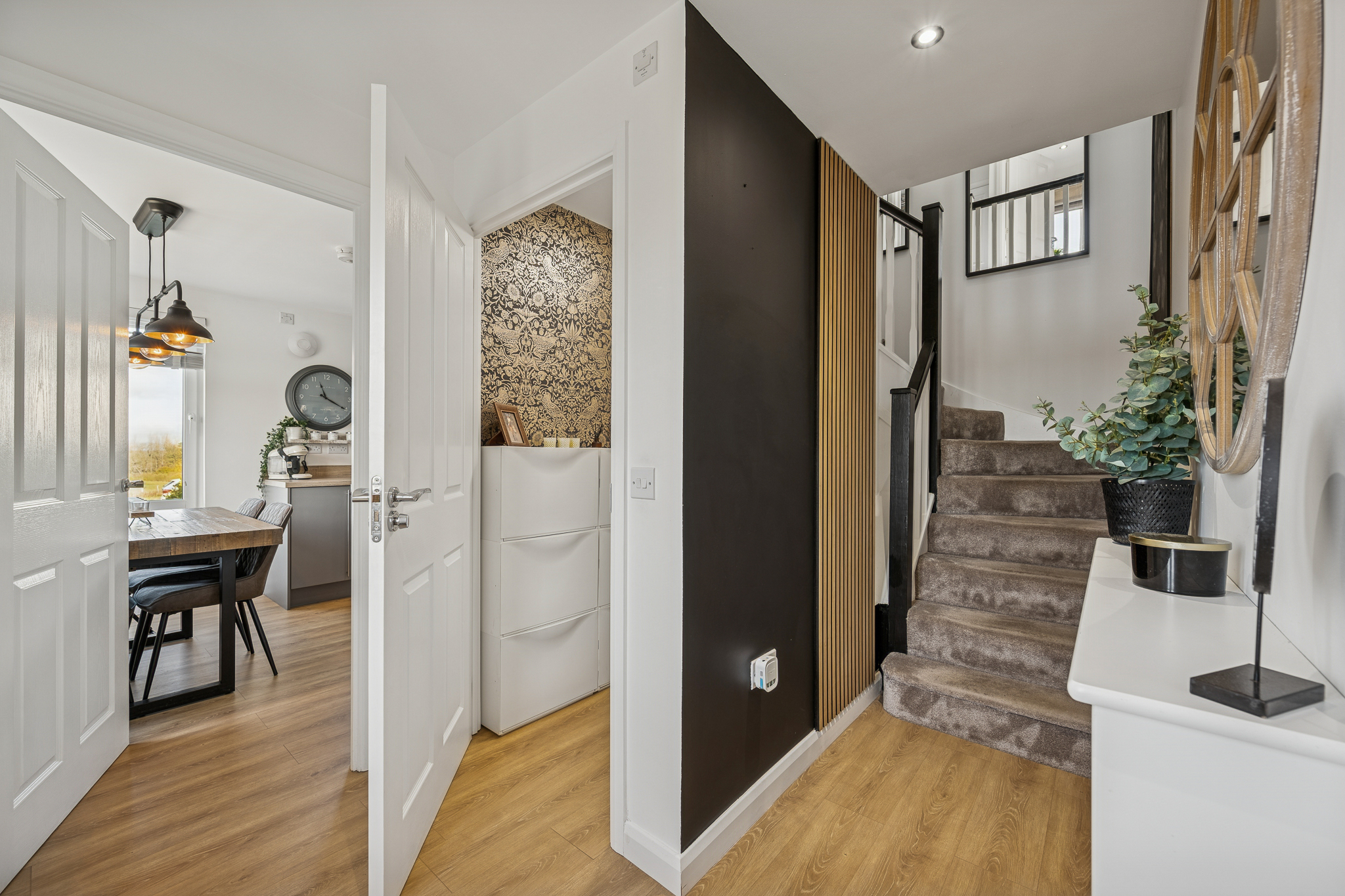 To the left hand side of the hallway, you’ll find the open-plan kitchen and dining area, the true heart of the home. Designed with both practicality and style in mind, this area features dual-aspect windows that create a bright, airy feel. The kitchen is fitted with all integrated appliances, including a four-point gas cooker, oven, washer-dryer, dishwasher, and fridge-freezer. Finished with modern grey cabinetry, wood-style worktops, and chrome accents, it strikes the perfect balance between sleek and functional. The dining area comfortably hosts four people and is ideal for family meals or hosting guests. Also on the ground floor, a two-piece WC sits conveniently off the hallway, finished with character wallpaper, chrome fittings, and a clean, contemporary look.