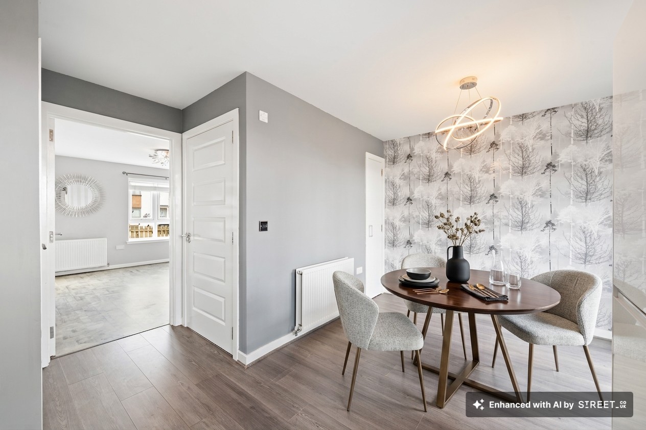 Step inside and you enter straight into the main living space, a bright, stylish lounge. The modern grey wood effect flooring runs throughout the ground floor, complemented by crisp neutral décor that makes the space feel light and inviting. The staircase is positioned neatly within the room, finished with soft grey carpeting and white balustrades, keeping the overall look cohesive and modern. It’s a comfortable and well proportioned living area, ideal for relaxing in the evenings or entertaining guests.