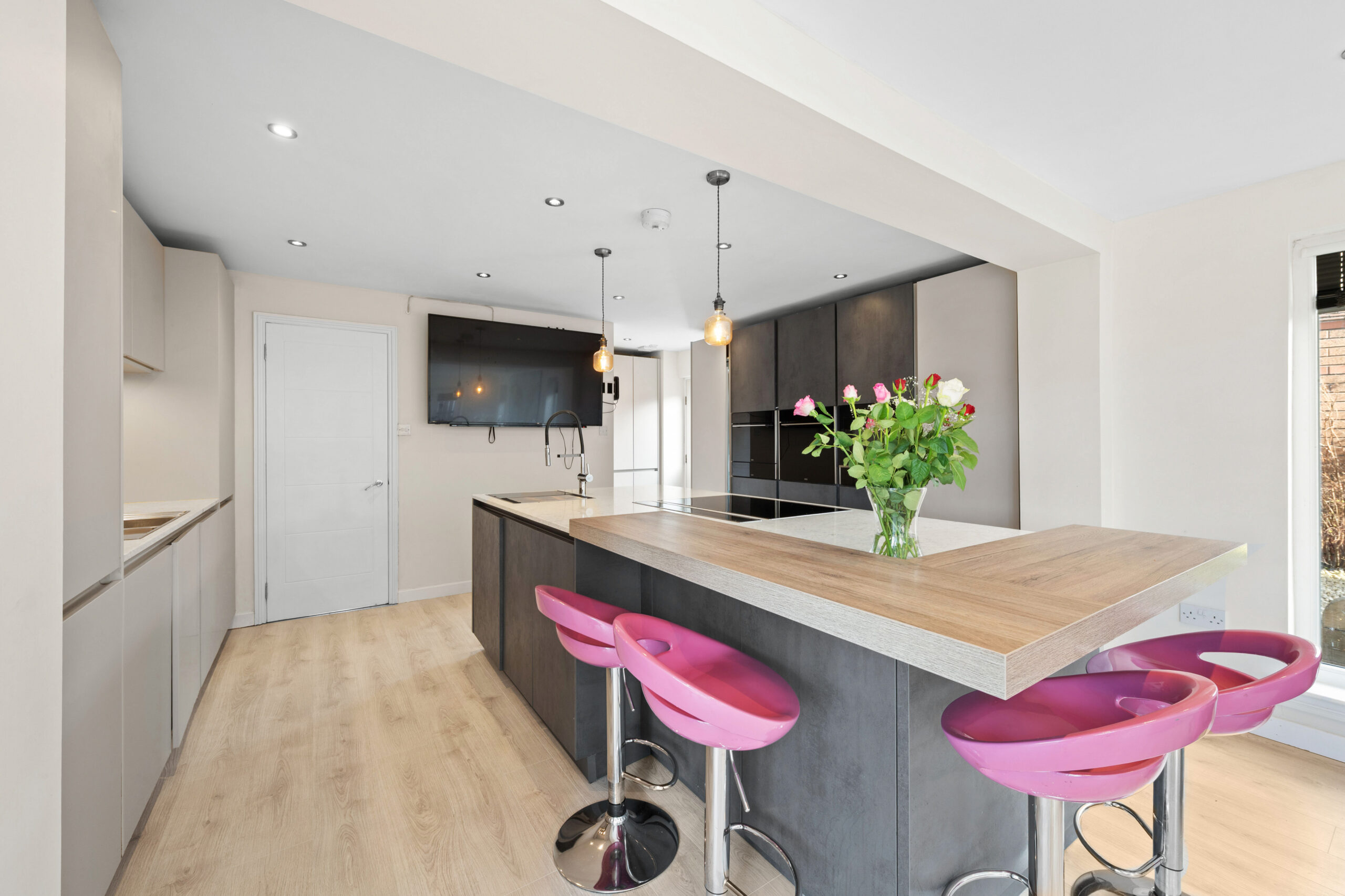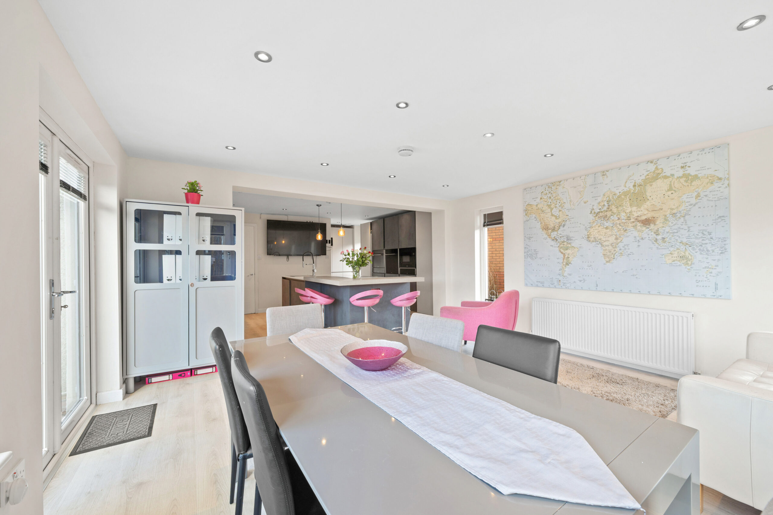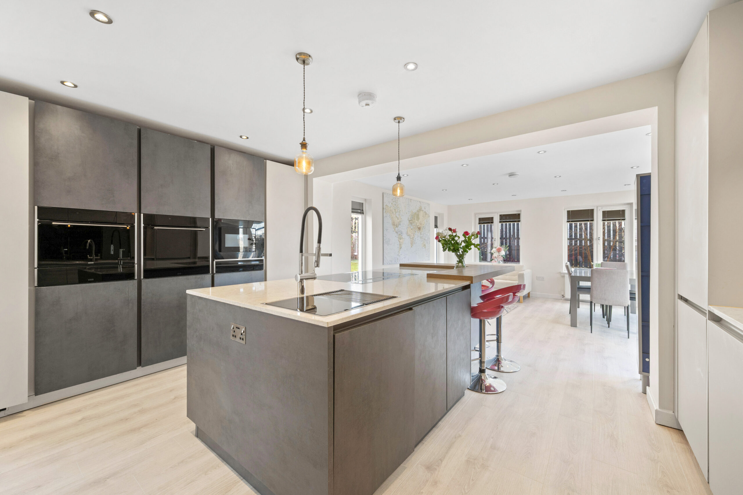 To the rear of the property lies the heart of the home, the expansive open plan kitchen and dining area forming part of the rear extension. This impressive space is designed for modern family living and entertaining, featuring dark grey cabinetry, generous worktop space and a large central island. The kitchen includes integrated appliances such as ovens, fridge, freezer, dishwasher and cooker. The dining area comfortably accommodates eight to ten people and is surrounded by windows and patio doors that lead directly to the south facing rear garden, allowing natural light to flood the space.