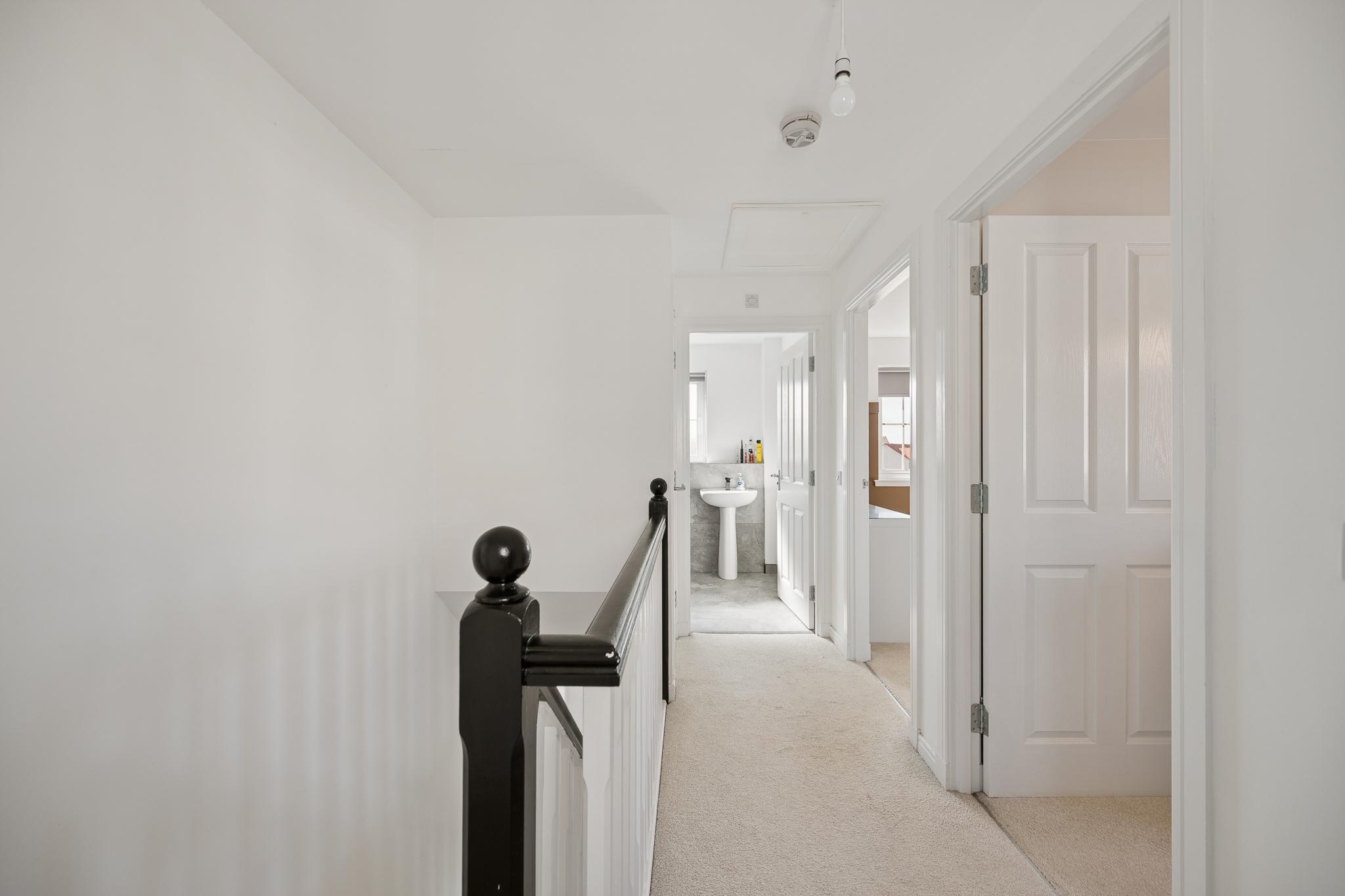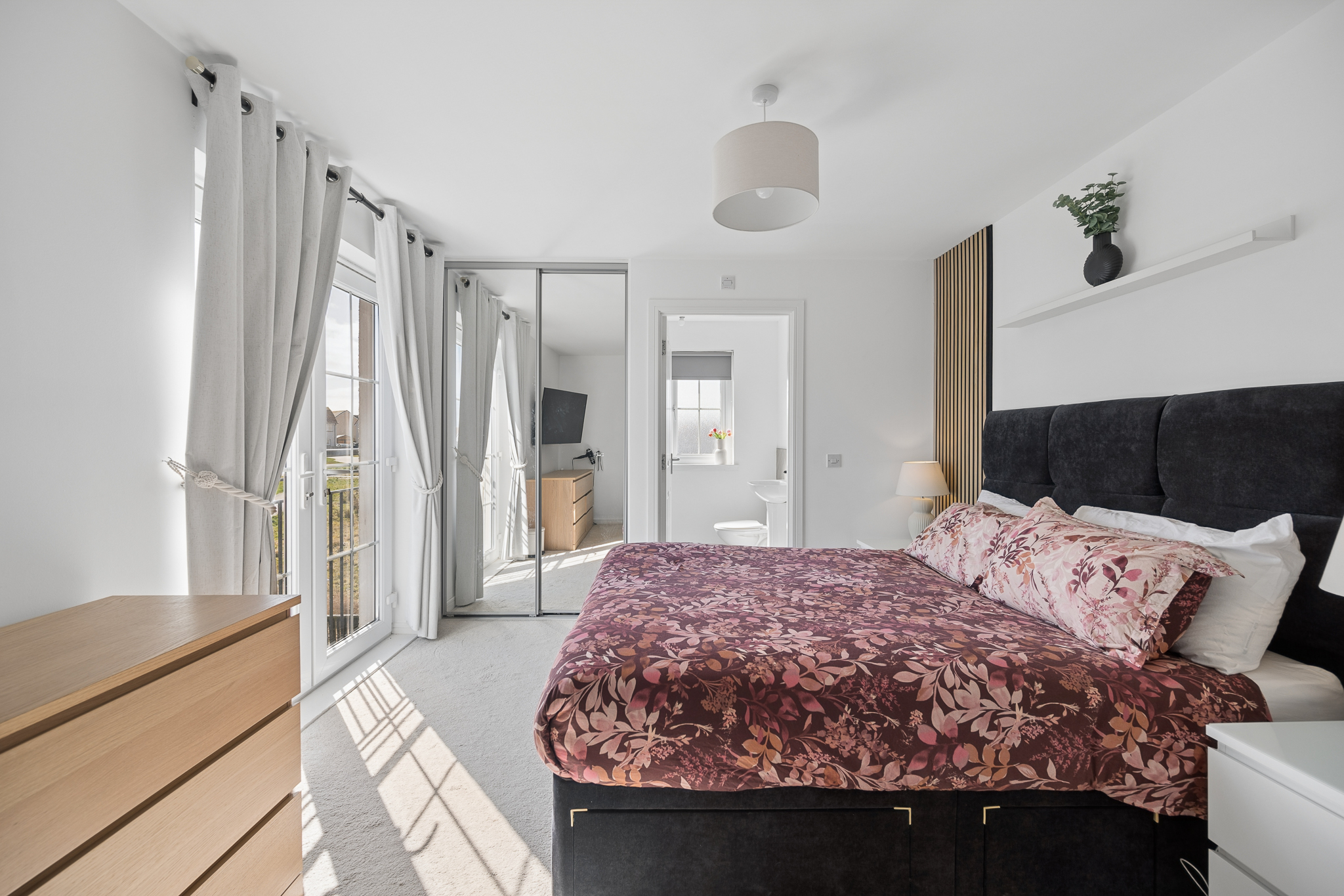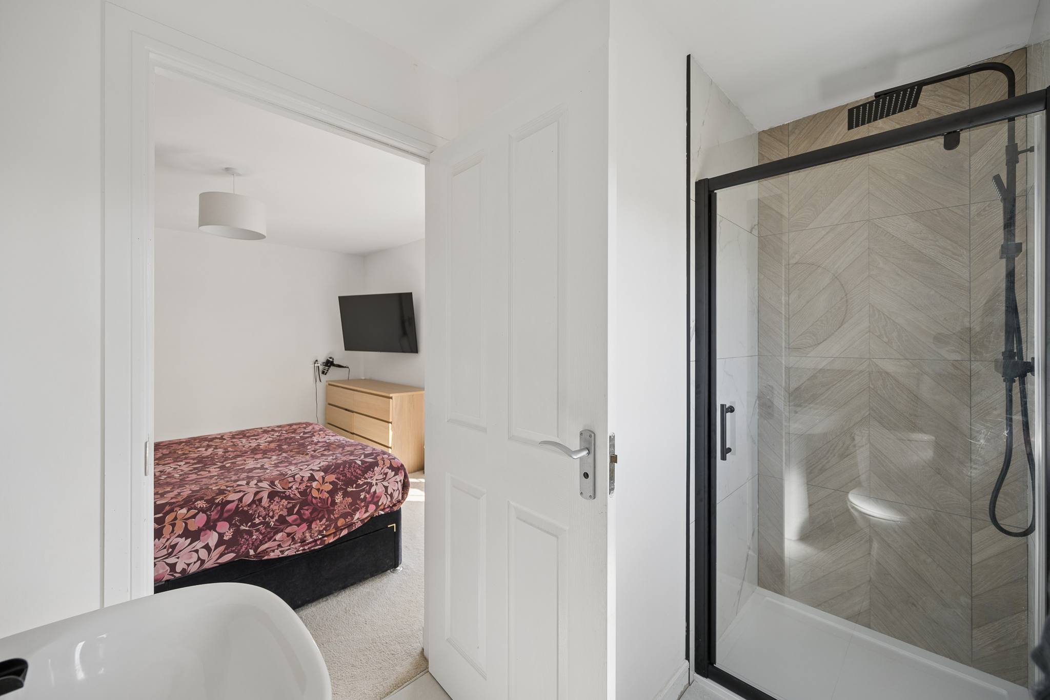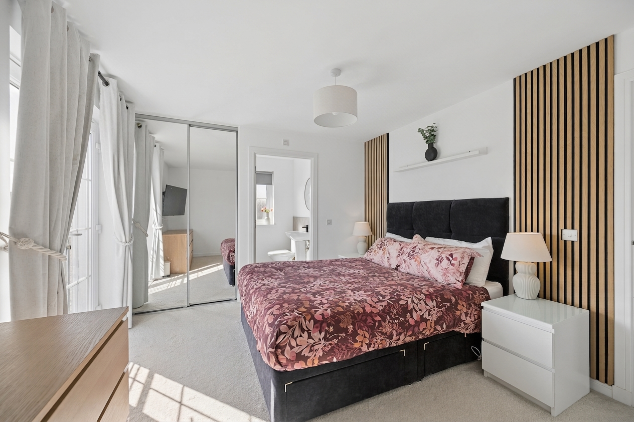 Heading upstairs, a soft cream carpet runs underfoot, enhancing the sense of warmth and comfort throughout the upper level. To the right hand side, the principal bedroom is a bright and spacious retreat, comfortably accommodating a king size bed and benefiting from built in mirrored wardrobes. A stunning Juliet balcony window allows natural light to pour in, while also offering a lovely outlook. This room is further enhanced by a recently renovated en-suite, finished to a high standard with a sleek walk in shower, with a combination of both herringbone style tiling and elegant white marble effect tiling, and modern black fittings that create a luxurious, hotel like feel.
