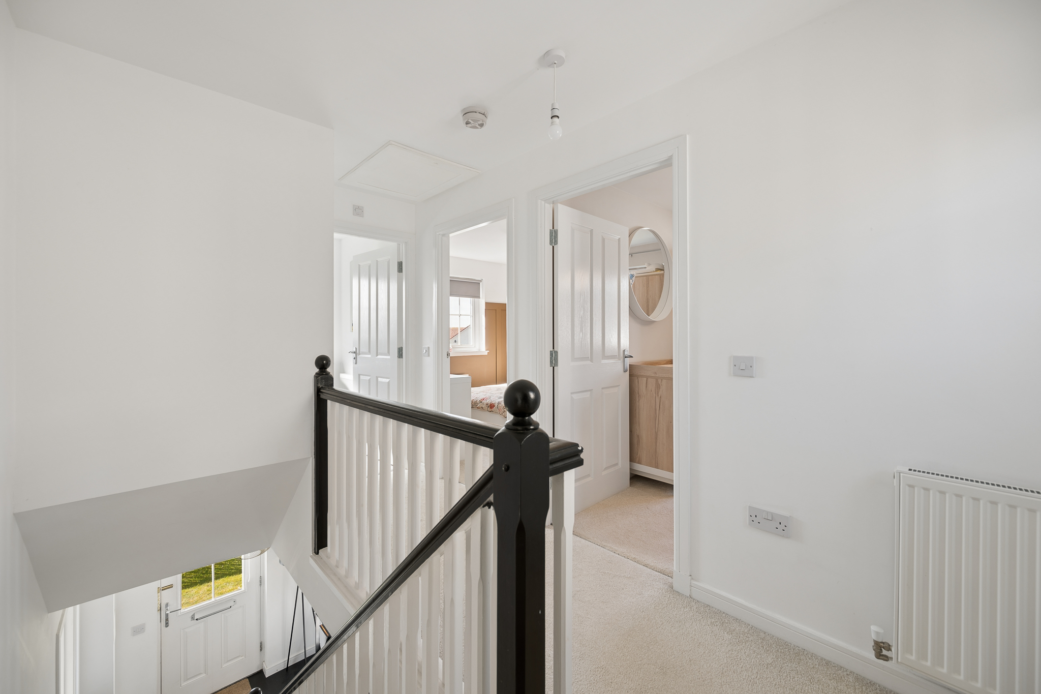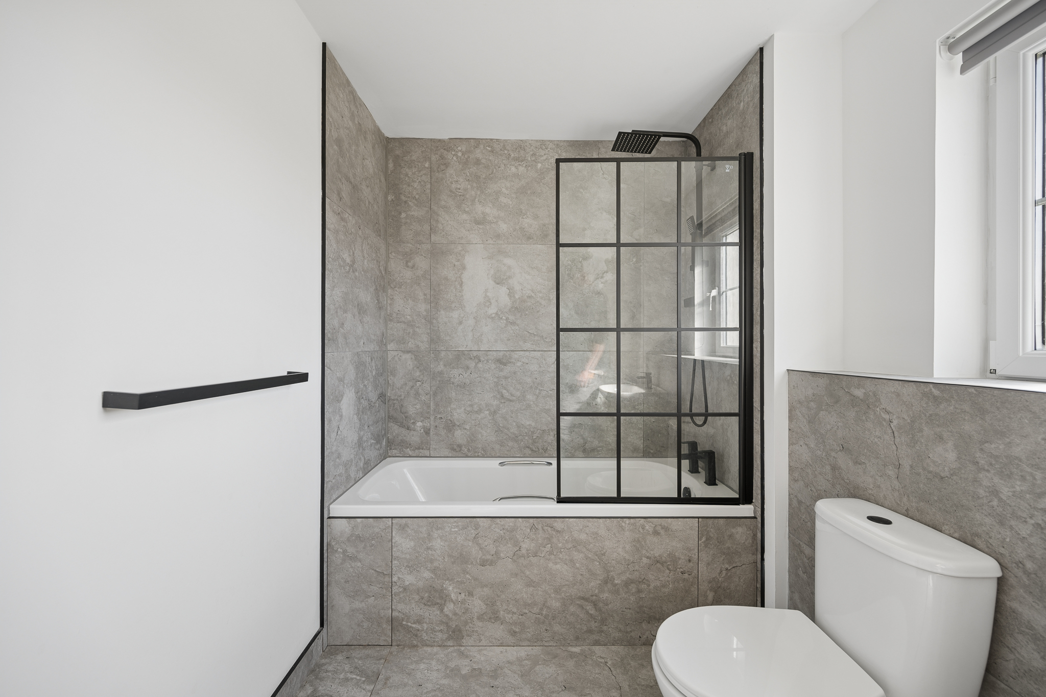 Completing the upper level is the family bathroom, finished in contemporary grey tones with full height tiling, a modern three piece suite and a sleek shower over bath with a black framed screen, creating a stylish and practical space. There is also a useful storage cupboard located above the stairs, adding further convenience.