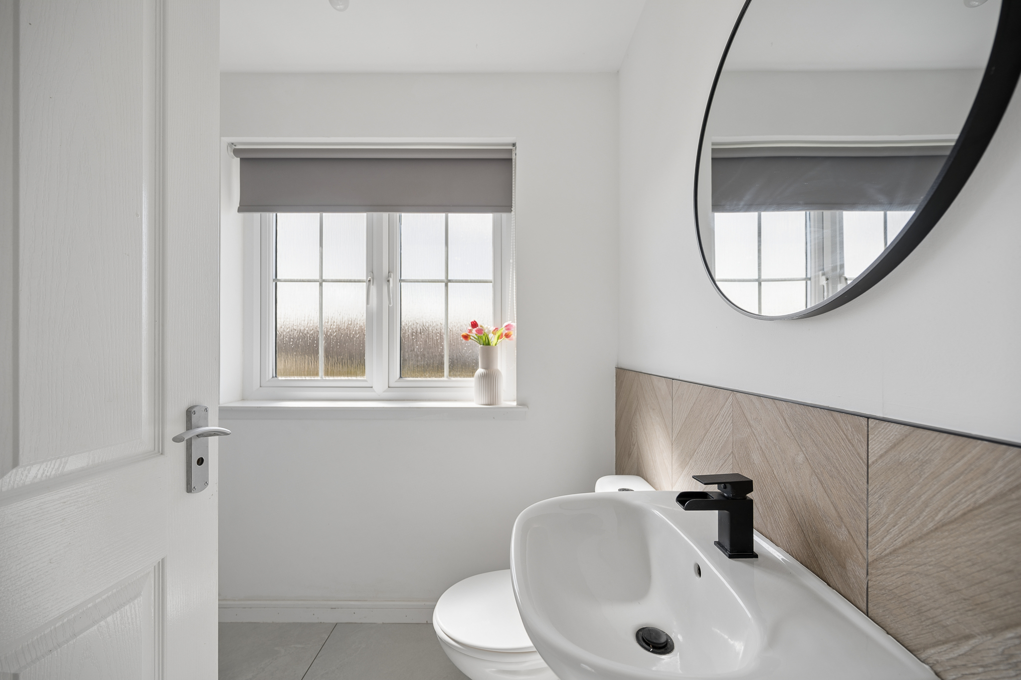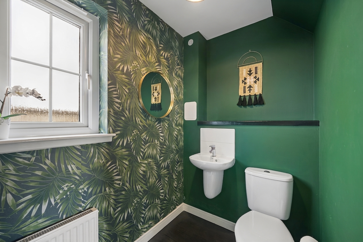 Completing the ground floor is a beautifully finished WC, with a stylish green colour palette and striking feature wallpaper with contemporary fittings, adding a real touch of personality to the home.
