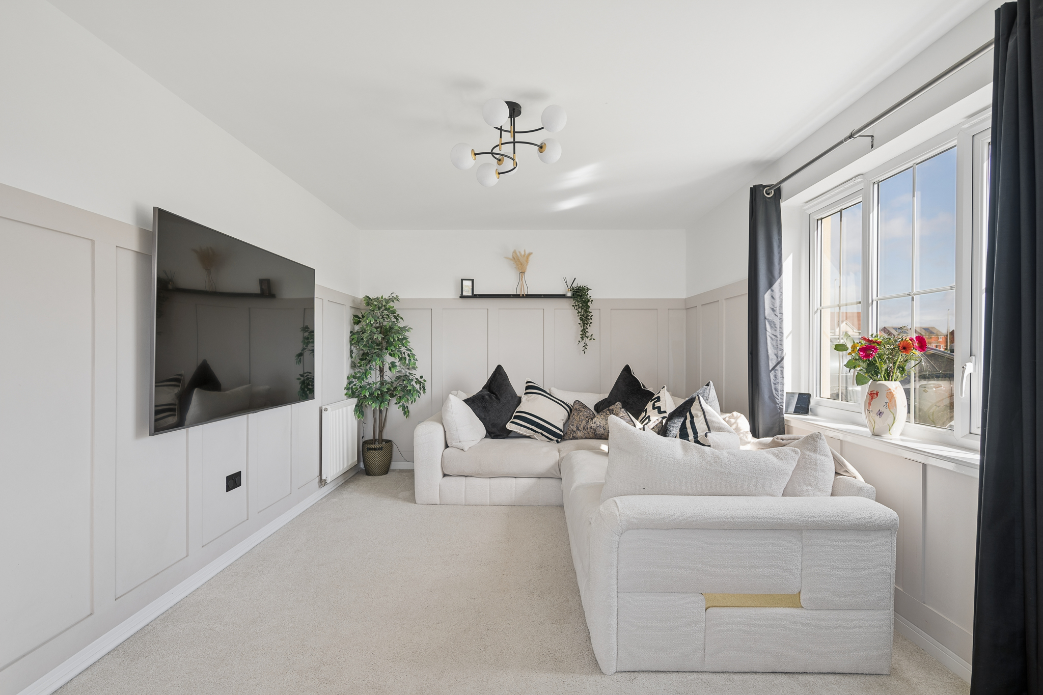 Positioned to the right hand side, the living room spans the full width of the property and is flooded with natural light thanks to its dual aspect windows. This is a beautifully styled space, with elegant wall panelling adding depth and character, while the soft neutral décor keeps the room feeling bright, calm and effortlessly inviting. It’s a perfect setting for both relaxing evenings and entertaining, with a real sense of warmth and comfort.
