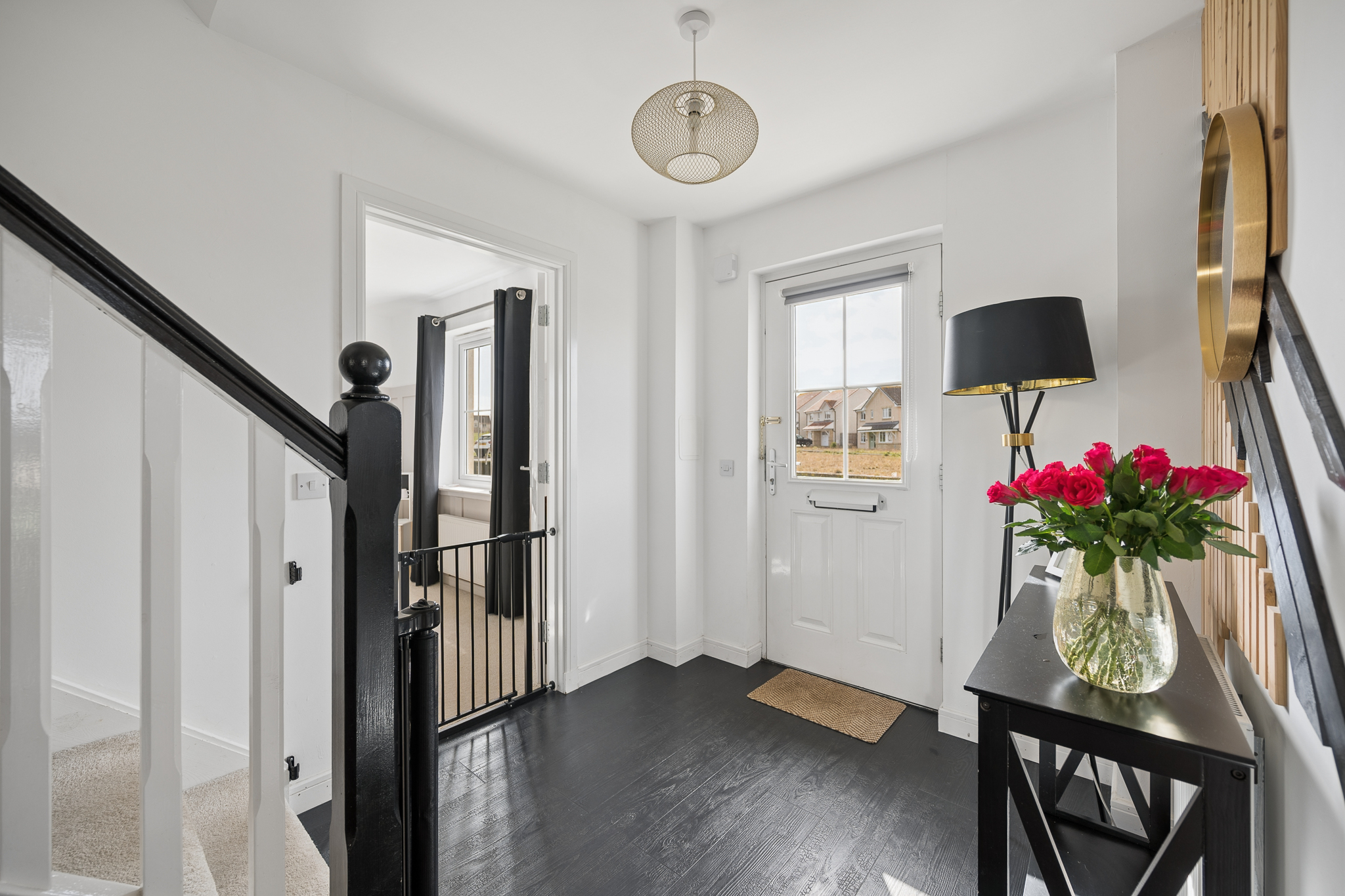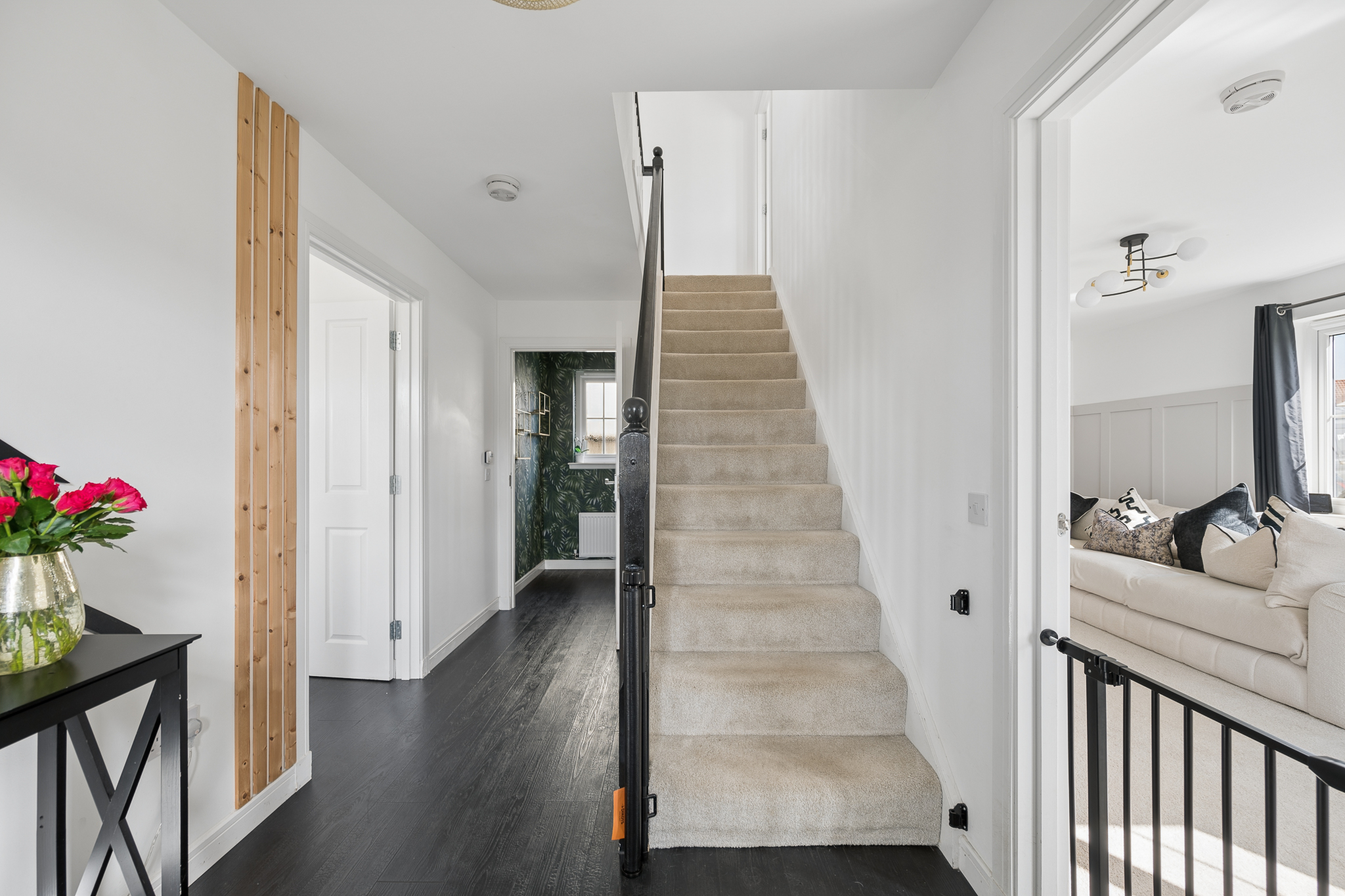 Stepping inside, you’re welcomed into a bright and inviting hallway where the attention to detail is immediately evident. A striking feature wall showcases a combination of warm wood tones and geometric panelling, perfectly complemented by the dark flooring underfoot and the contrast of the black accented staircase, creating a modern yet homely first impression. There is also a handy under stair storage cupboard, ideal for everyday practicality.