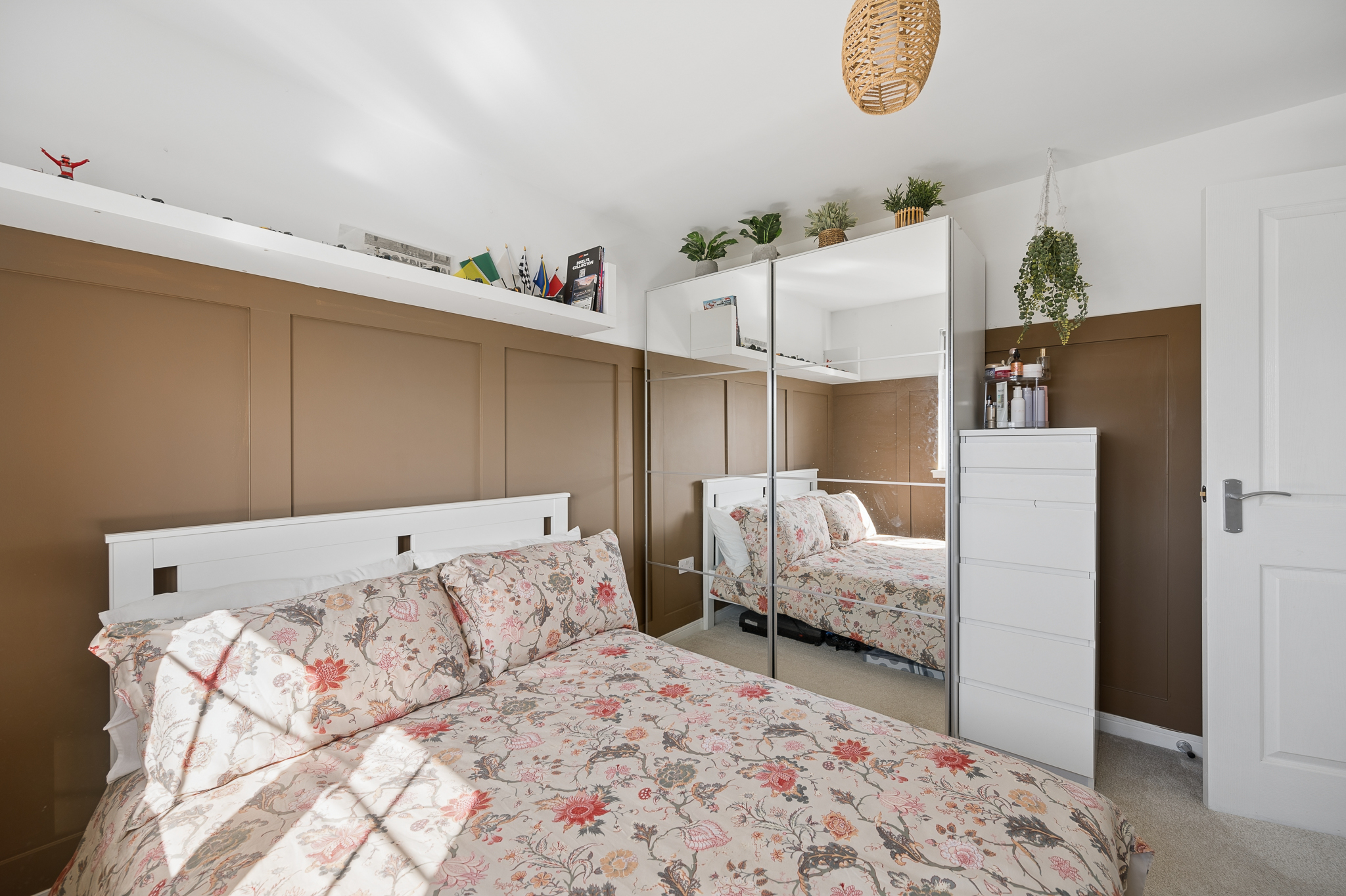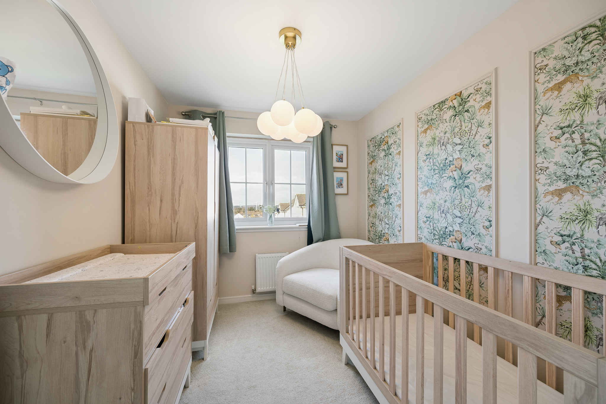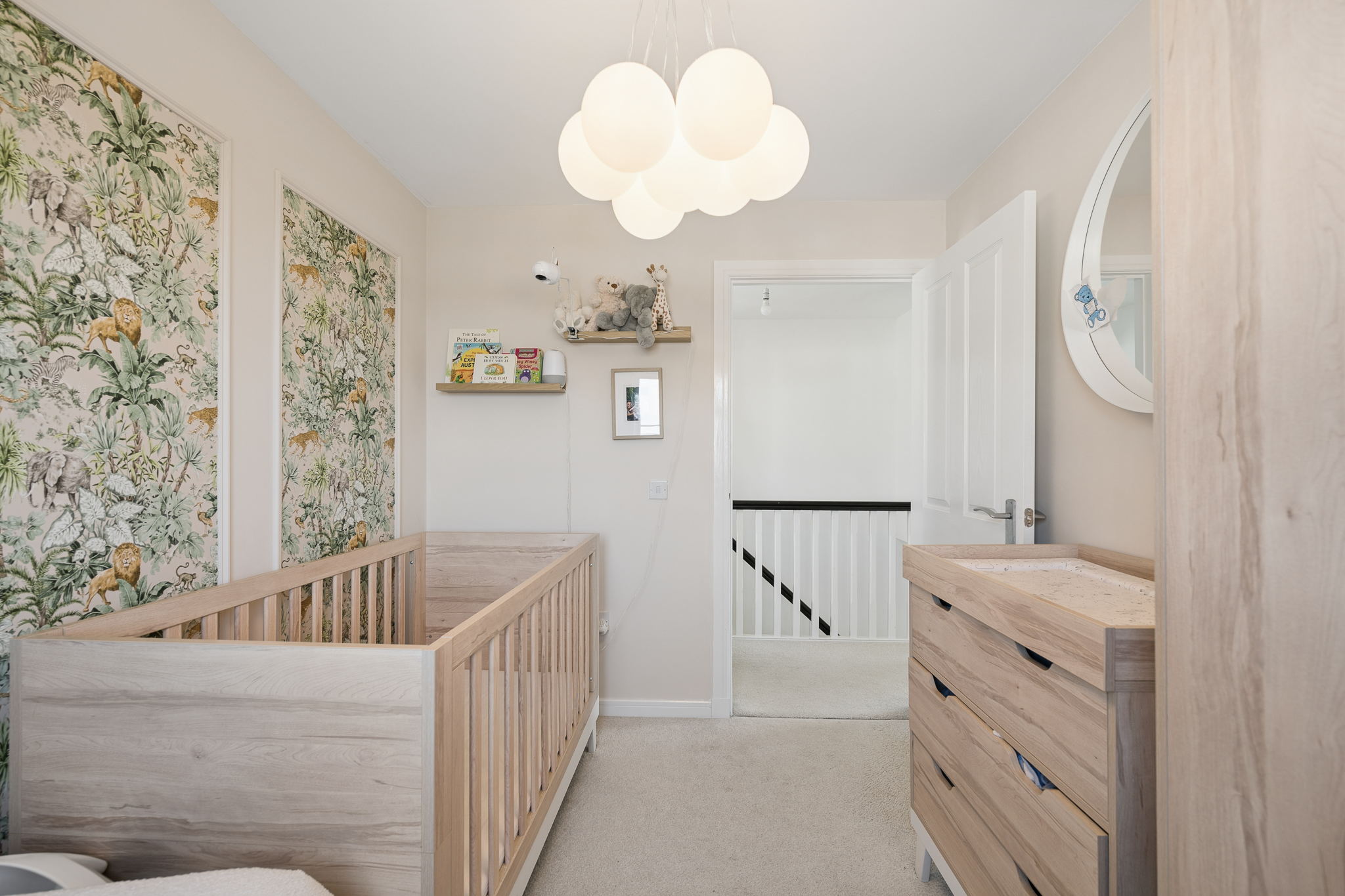 Across the hallway, bedroom three is currently utilised as a beautifully styled nursery, enjoying peaceful views over the rear garden and finished in a soft, calming palette. Adjacent to this, bedroom two is another well proportioned double room, also positioned to the rear, making it ideal for family living, guests or flexible use as a home office.