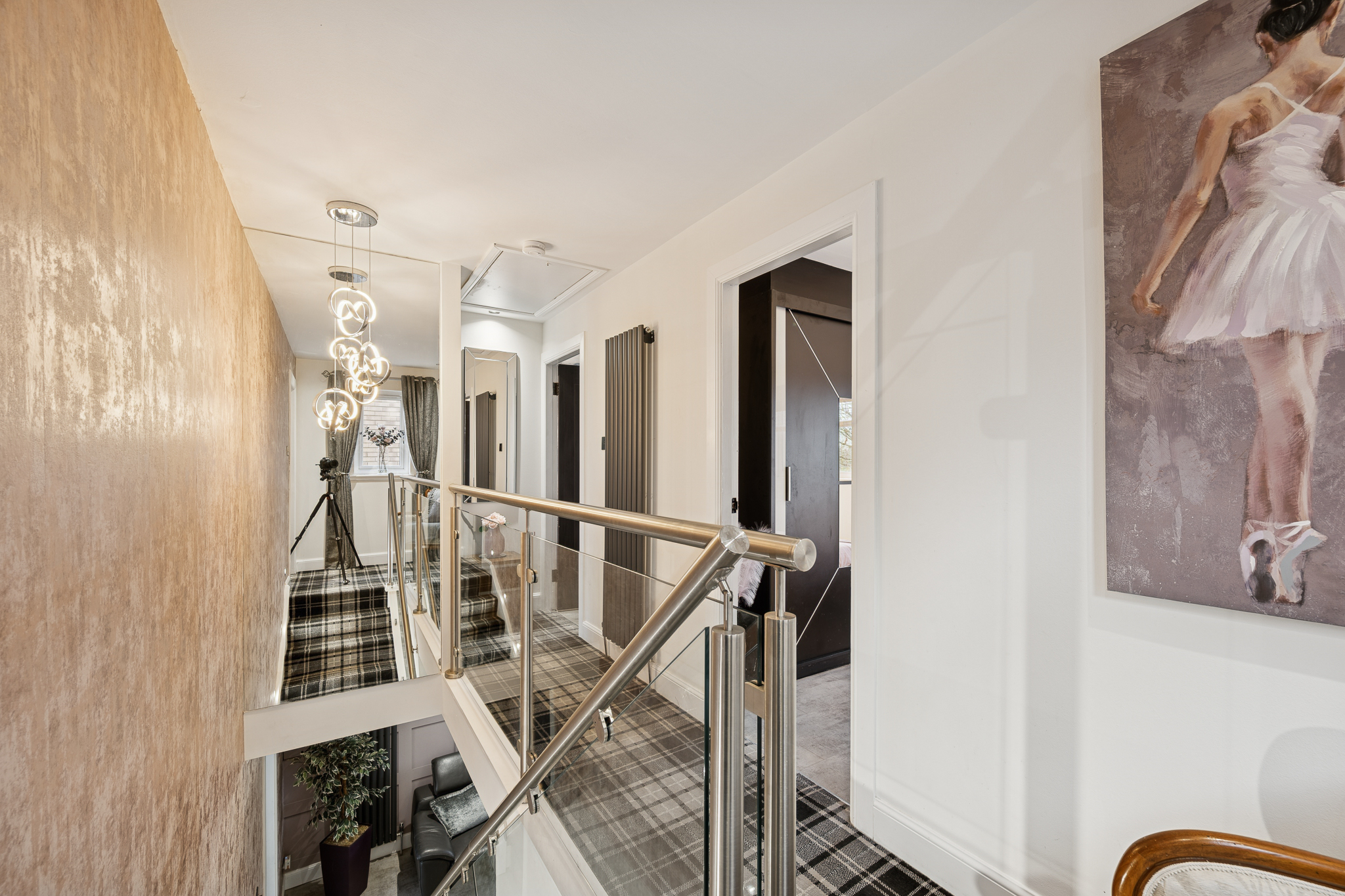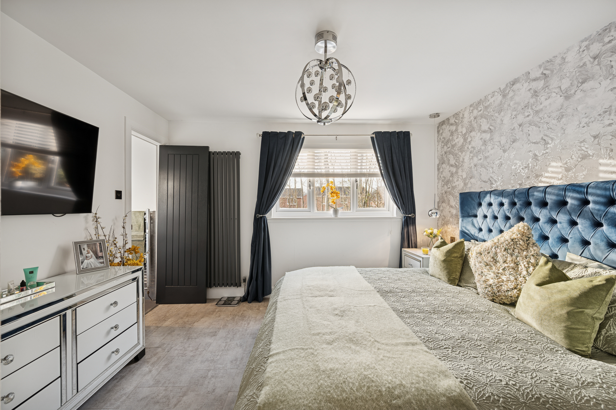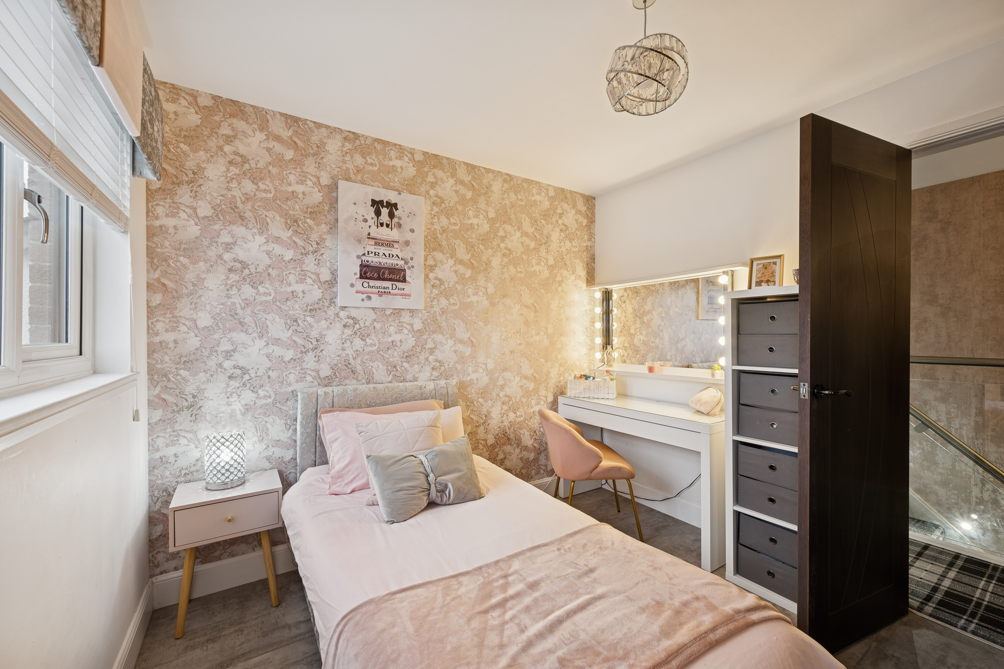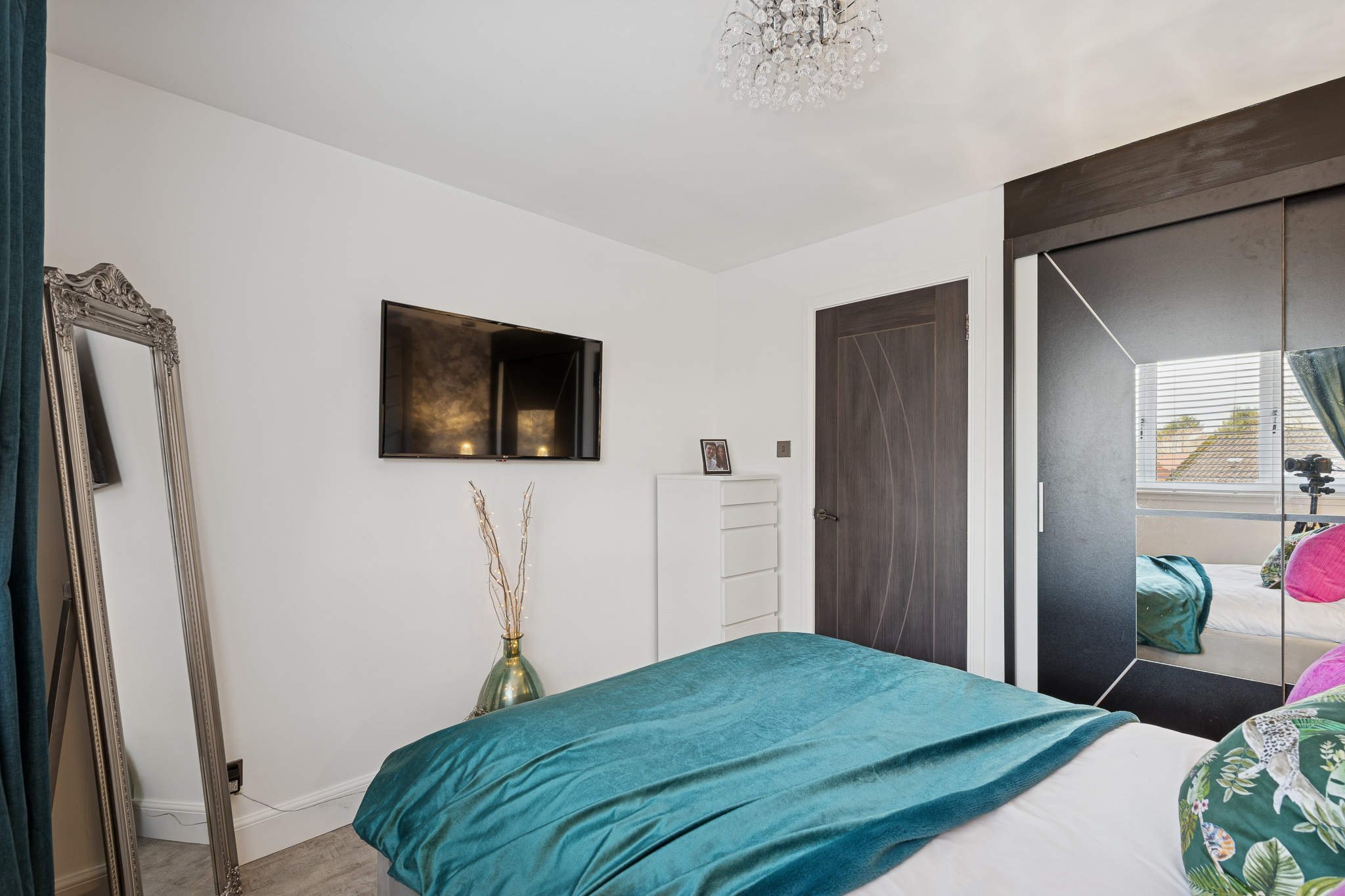 Ascending the staircase, your eye is drawn to a stunning feature light fitting, enhanced by a mirrored backdrop that amplifies the sense of space and luxury within the hallway. On the upper level, the family bathroom is finished to a high specification, boasting an exceptionally large shower and modern fittings. There are three further bedrooms on this floor, all comfortably accommodating double beds. The current layout includes a super king principal bedroom, a small double in bedroom two and a single bedroom, showcasing the flexibility of the accommodation. All bedrooms benefit from sleek, modern fitted wardrobes, while the principal bedroom is further enhanced by its own stylish en-suite.