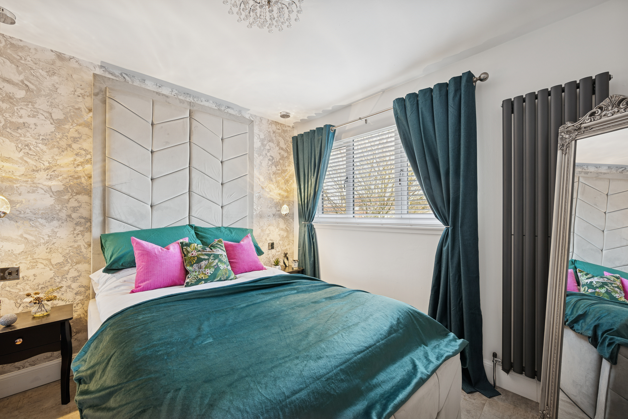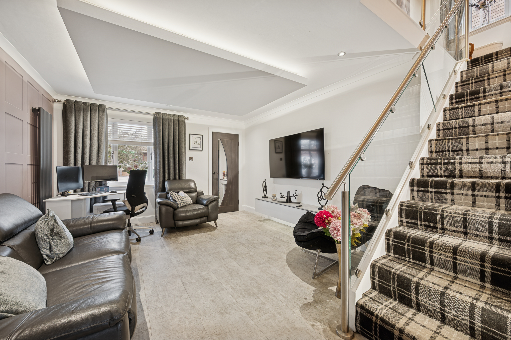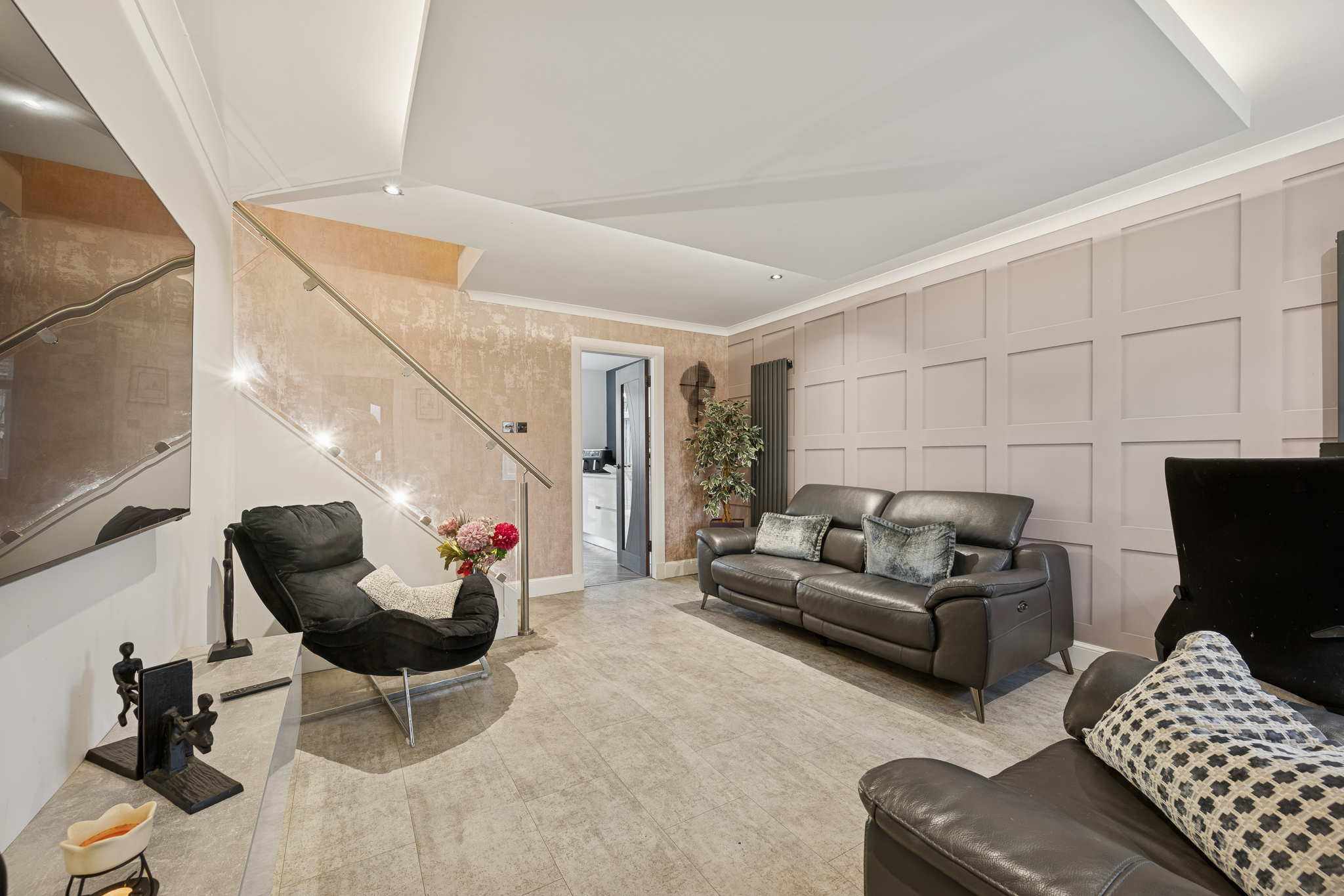 Ascending the staircase, your eye is drawn to a stunning feature light fitting, enhanced by a mirrored backdrop that amplifies the sense of space and luxury within the hallway. On the upper level, the family bathroom is finished to a high specification, boasting an exceptionally large shower and modern fittings. There are three further bedrooms on this floor, all comfortably accommodating double beds. The current layout includes a super king principal bedroom, a small double in bedroom two and a single bedroom, showcasing the flexibility of the accommodation. All bedrooms benefit from sleek, modern fitted wardrobes, while the principal bedroom is further enhanced by its own stylish en-suite.