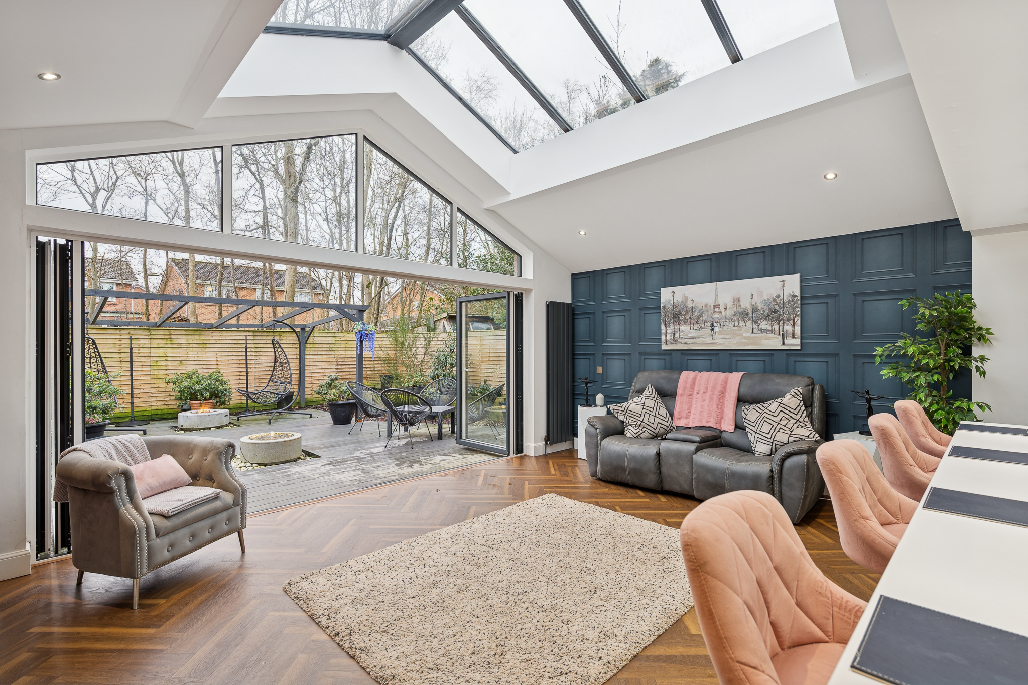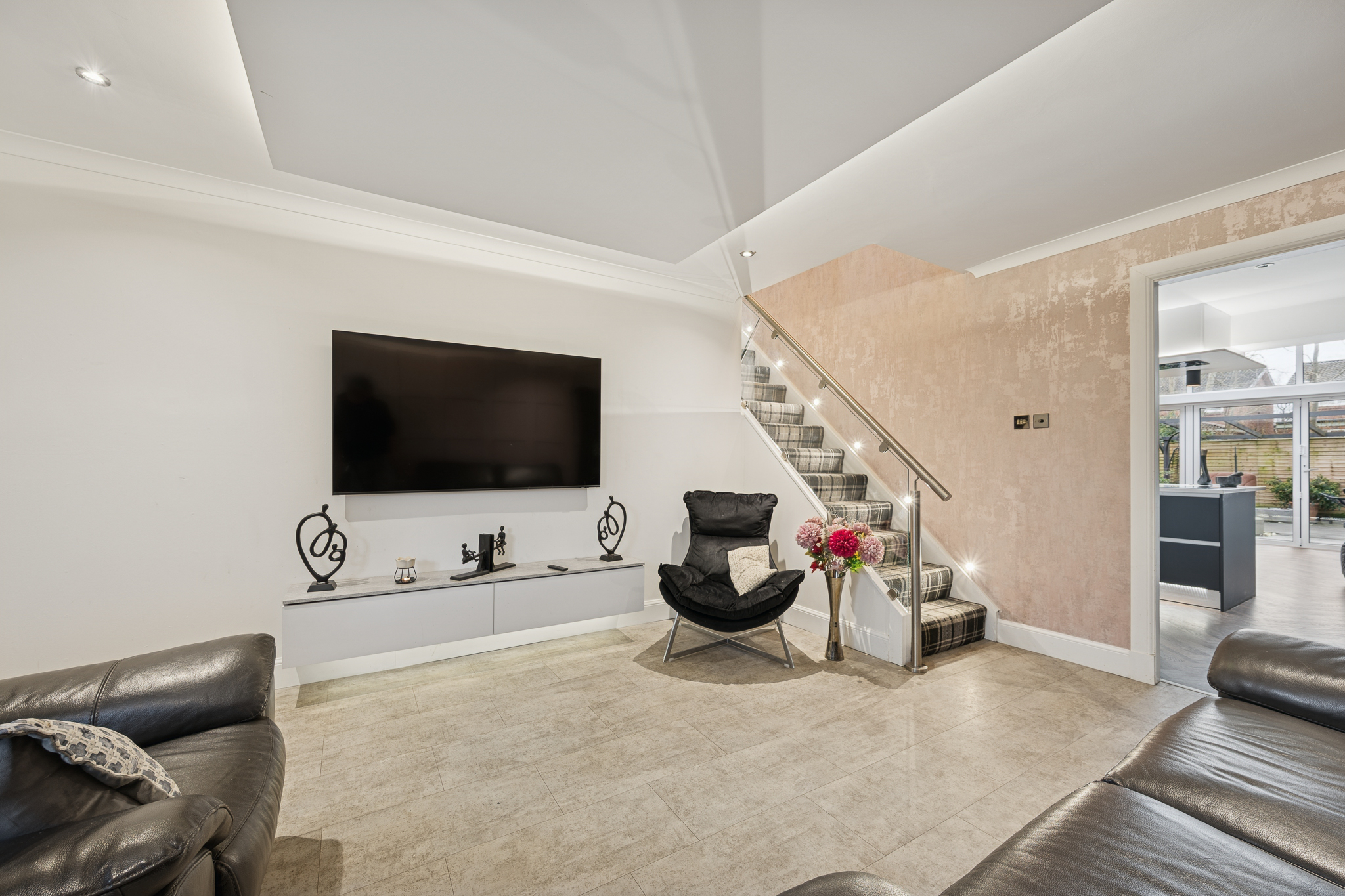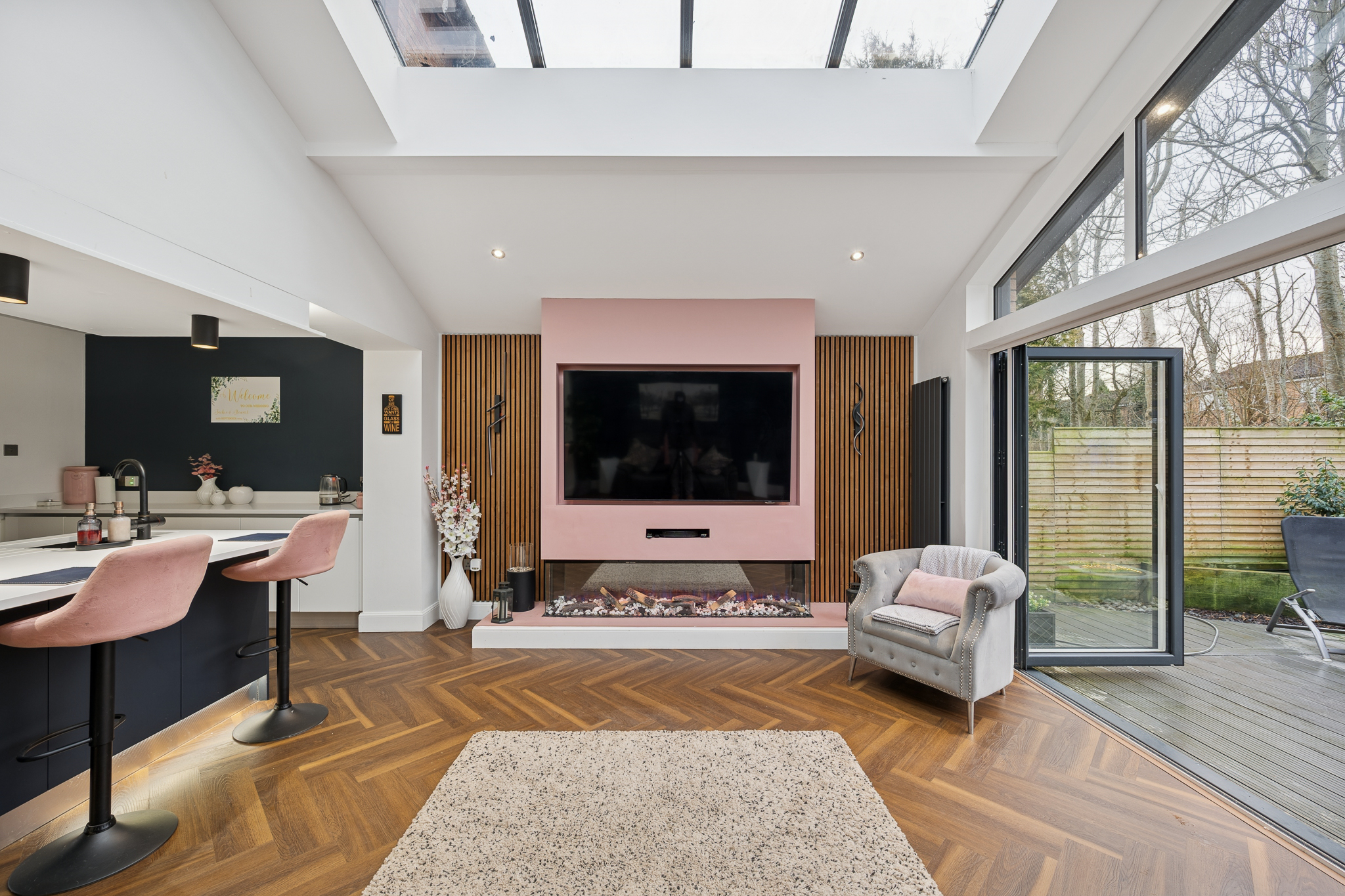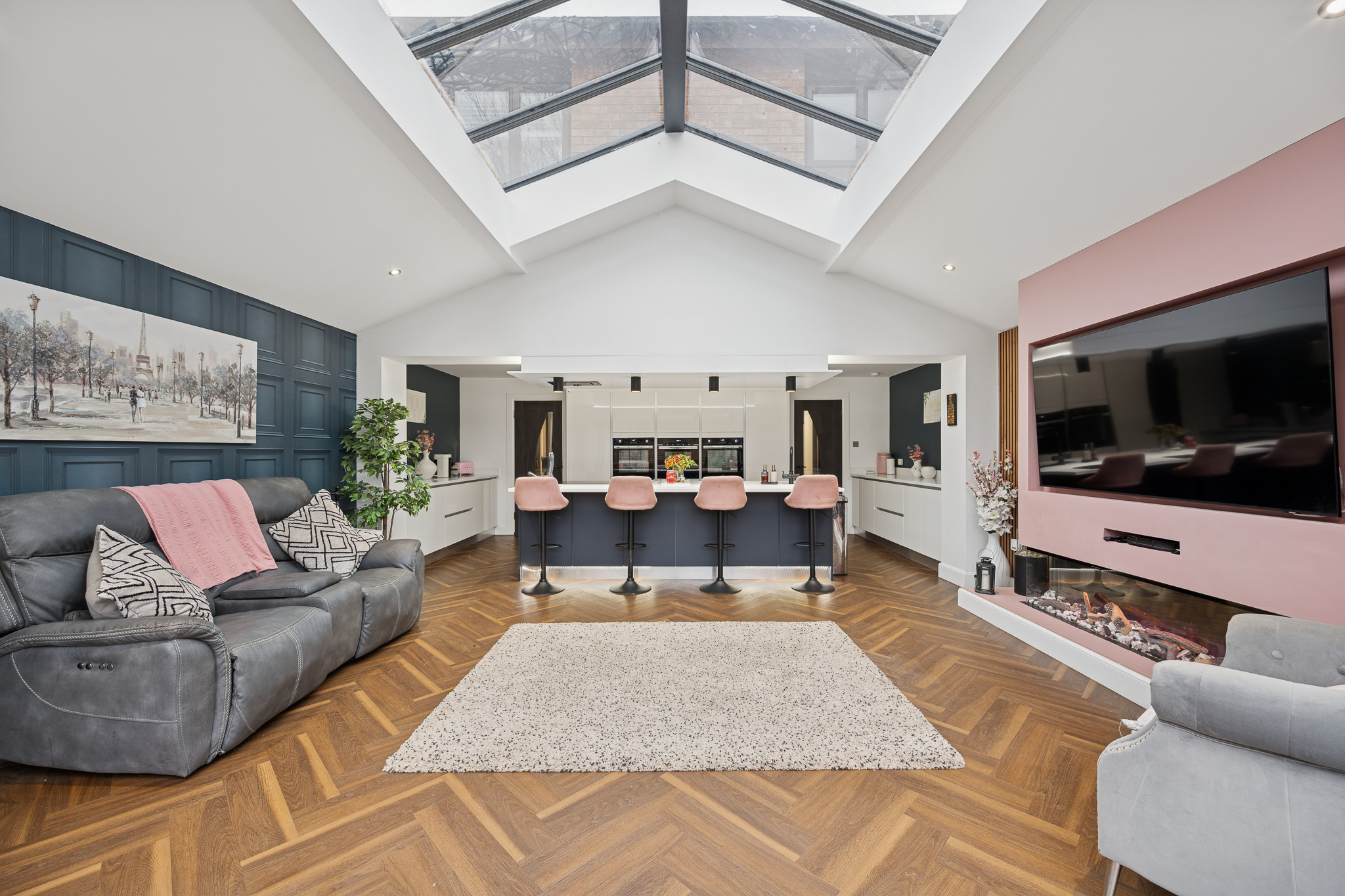 Moving through to the rear, you reach what is undoubtedly the heart of the property, an impressive extension completed to an extremely high standard. This expansive open plan space has been designed with both everyday living and entertaining in mind. The kitchen is generous and stylish, centred around a large island with seating for bar stools, perfect for casual dining, socialising or family life. Alongside this, a grand media wall anchors a second relaxed seating area, offering a wonderful sense of luxury within the space.