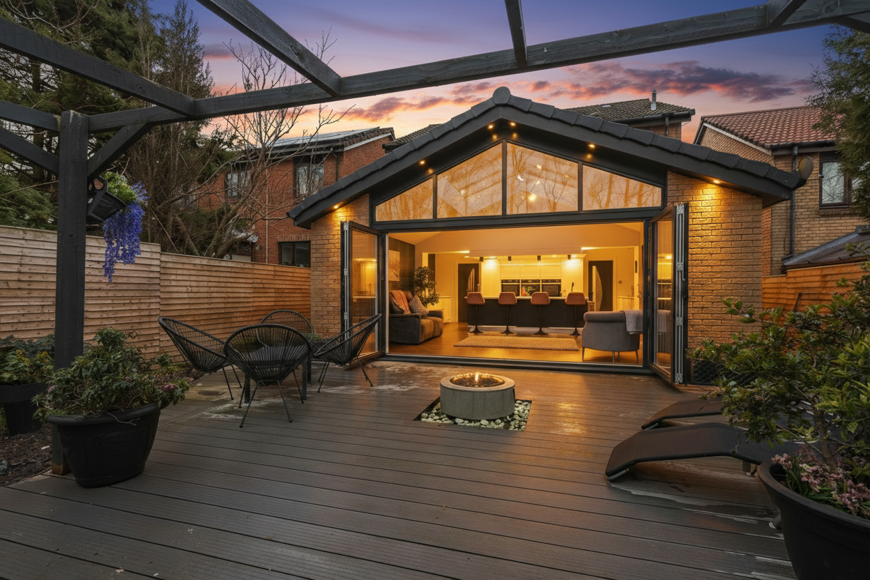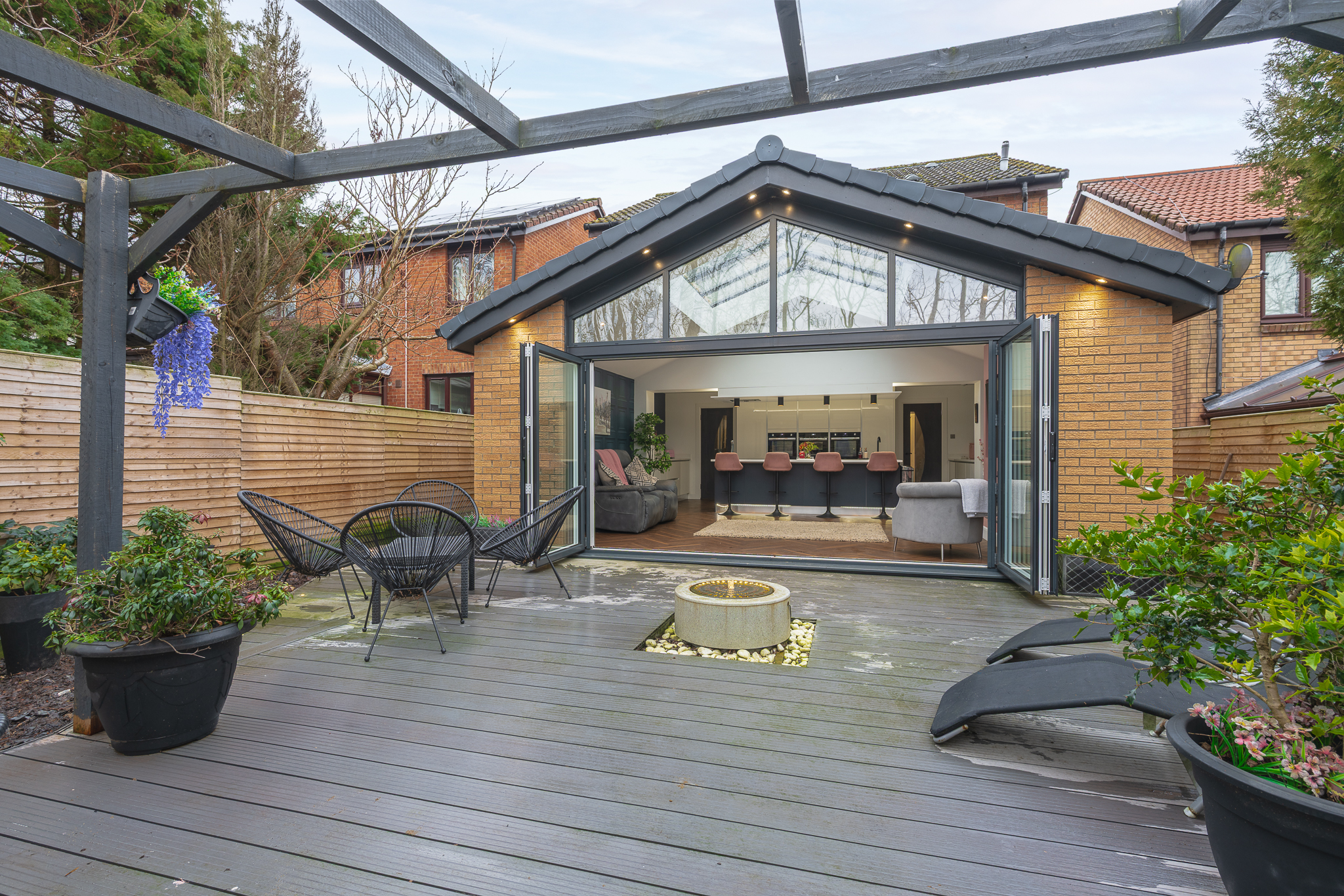 Bi fold doors open directly onto the south west facing rear garden, seamlessly connecting indoors and outdoors. The garden itself has been designed for low maintenance while still delivering impact, featuring a water feature, an electric fire pit and integrated lighting throughout, creating an exceptional setting for evenings, entertaining and hosting all year round.