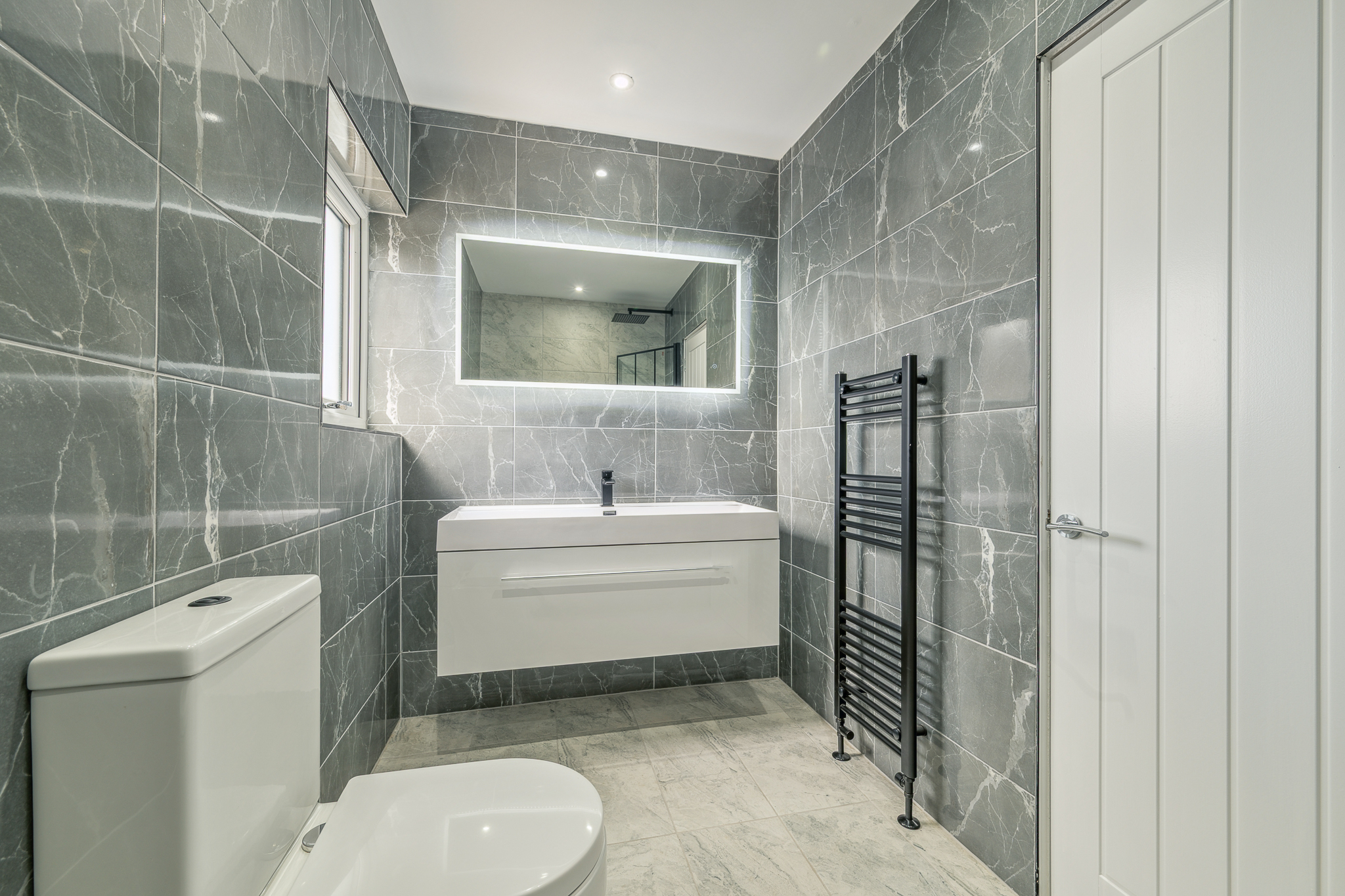 Upstairs, two spacious double bedrooms are tastefully decorated with crisp white walls and plush grey carpets, providing a soft and contemporary touch. The family bathroom is a standout feature, fully tiled with sleek grey glossy marble tiles. It includes an extra-large sink and a large bath with an overhead shower. Black accents, including a heated towel rail, add a touch of sophistication to the space.​