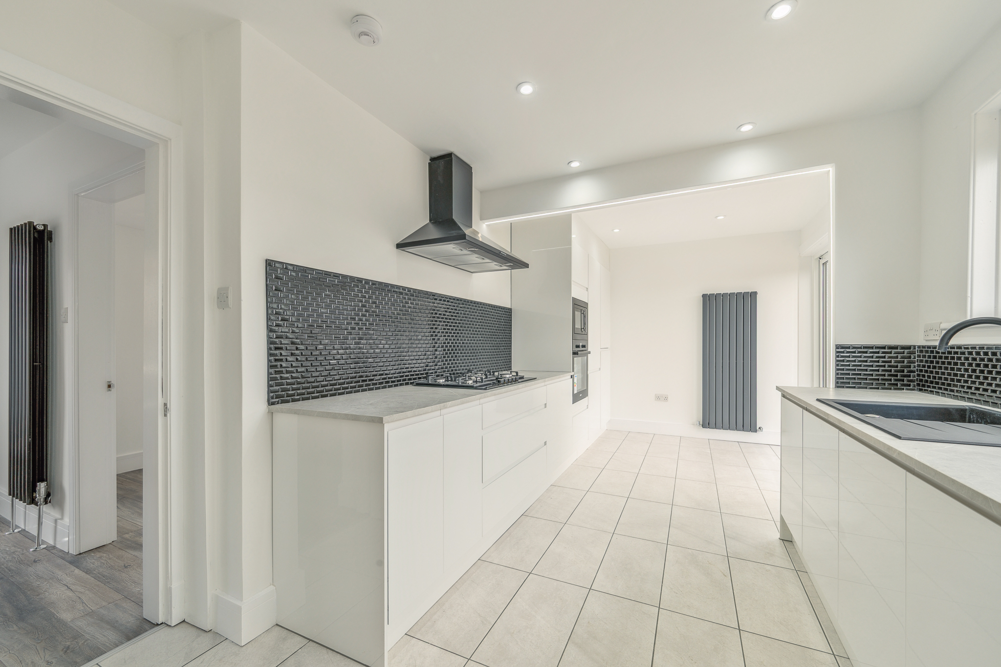 To the rear, the modern kitchen boasts white handleless cabinetry paired with light grey marble-effect countertops. A black mini tile-effect splashback complements the design , creating a stylish monochrome aesthetic, while integrated appliances include an oven, microwave, fridge-freezer, and a five-ring gas hob. A large matte black overhead extractor adds a striking focal point and ensures efficient ventilation. A sleek grey vertical radiator enhances the modern feel, and the white floor tiling contributes to the bright and airy atmosphere. Patio sliding doors lead directly from the kitchen to the new decking area in the west-facing garden, perfect for enjoying afternoon and evening sun.​