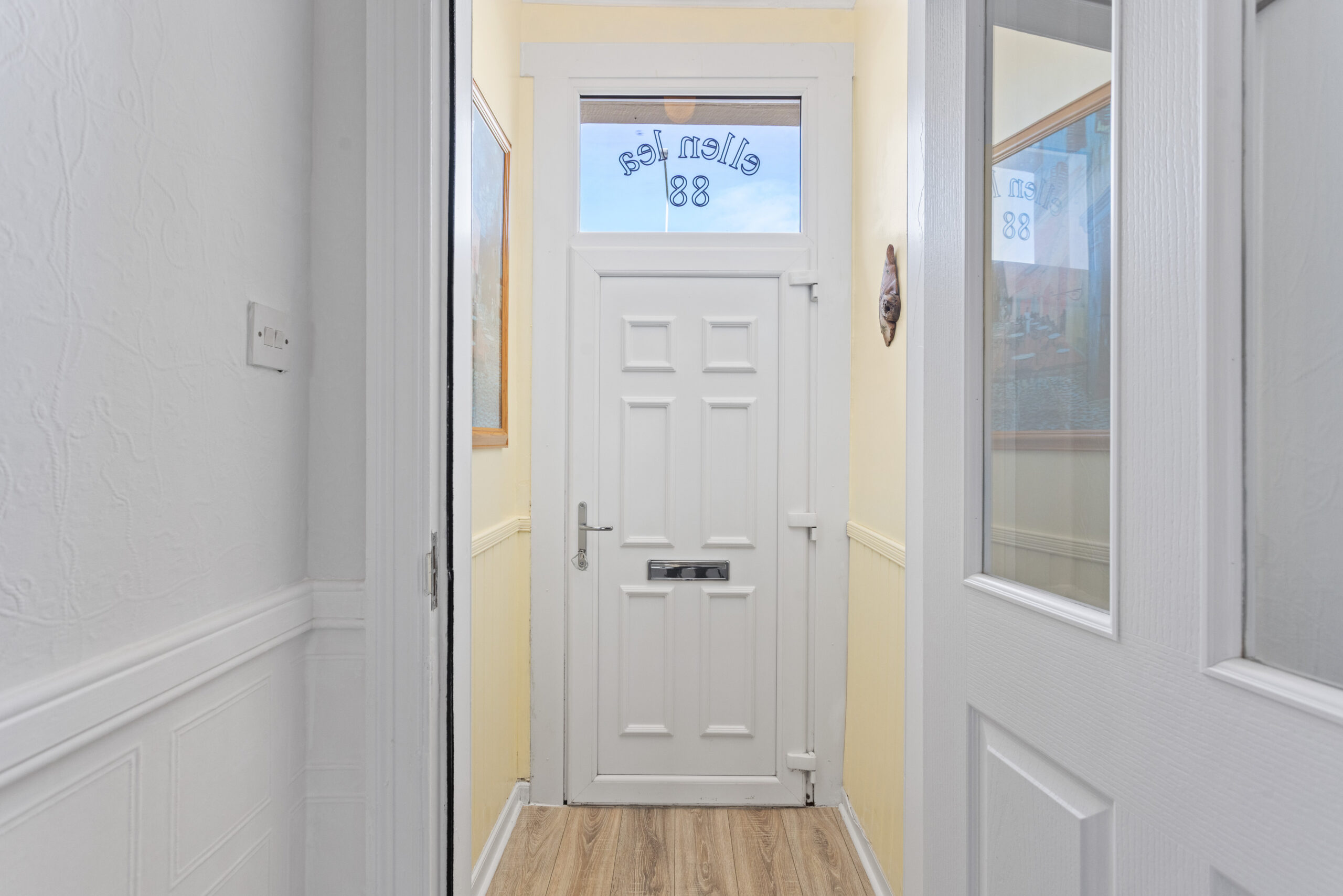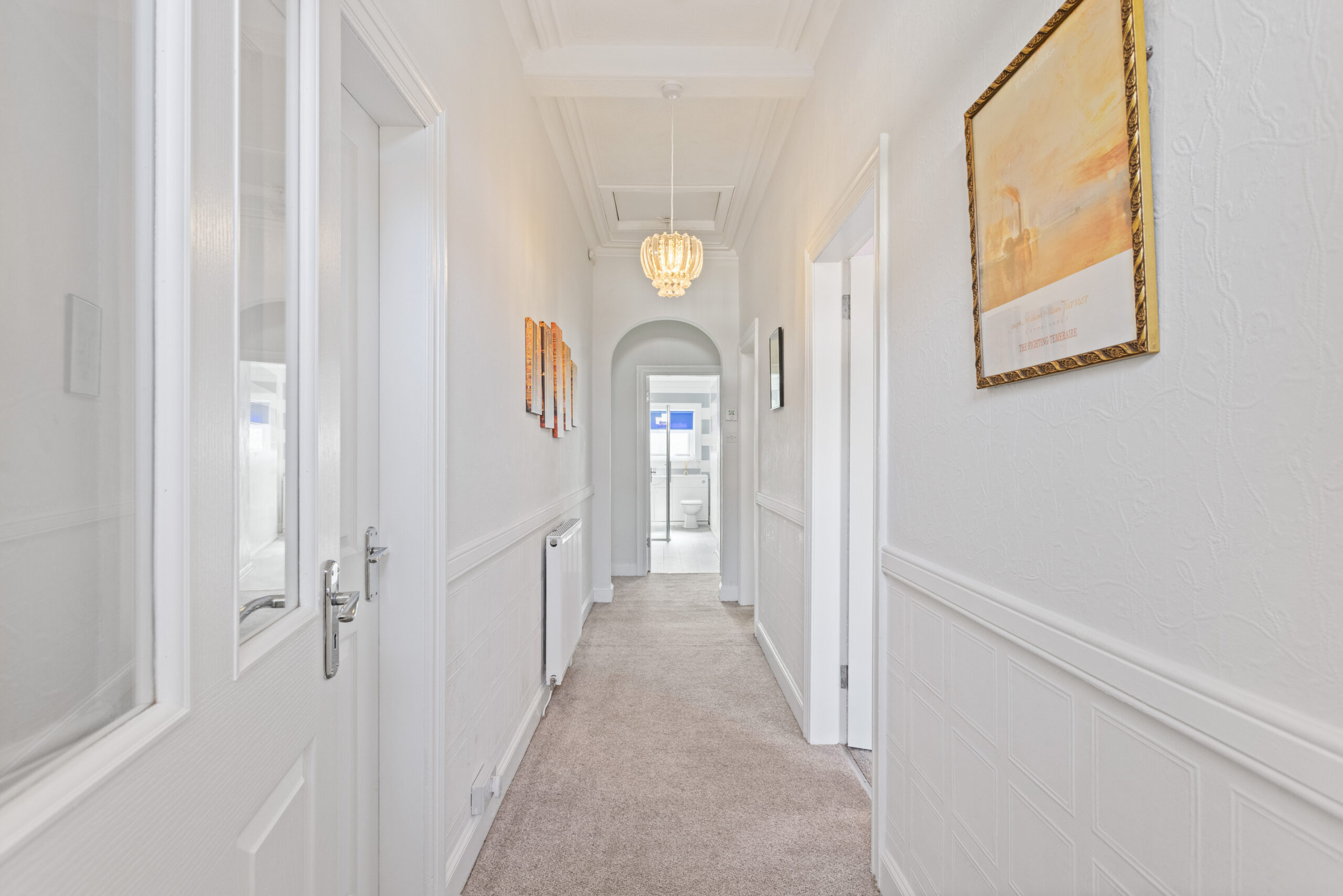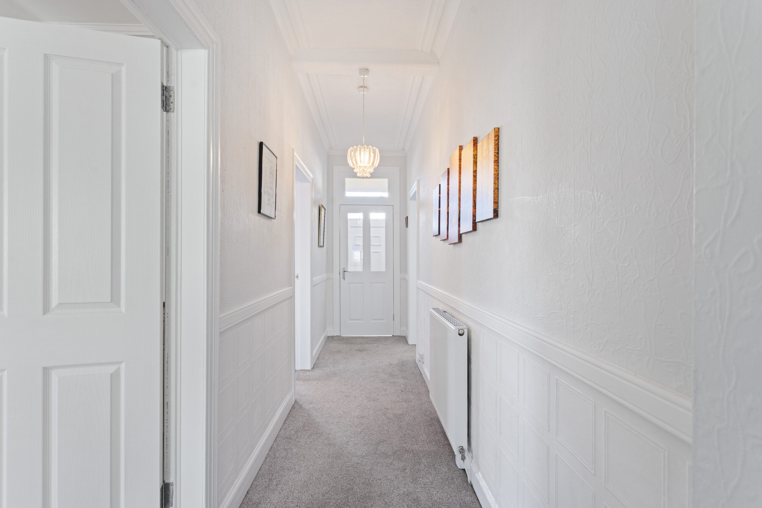 Upon entering the property, you are welcomed into a practical entrance porch, finished with modern wood-effect flooring and neutral tones, ideal for everyday storage before stepping through into the main hallway. The hallway itself is bright and inviting, with soft carpeting underfoot, and charming architectural features including a subtle archway that adds to the home’s character.