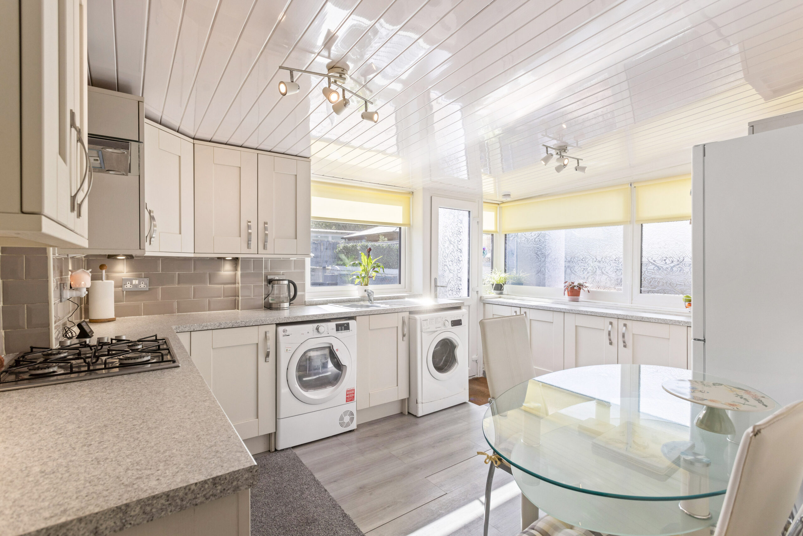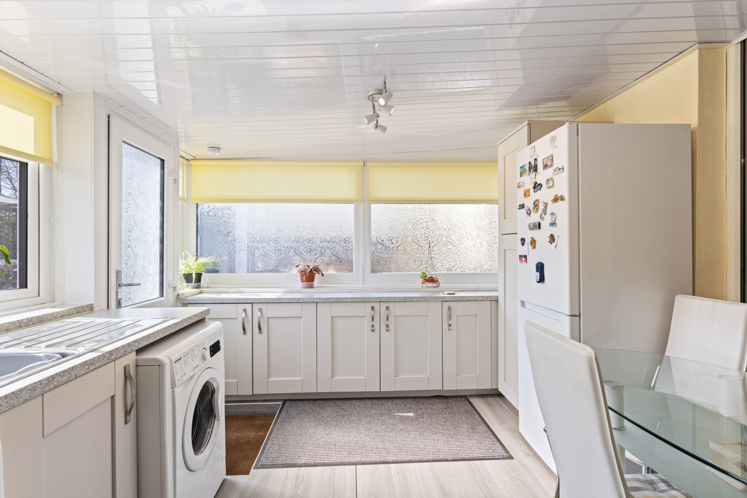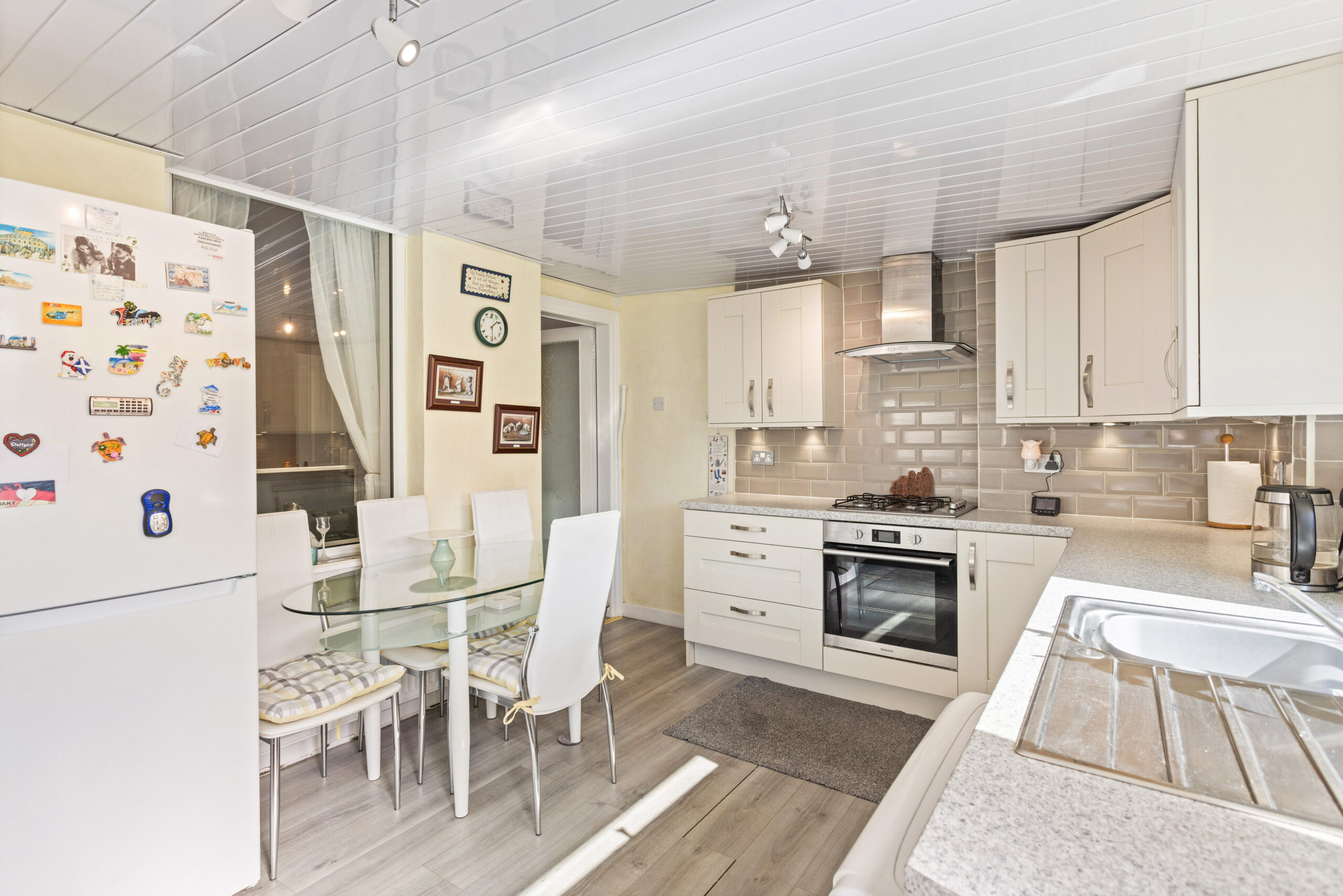 From the lounge, you step through into the extended kitchen, undoubtedly one of the standout features of the home. This bright and airy space benefits from windows on two elevations, allowing natural light to pour in throughout the day. The kitchen is fitted with a range of modern shaker style cabinets in a light finish, paired with contrasting worktops that provide ample preparation space. The flooring is both stylish and practical, while the layout comfortably accommodates a dining area, making it ideal for everyday living. The overall feel is fresh, contemporary, and perfectly in keeping with the home’s character.