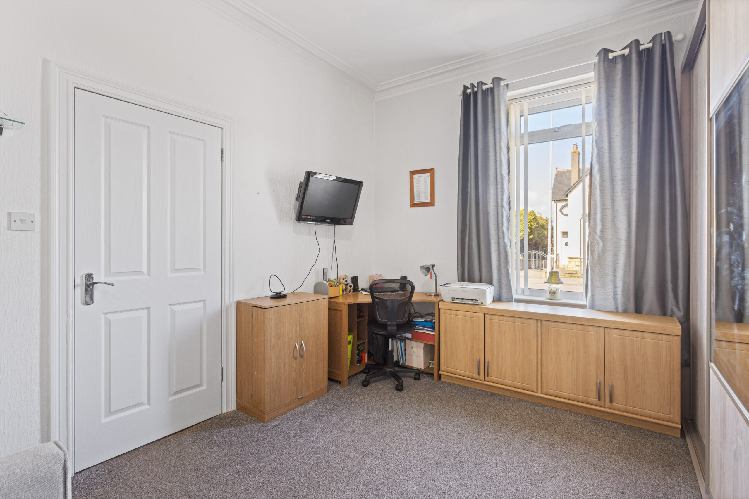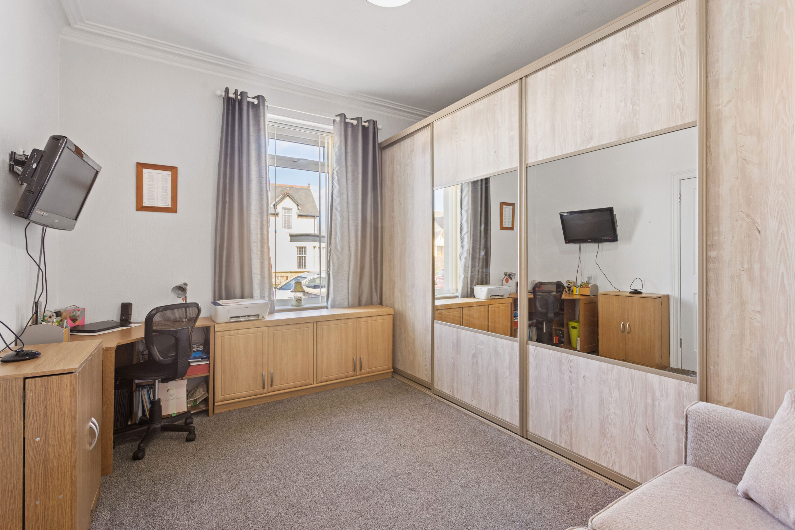 To the left, Bedroom Two is a well proportioned room overlooking the front of the property, complete with fitted wardrobes offering excellent storage. The room is presented in soft, neutral décor with grey carpeting, creating a comfortable and versatile space, ideal as a guest room, home office or second bedroom.