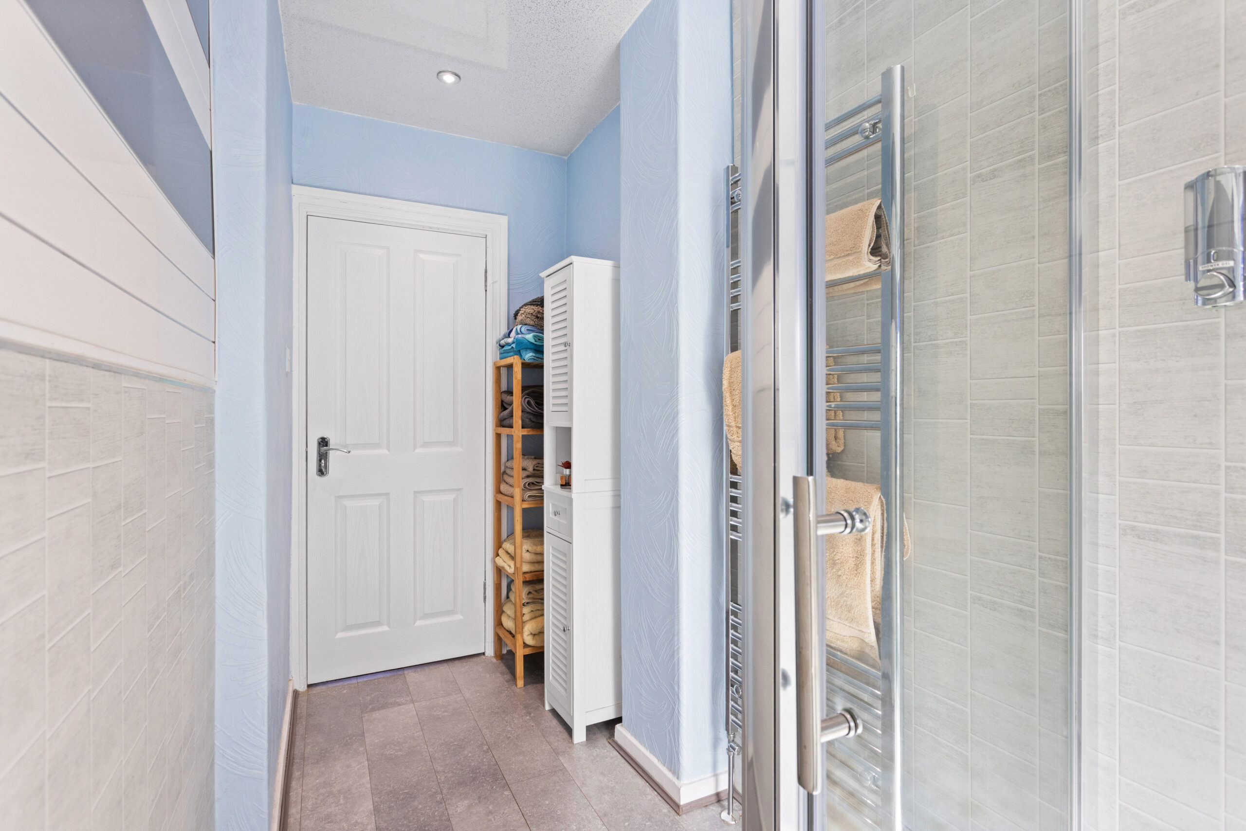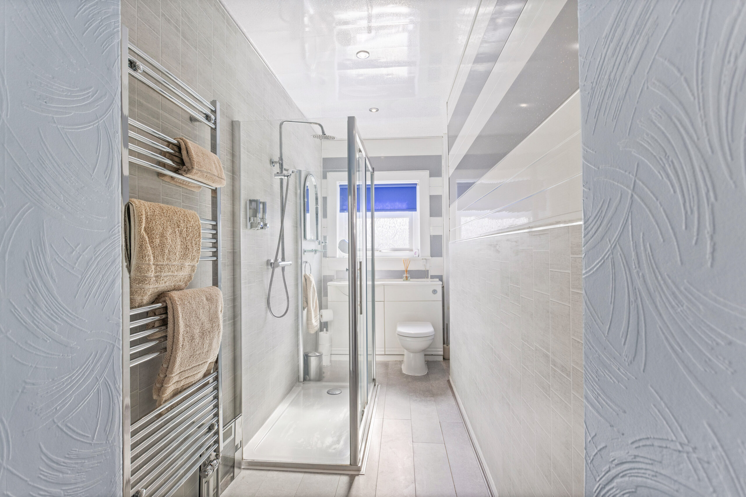 Continuing along the hallway, you are met with the impressive family bathroom. This is a notably large and elongated space, finished to a high standard with contemporary tiling throughout. It features a sleek walk in shower with glass enclosure, WC and vanity unit with integrated storage. A heated towel rail adds a touch of luxury, while the layout provides excellent practicality with additional space for freestanding storage solutions.