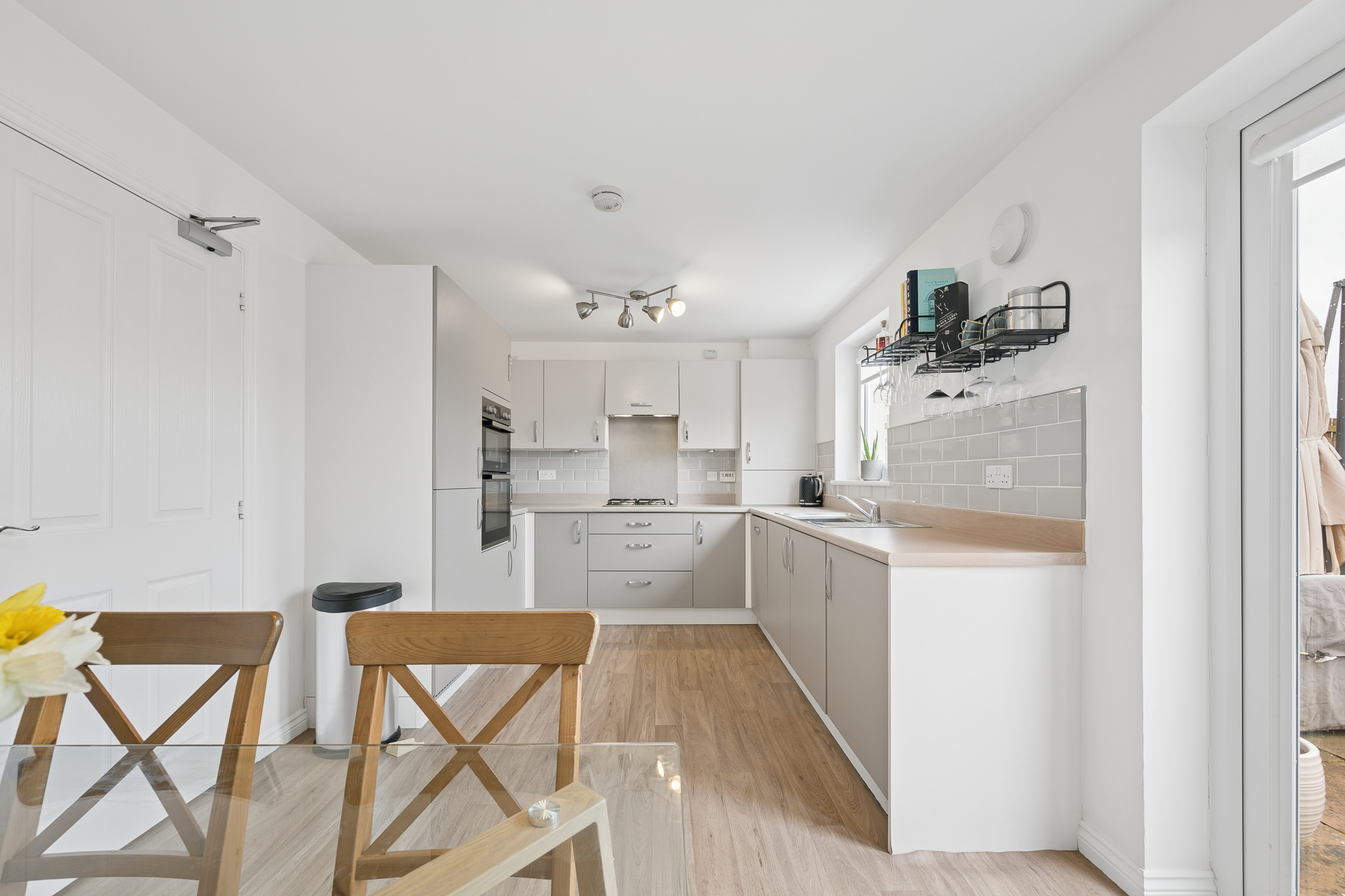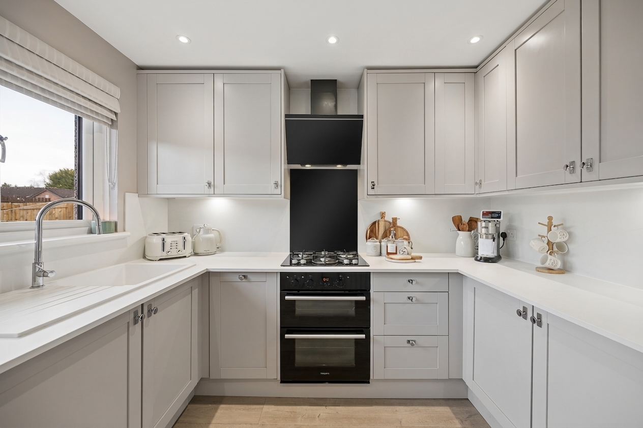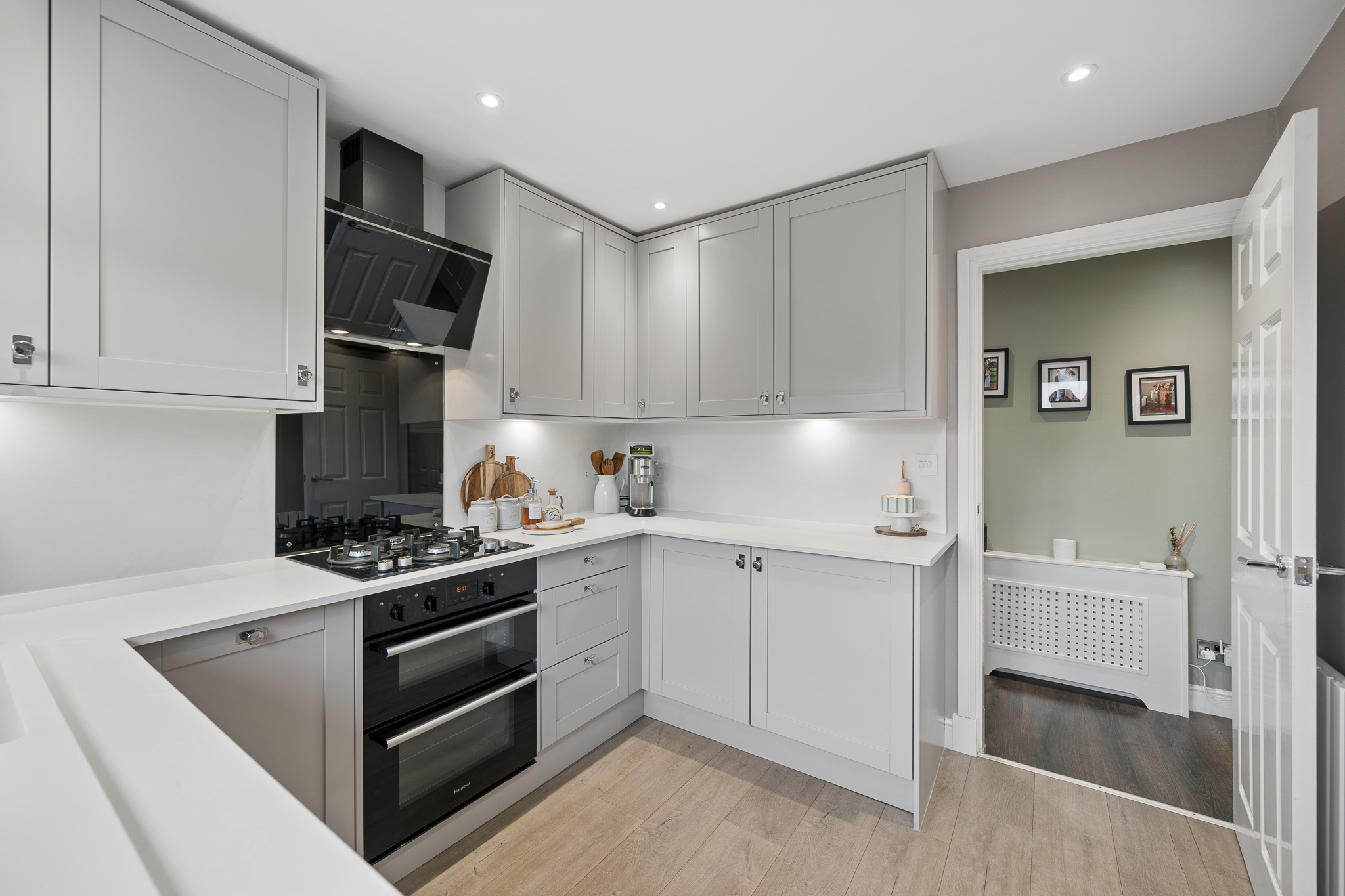 Continuing along the hallway and around the corner, you are welcomed into the beautifully renovated kitchen. Designed in a timeless shaker style, the soft neutral cabinetry pairs effortlessly with crisp white worktops and splashback to create a bright and elegant cooking space. Integrated appliances include a gas hob with a striking black extractor hood and double oven below, while the sink is perfectly positioned beneath a large window overlooking the garden, allowing natural light to flood the room. Under cabinet lighting adds both practicality and warmth, and the generous worktop space ensures this kitchen is as functional as it is stylish. A door from here leads directly out to the rear garden.