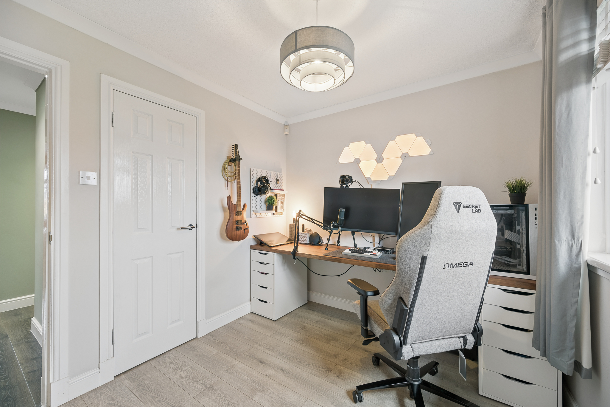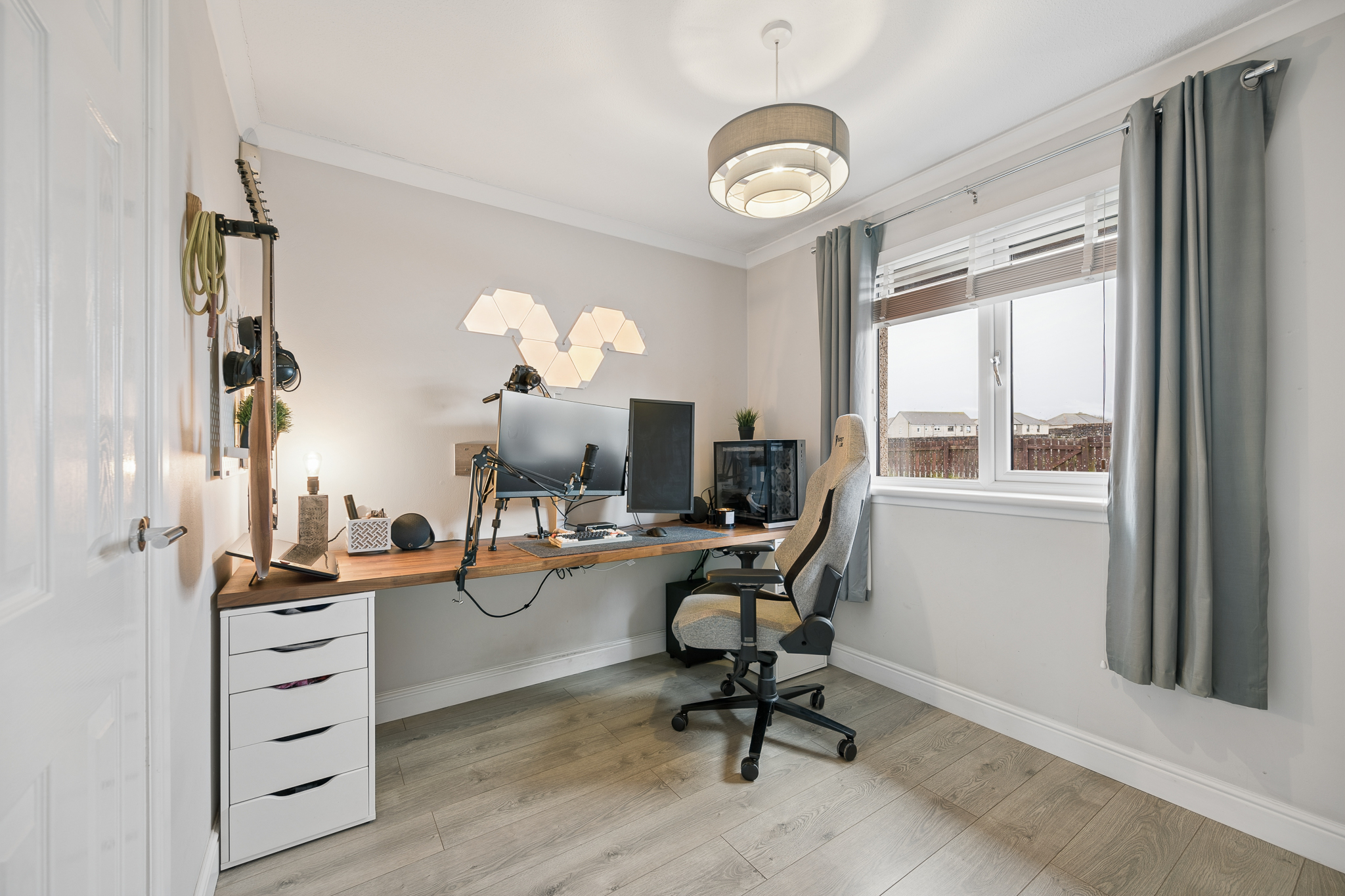 Completing the internal accommodation is Bedroom Three, currently utilised as a stylish home office. Perfect for modern living and remote working, this room offers ample space for a full desk setup and also benefits from a built-in cupboard for additional storage.