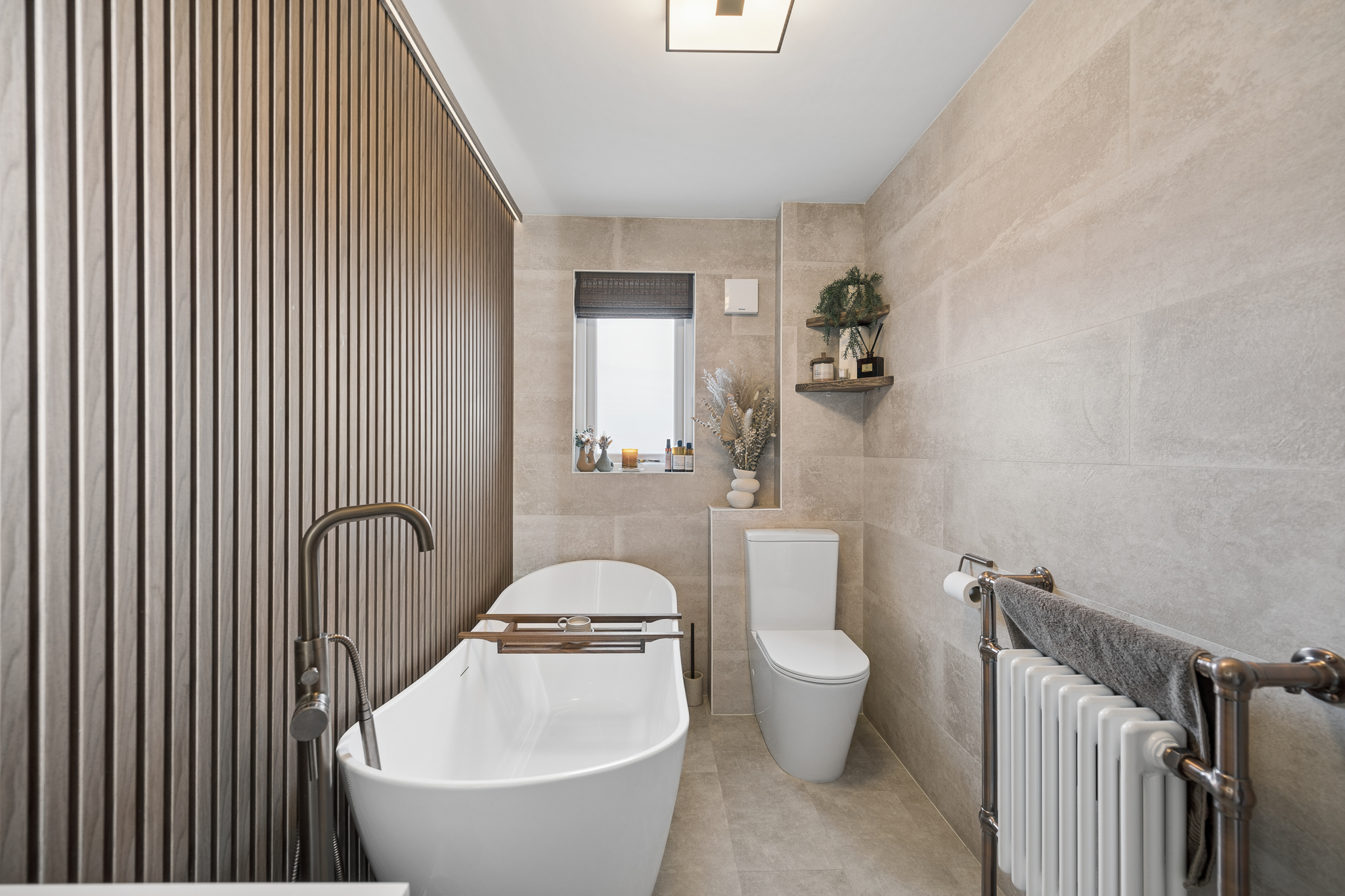 Adjacent to the kitchen is undoubtedly one of the standout features of the home the luxurious spa inspired family bathroom. Beautifully finished with warm stone effect tiling, this stunning space centres around a statement freestanding bath, complemented by elegant copper and brass toned taps and a matching handheld shower. Behind the bath, striking acoustic wooden panelling adds both texture and warmth, while soft ambient uplighting enhances the calming, spa-like atmosphere. A contemporary vanity unit, WC and carefully styled shelving complete the room, creating a tranquil retreat that feels more like a boutique hotel than a typical family bathroom.