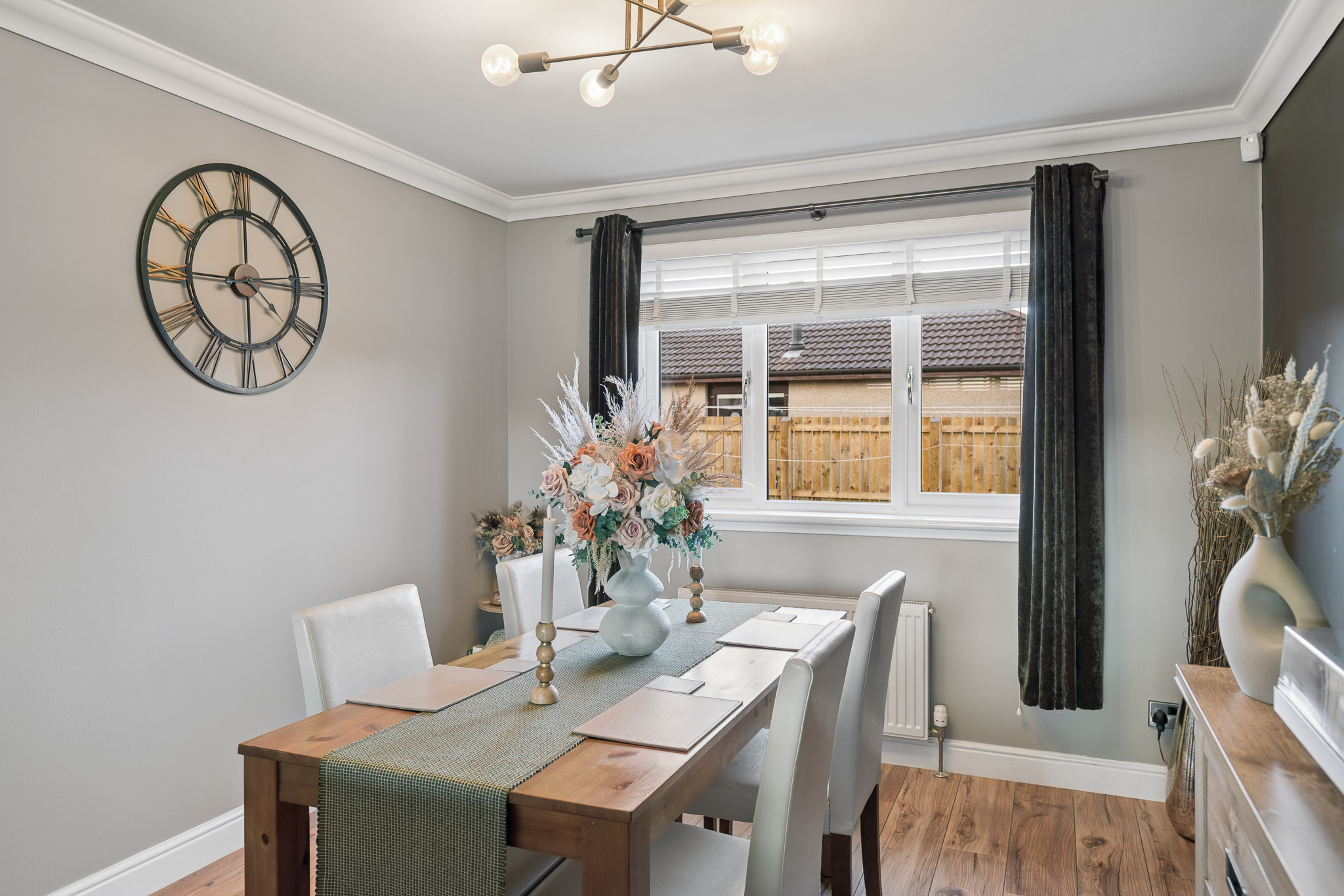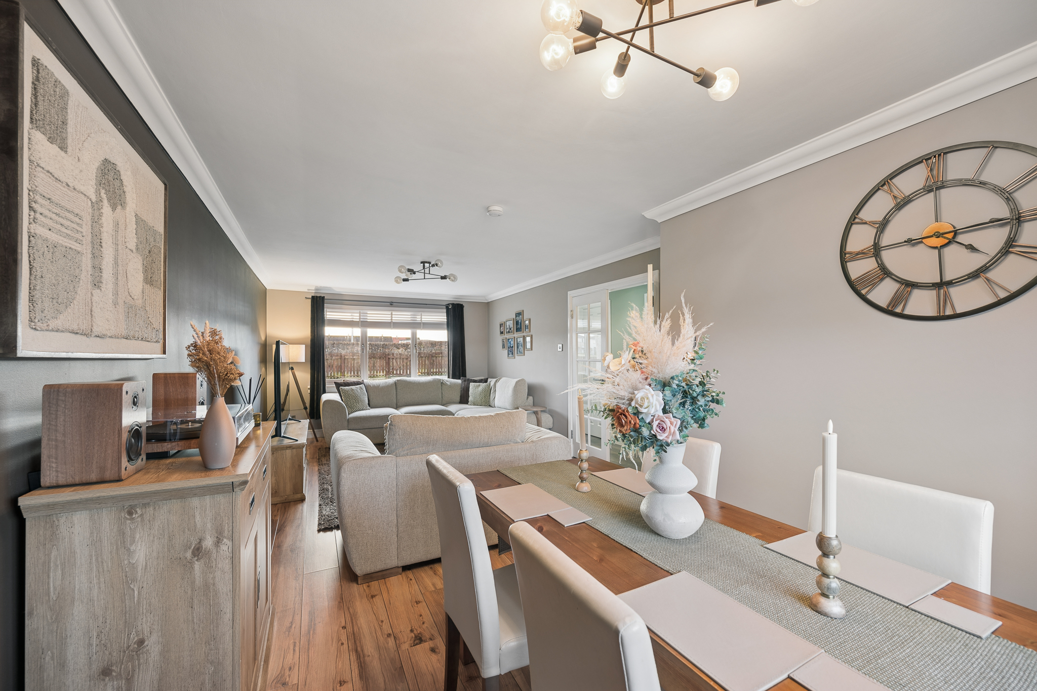 To the right hand side, you’ll find the open-plan living and dining area. Beautifully styled in soft, earthy tones, this is a wonderfully bright and versatile space designed for modern family living. Dual aspect windows allow natural light to pour in from both the front and rear of the property, creating an airy and uplifting atmosphere throughout the day. The room offers generous proportions, easily accommodating a comfortable lounge setup to the front, while the rear of the space provides ample room for a full dining table ideal for family meals, entertaining guests or simply enjoying everyday life.