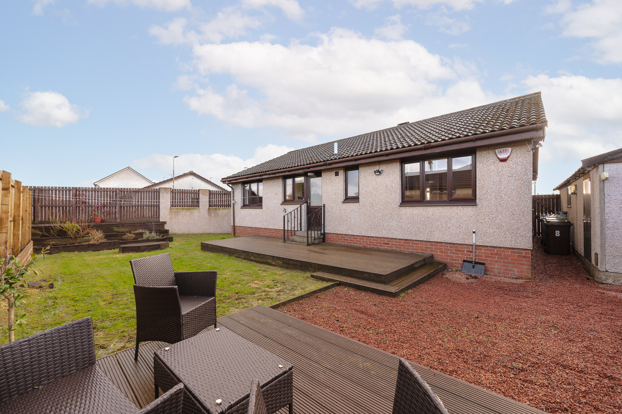 Stepping outside via the kitchen, the home continues to impress with its east-facing rear garden. Thoughtfully designed to capture the morning and early afternoon sun, the garden offers a wonderful combination of lawn and decked seating areas perfect for relaxing, entertaining, or enjoying outdoor dining during the warmer months.