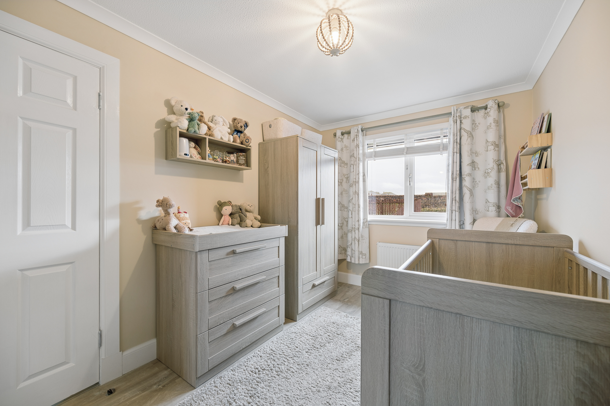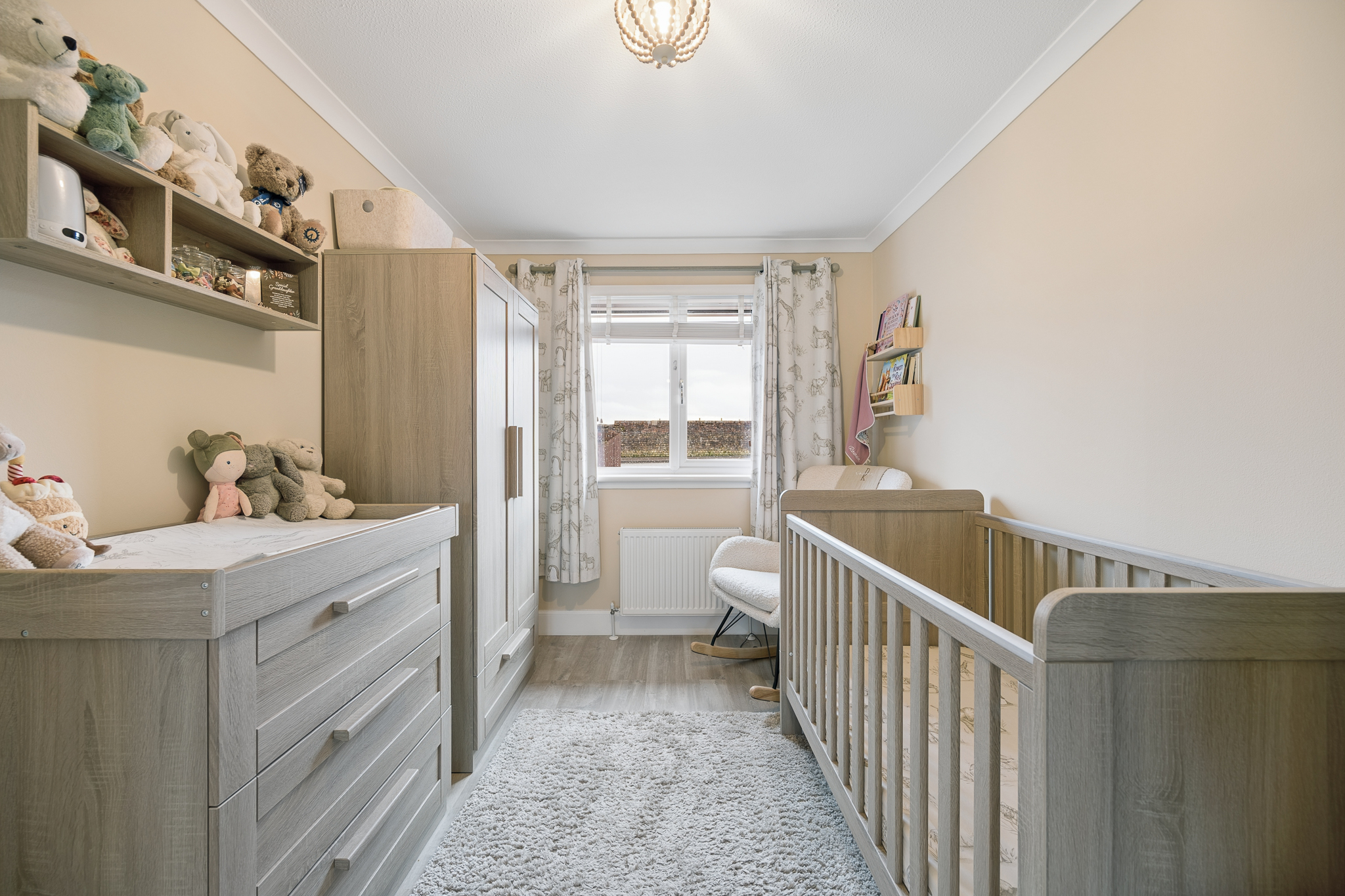 Turning the corner, you’ll find Bedroom Two, currently arranged as a charming nursery. Finished in soft neutral tones with plush carpeting underfoot, this cosy yet versatile room also benefits from built in wardrobes and would equally work well as a guest bedroom or dressing room.