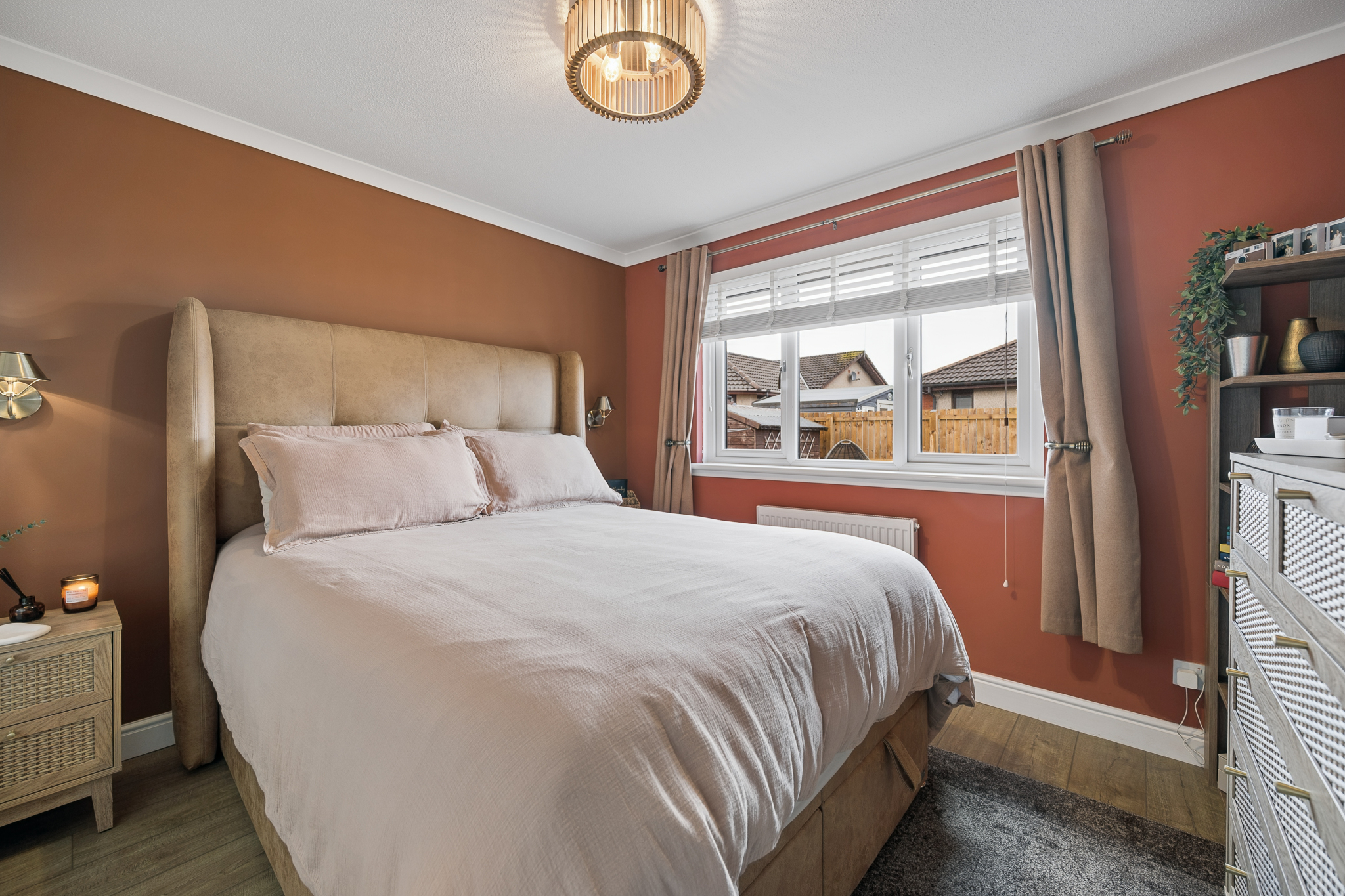 At the end of the corridor on the right hand side, overlooking the rear garden, is Bedroom One. This beautifully presented room comfortably accommodates a king size bed and benefits from built in wardrobes, providing excellent storage while maintaining a calm and uncluttered feel. Soft lighting and warm décor create a peaceful and relaxing main bedroom.