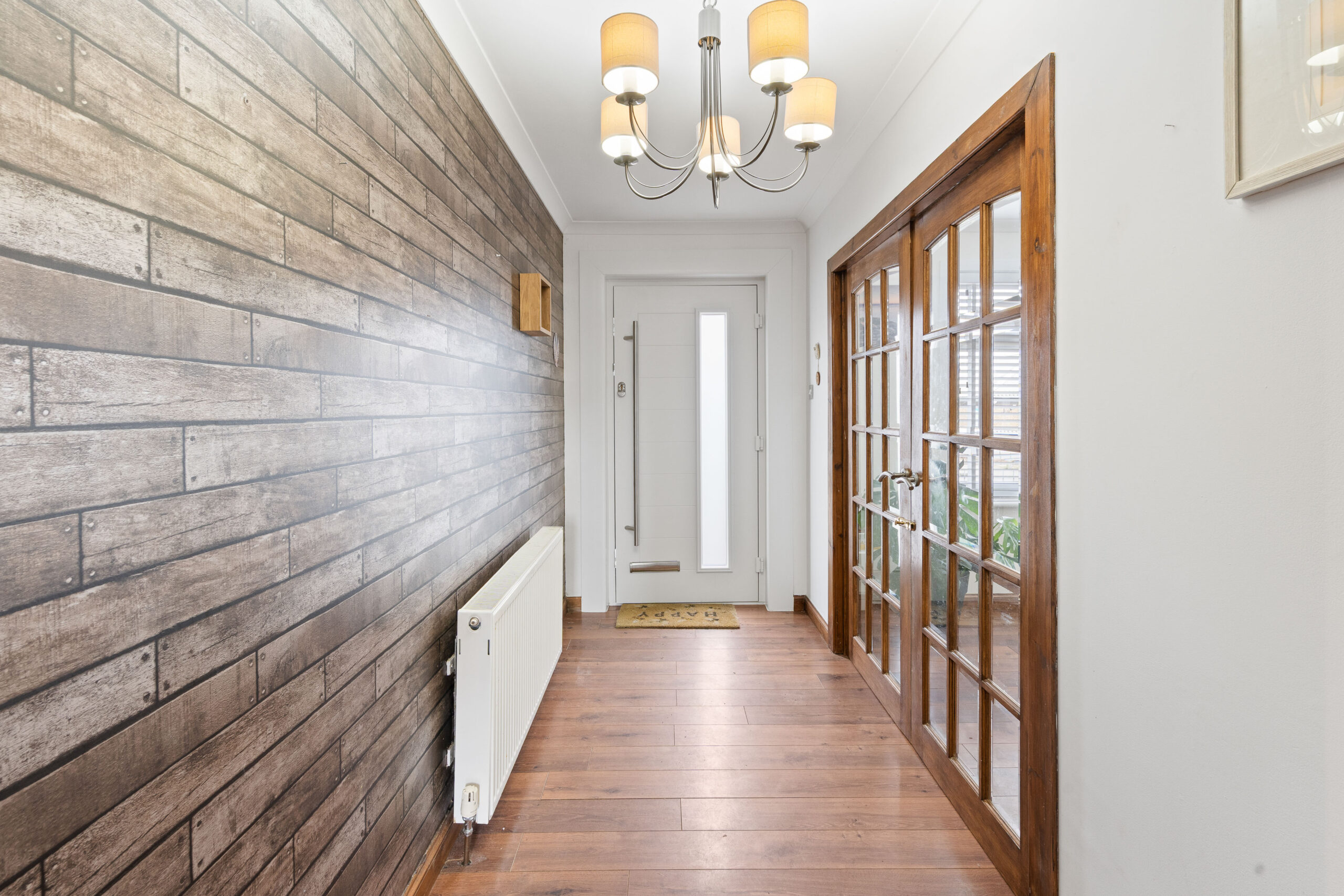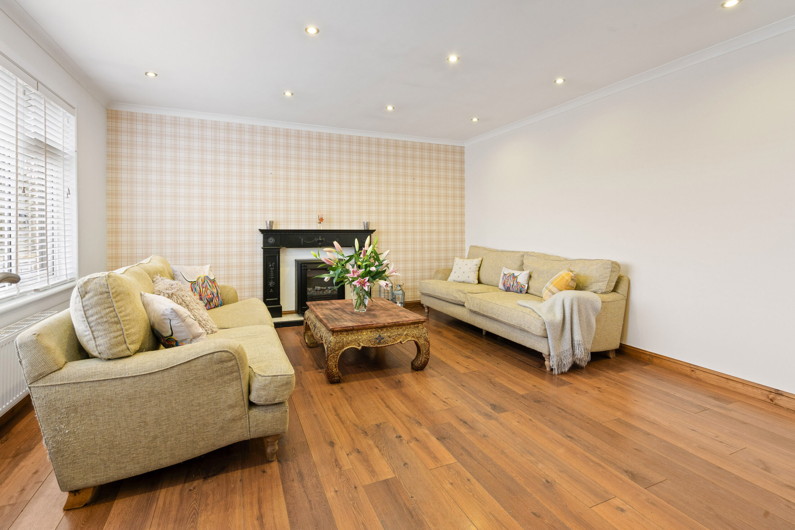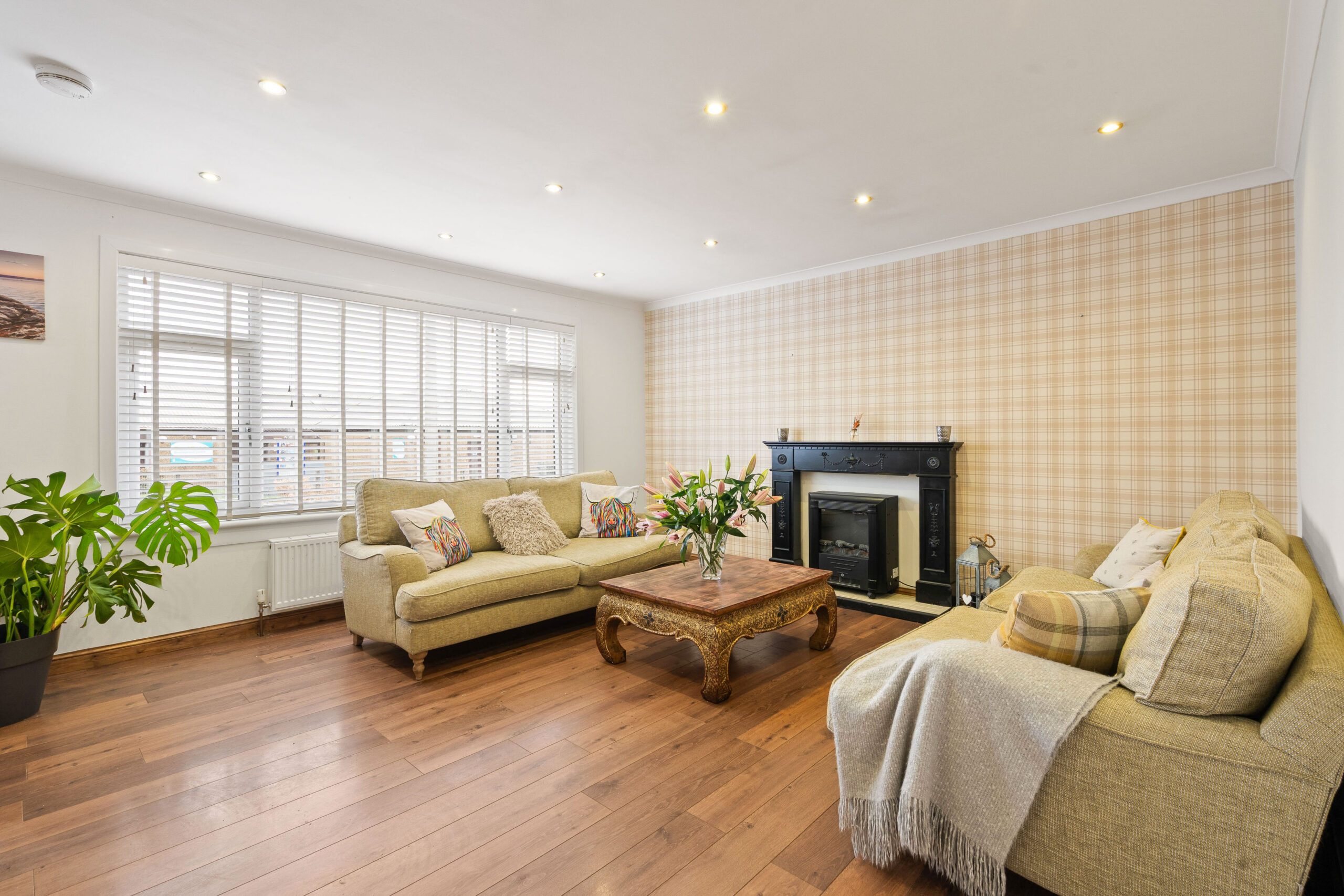 Upon entering, you are welcomed into a bright and inviting hallway that leads through the heart of the home. Positioned to the front of the property is the spacious lounge, a comfortable and well proportioned room that easily accommodates two large sofas and a media wall. A feature fireplace provides a focal point, while large windows allow natural light to flood the space, creating a warm and relaxing environment.