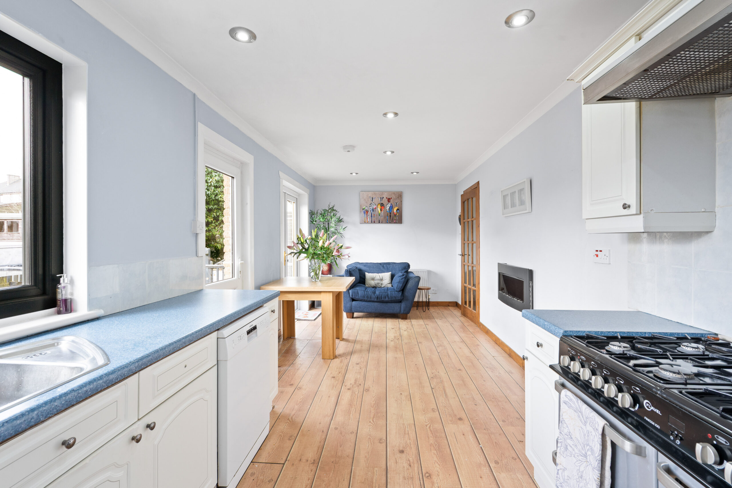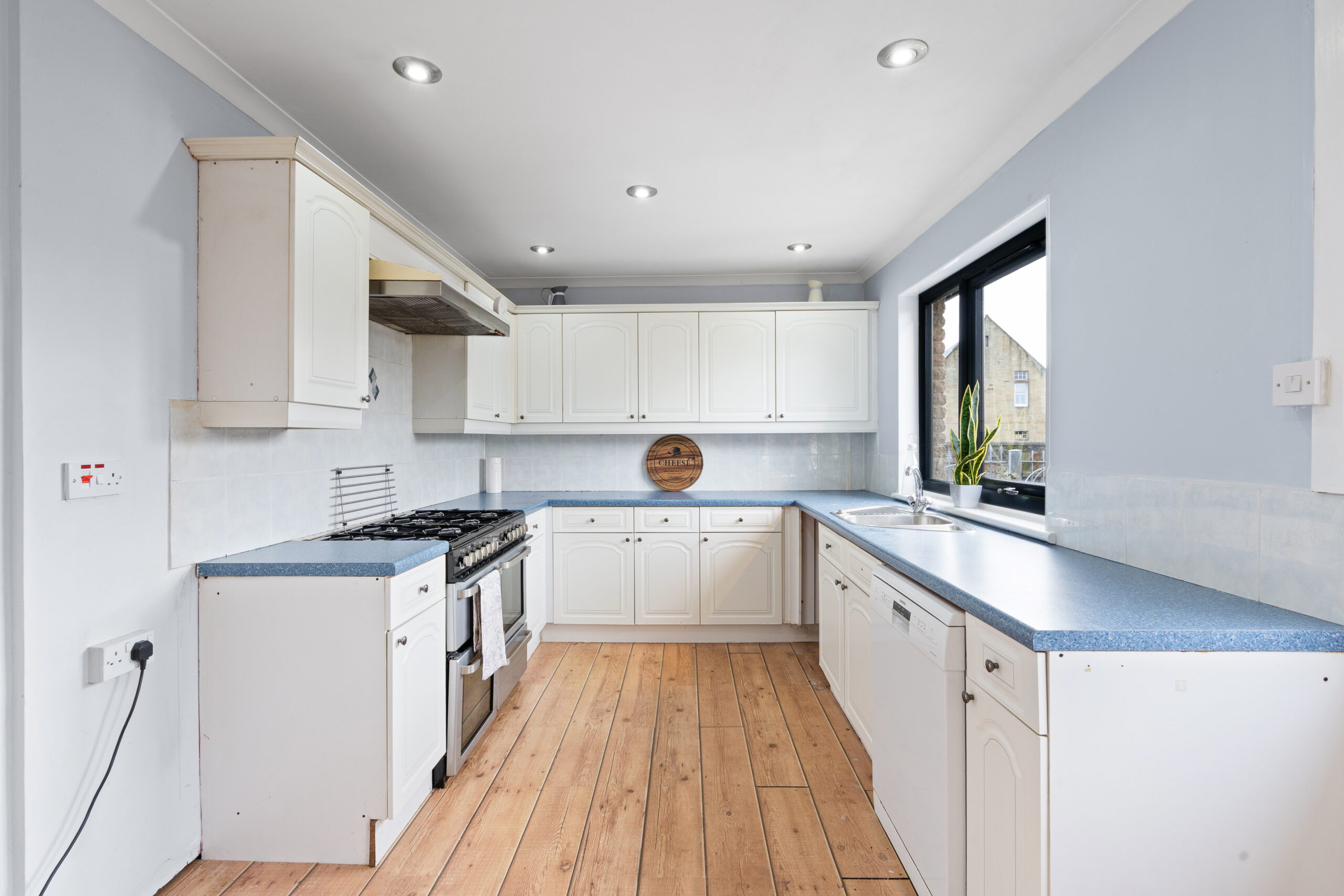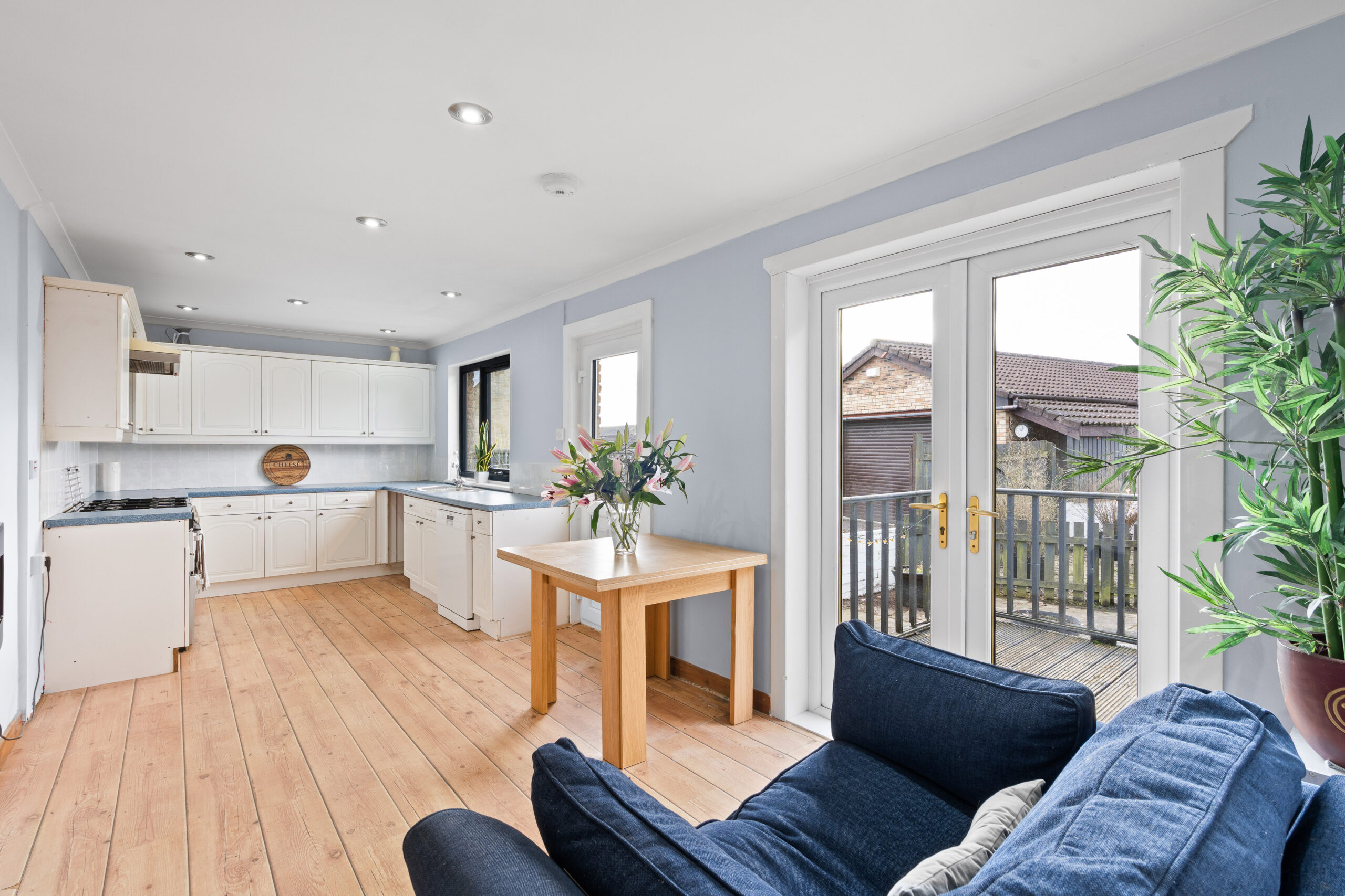 Further along the hallway towards the rear sits the impressive open plan kitchen and dining area. Designed with both practicality and entertaining in mind, the kitchen features white cabinetry, generous worktop space, and an eight burner gas cooker as a standout centrepiece. There is ample space for a dishwasher, washing machine, and even an American style fridge freezer if desired. Spotlights enhance the modern feel, and the dining area comfortably seats around five people. Patio doors open directly onto the rear decking, creating a seamless indoor outdoor flow ideal for entertaining.