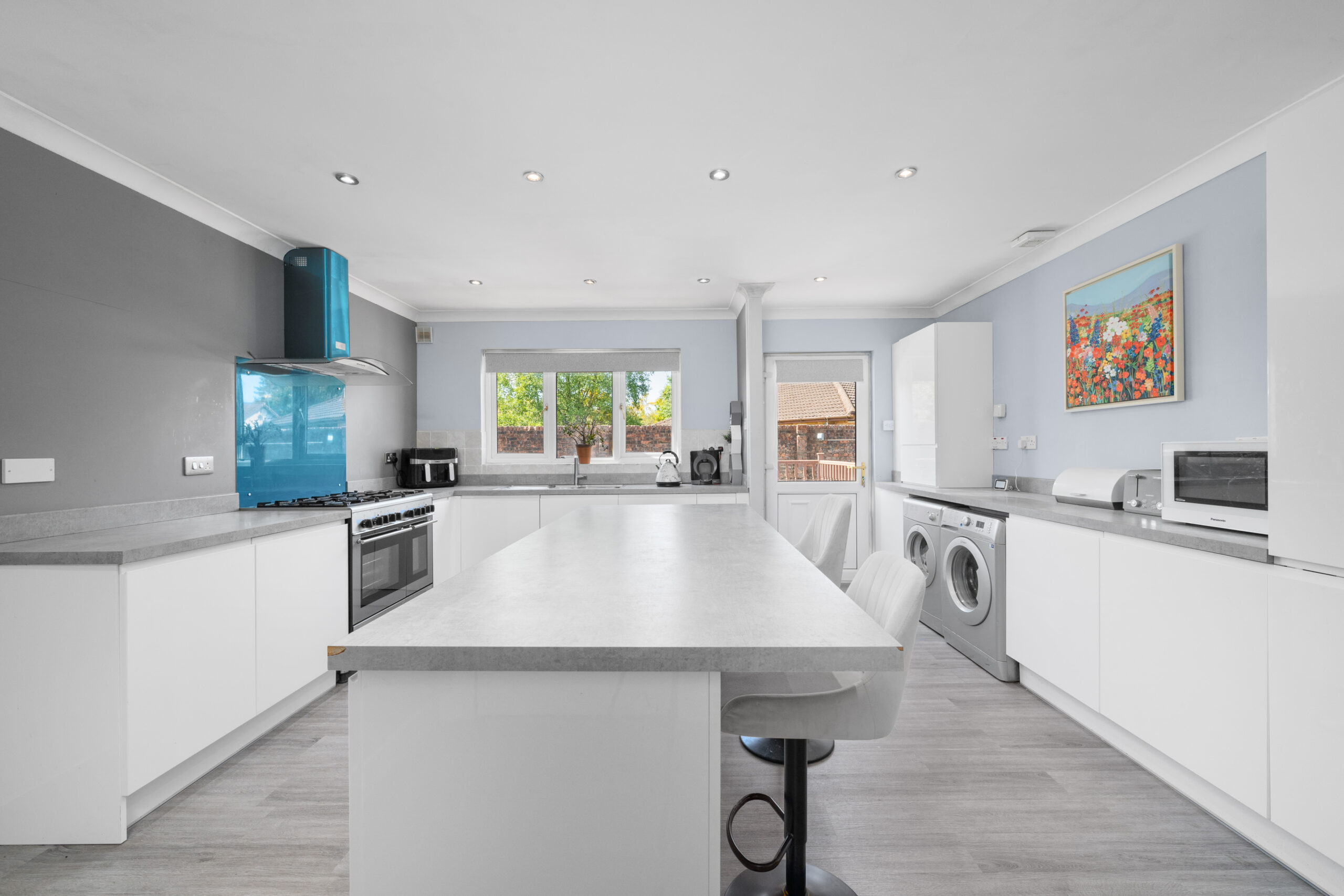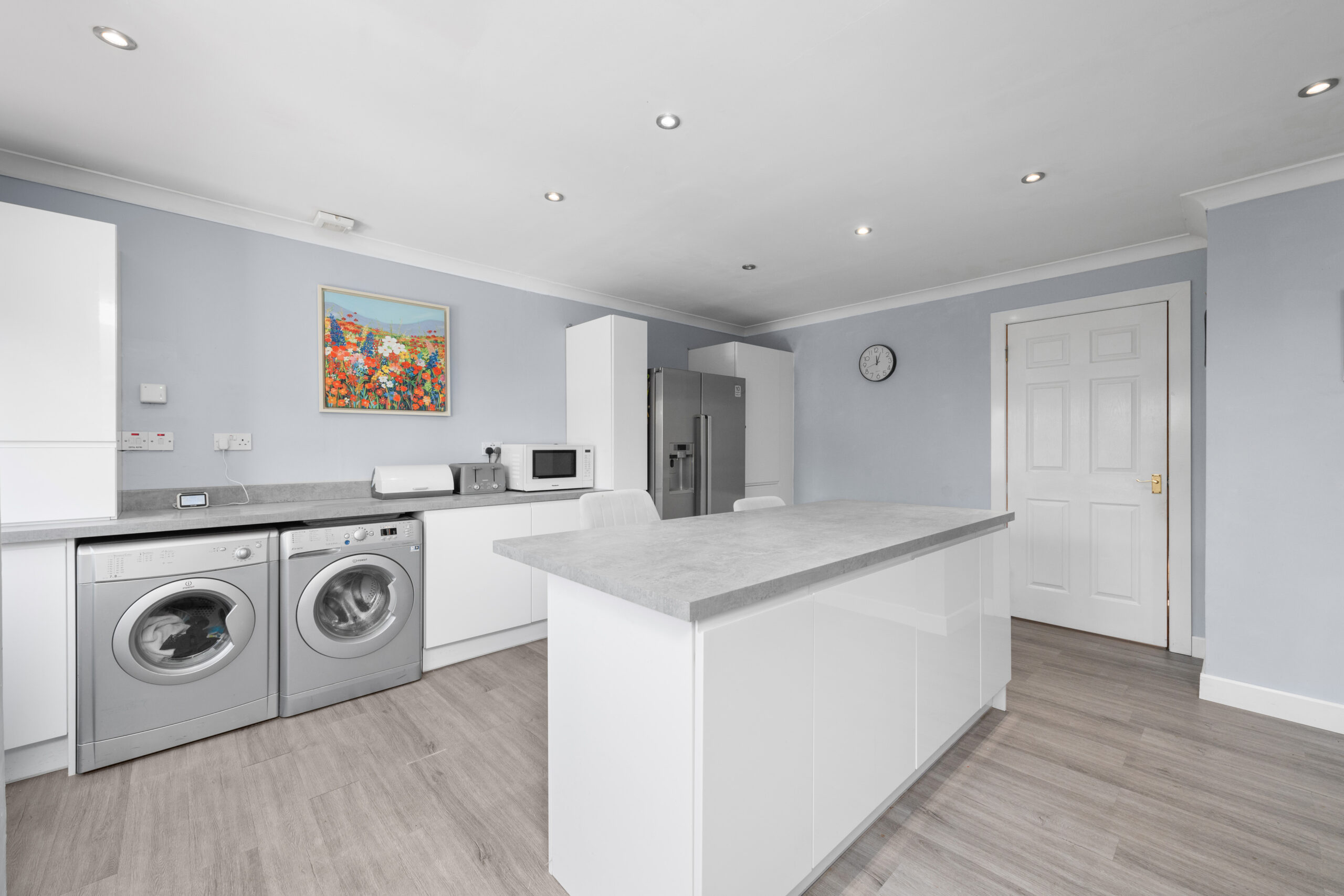 The heart of the home lies in the high-specification kitchen, fully renovated just two and a half years ago. Designed with both style and practicality in mind, it showcases sleek white gloss cabinetry, contrasting grey worktops, and a central breakfasting island that forms the perfect family hub. High-end appliances include a range-style gas burner, oven and grill, integrated dishwasher, freestanding double fridge, washing machine, and tumble dryer, all complemented by modern grey laminate flooring and ambient lighting for a polished, contemporary finish.