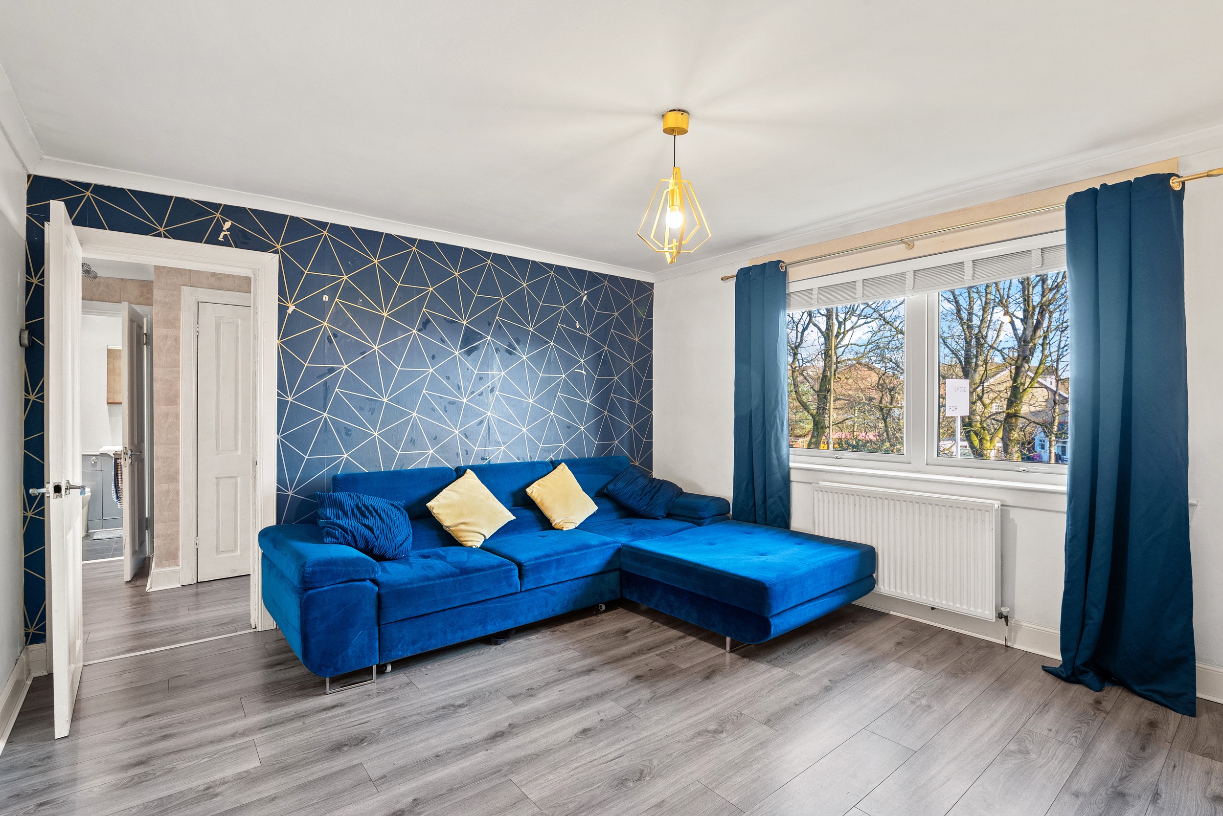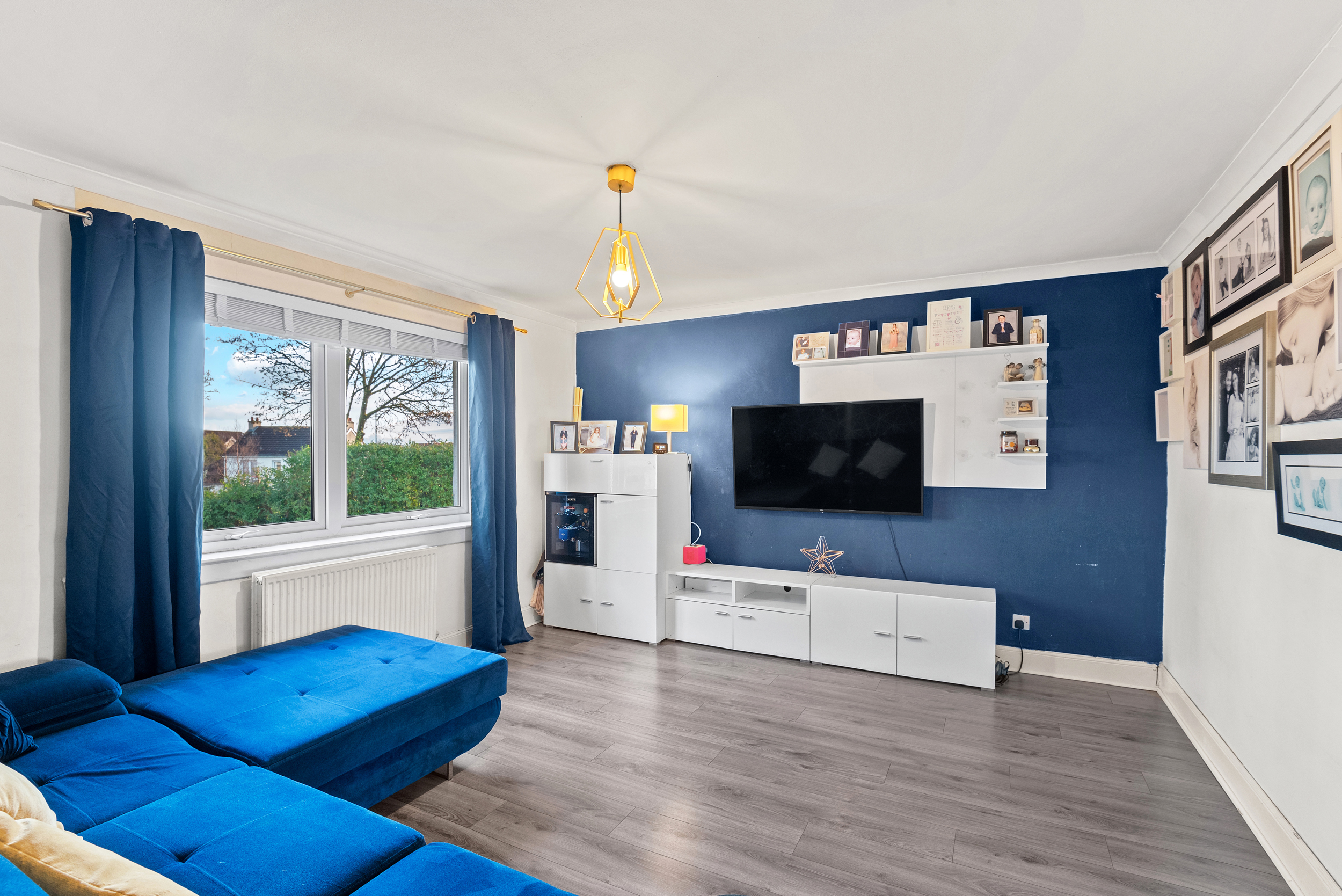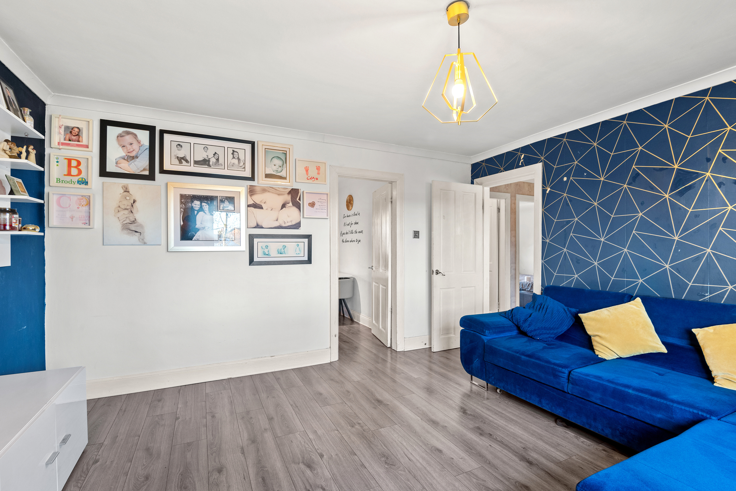 As you step through the front door, you are welcomed into a central hallway that provides a natural sense of flow through the property. Contemporary grey wood effect flooring runs underfoot, complemented by neutral wall finishes that create a bright, cohesive feel and immediately allow the space to feel both modern and versatile. From here, the main lounge opens to the left, offering a bright and generously proportioned living space that comfortably accommodates a full suite of lounge furniture. A bold yet tasteful navy feature wall adds depth and character, while the room’s layout allows for flexible furnishing and a comfortable everyday living environment.