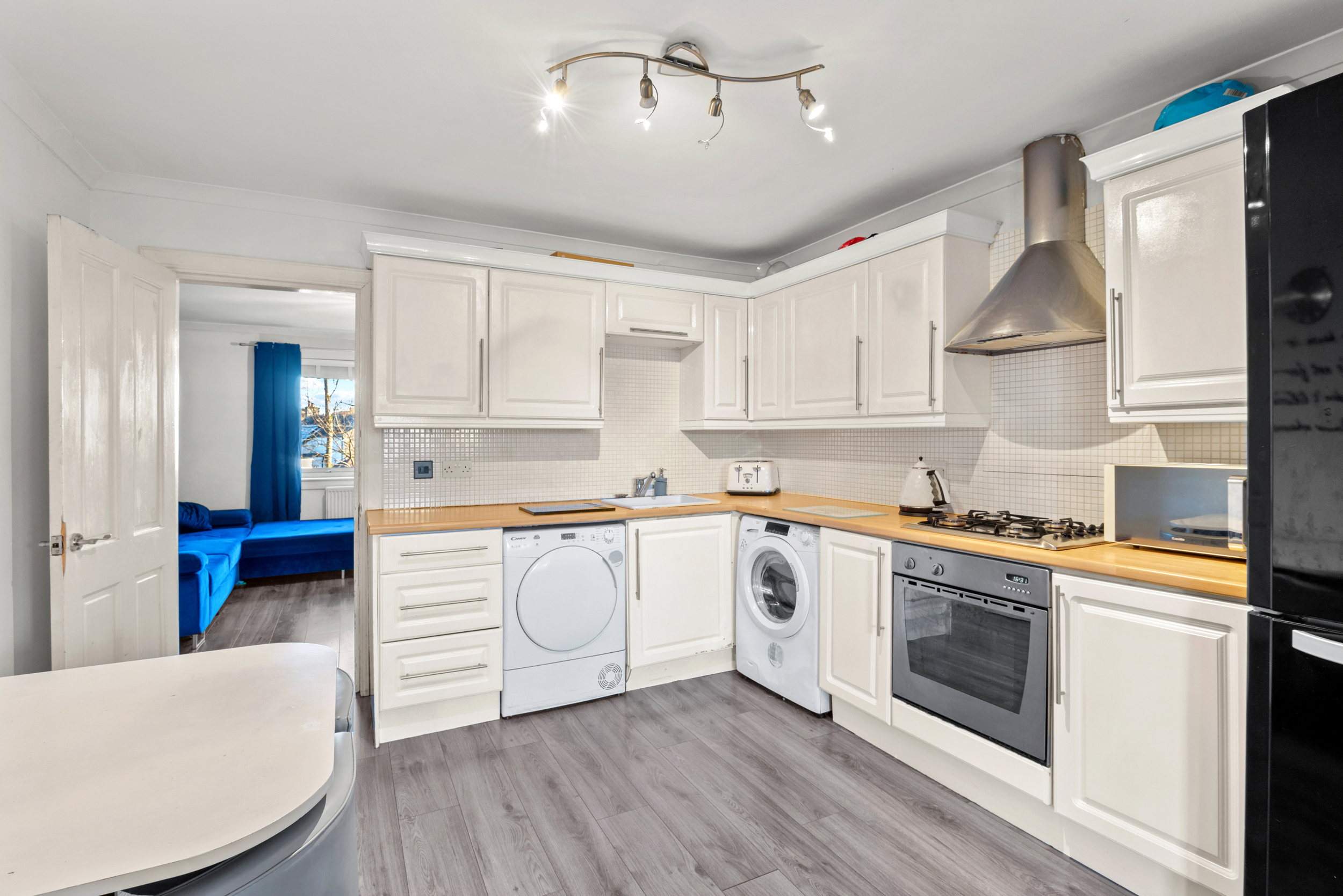 The lounge flows seamlessly through into the kitchen, maintaining continuity in both flooring and style and reinforcing the sense of openness throughout the ground floor. The kitchen is well arranged with a good range of light finished wall and base units, wood effect worktops and integrated appliances, creating a practical yet inviting space for daily life. There is ample room for dining, making this a natural hub of the home where cooking, family meals and entertaining effortlessly come together.