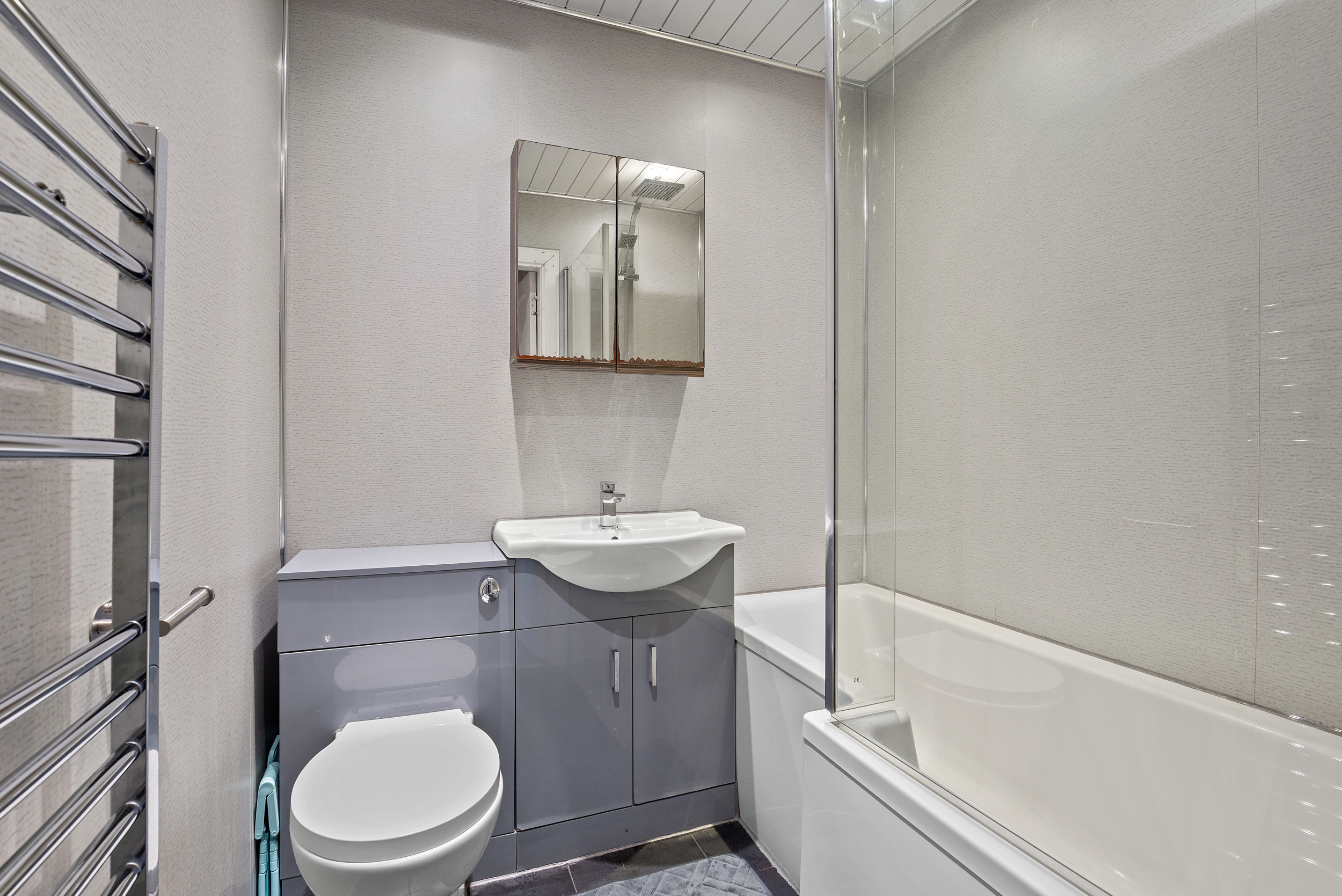 Completing the accommodation is the family bathroom, finished in a clean, modern style with a full size bath and glass screen, contemporary vanity unit with integrated storage, WC and a chrome heated towel rail. Dark floor tiling contrasts beautifully with neutral wall finishes, while ceiling spotlights add to the bright, polished feel of the space.