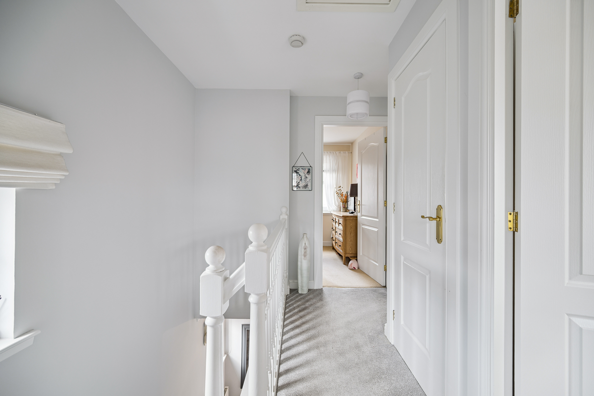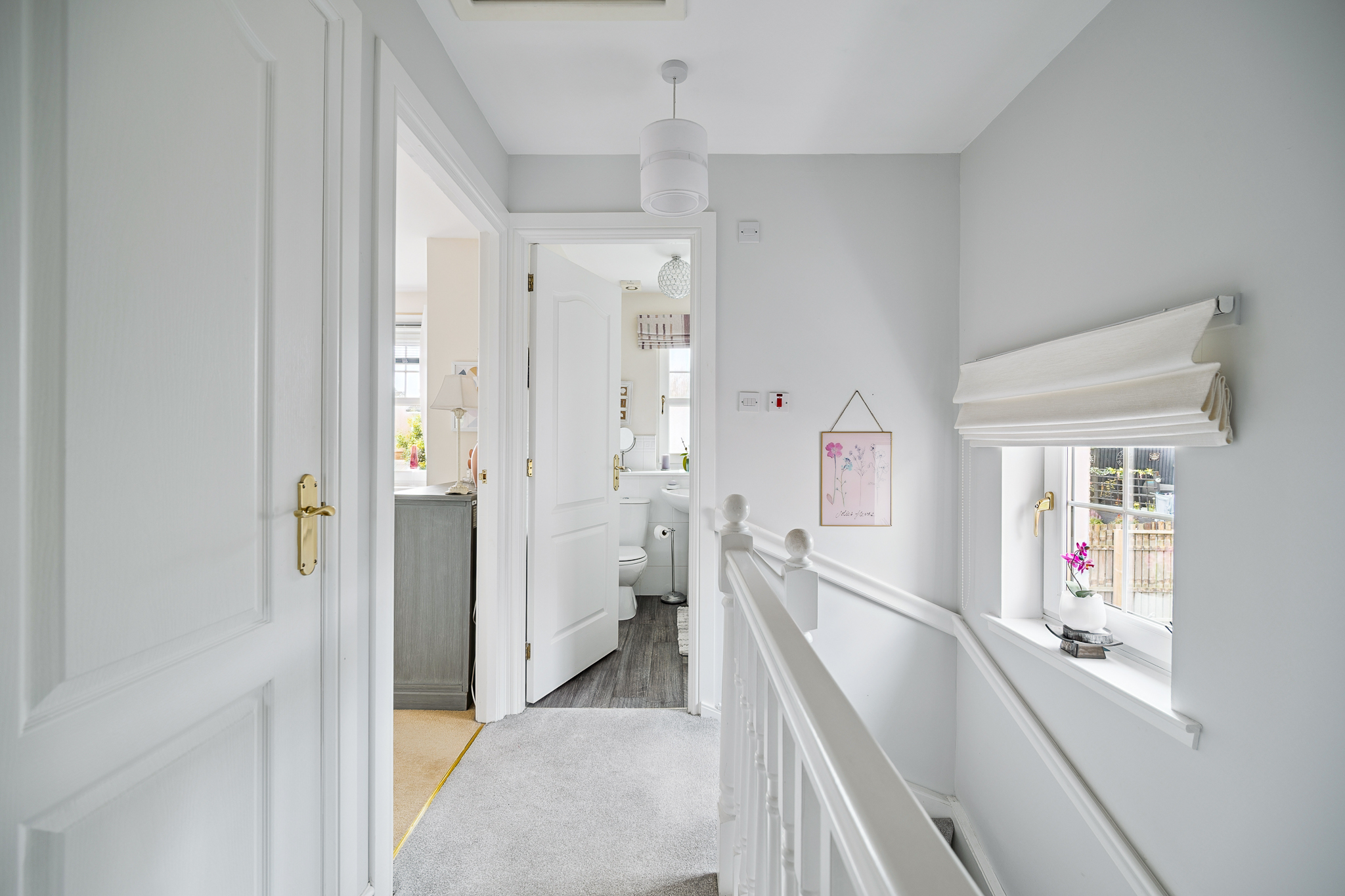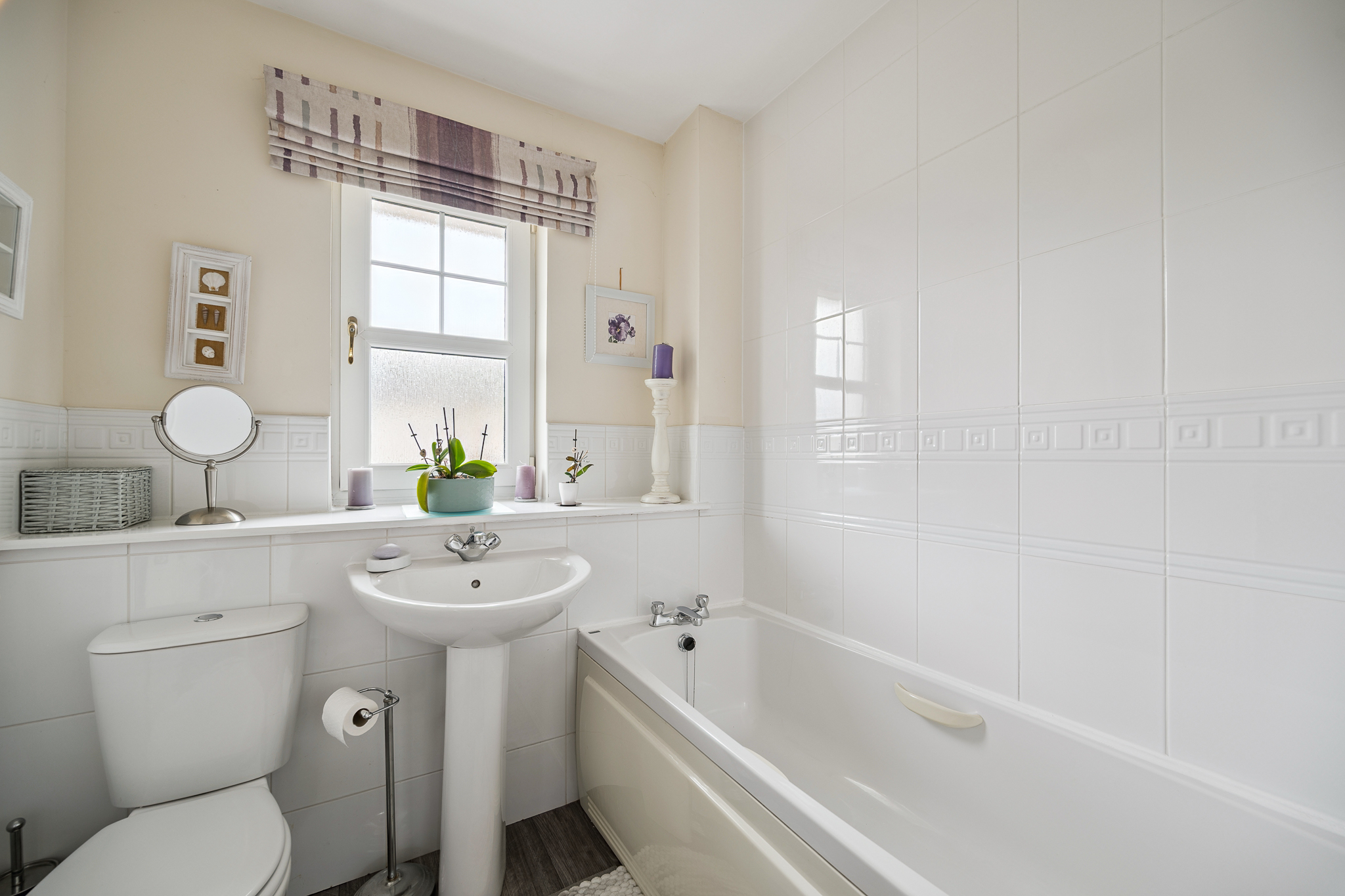 Making your way up the staircase, the plush carpeting continues, guiding you to the upper level. At the top of the stairs, you’ll find the family bathroom, complete with a bath, sink and WC, with elegant white tiling surrounding the bath area, giving it a clean and timeless finish.