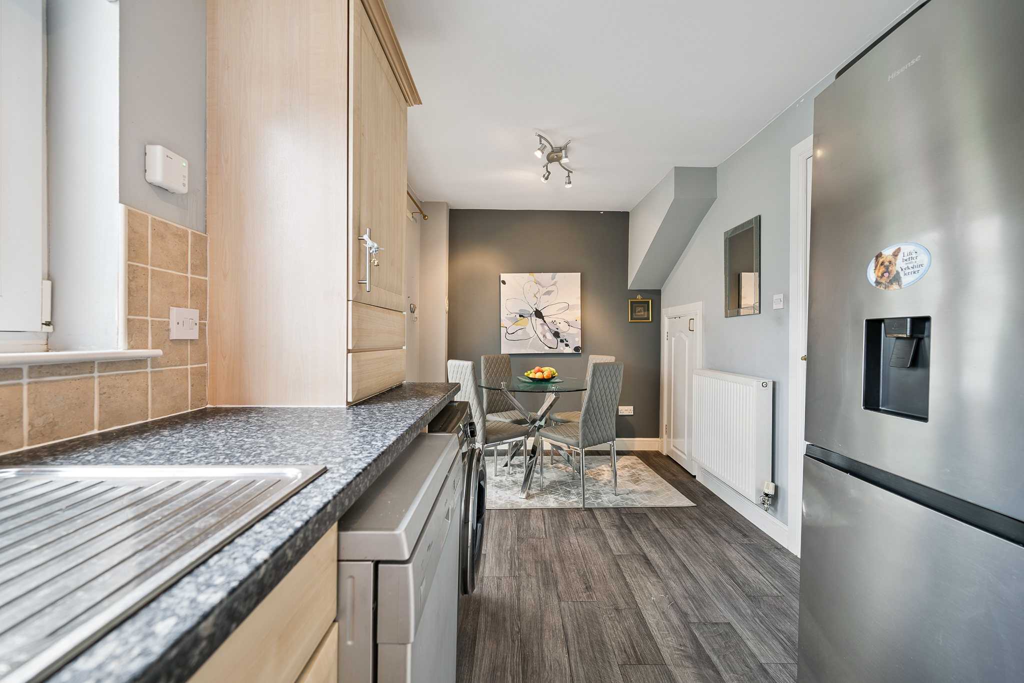 From here, the home flows effortlessly through to the kitchen, where you’ll find a well designed space complete with wooden effect cabinetry paired beautifully with dark worktops. There is ample room for a dining table, creating a sociable hub for everyday living and mealtimes alike, all enhanced by an abundance of natural light pouring in.