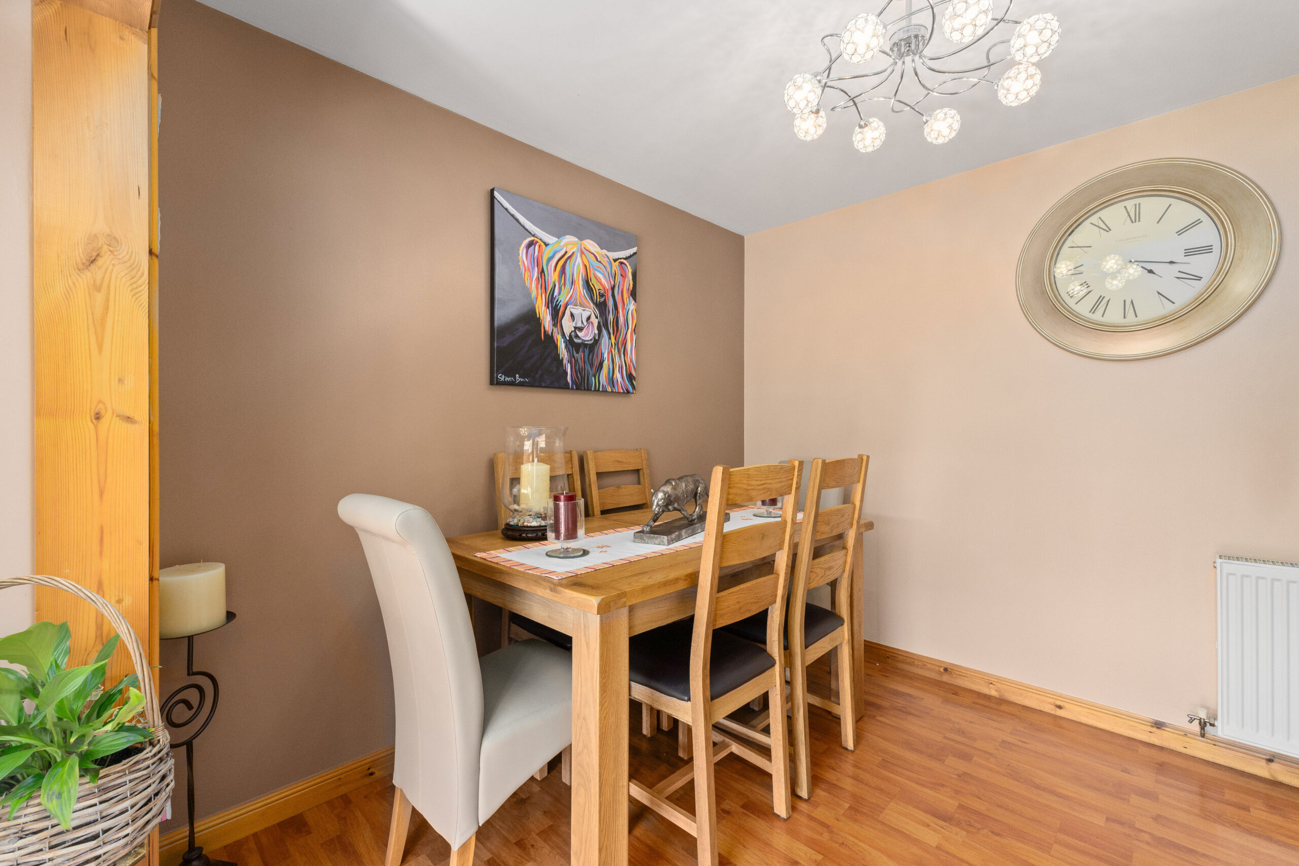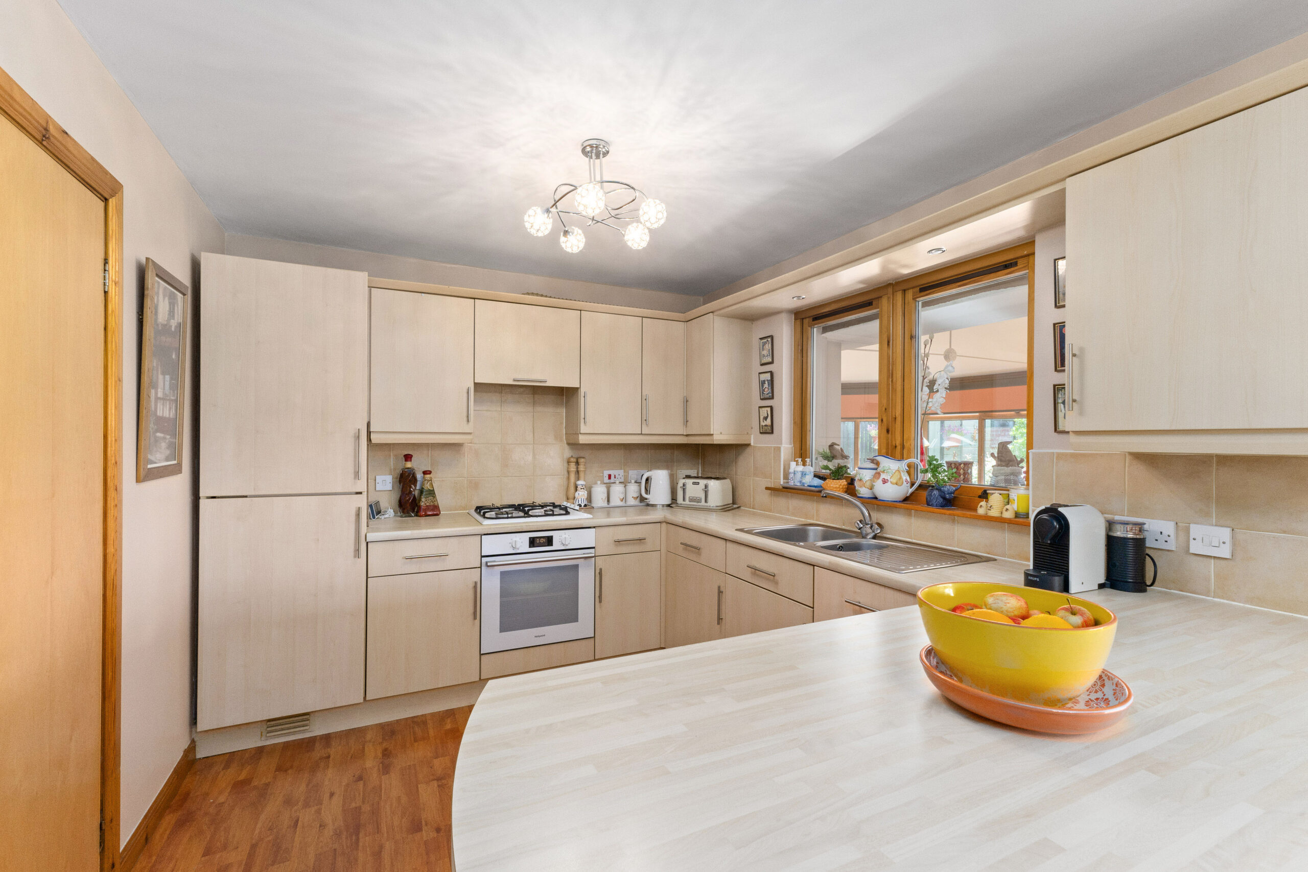 To the rear, the heart of the home lies in the open plan kitchen and dining area, perfect for hosting. The kitchen features splashback tiling throughout, cream cabinetry, integrated appliances including a fridge, freezer, and a four burner gas hob, as well as a sleek breakfast bar. There is ample space for a six seater dining table, making this an ideal hub for busy family life or entertaining guests.