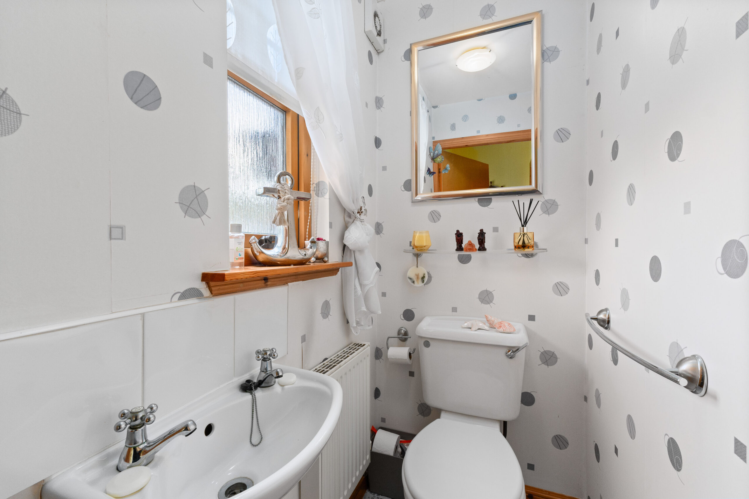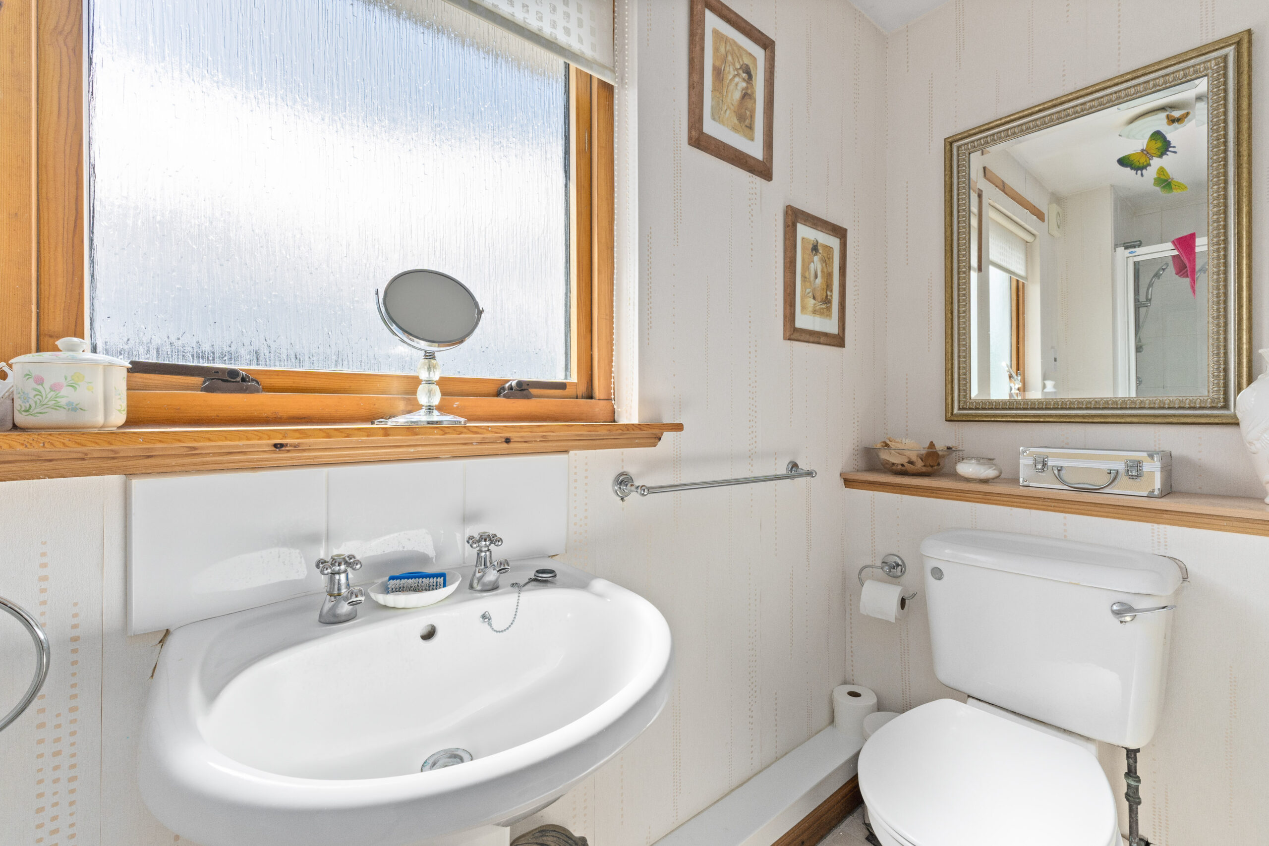 The main bathroom is a characterful three piece suite featuring a bathtub, splashback tiling, and a unique salmon toned wallpaper that adds a vibrant touch.