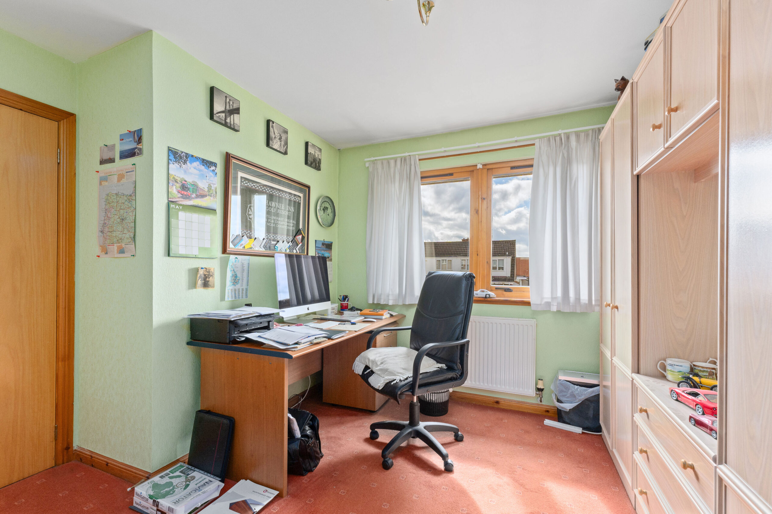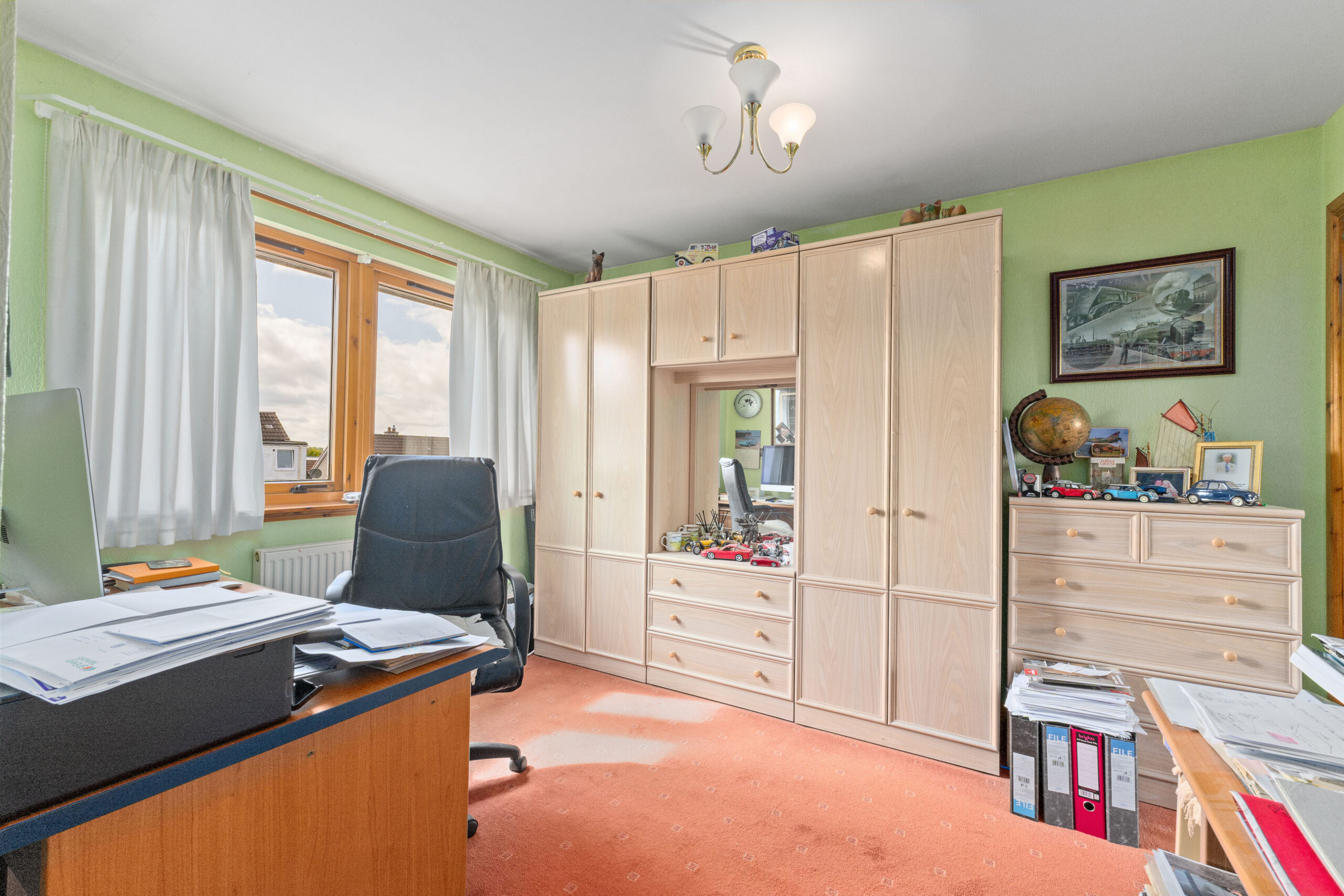 Upstairs, the bright landing is enhanced by a skylight, creating an airy, light filled space. The principal bedroom is generously proportioned and can easily host a king size bed, with two fitted wardrobes featuring made to measure mirrored sliding doors. A stylish three piece en suite with a standing shower and splashback tiling completes the suite. Bedroom two is currently set up as an office but offers fantastic versatility. With double aspect windows and space for a king size bed, fitted wardrobe, chest of drawers and bedside cabinets, it is ideal as a guest room or second principal bedroom. Bedroom three is also a great size and can host a double bed along with additional furnishings, making it perfect for children, guests, or even a dressing room.