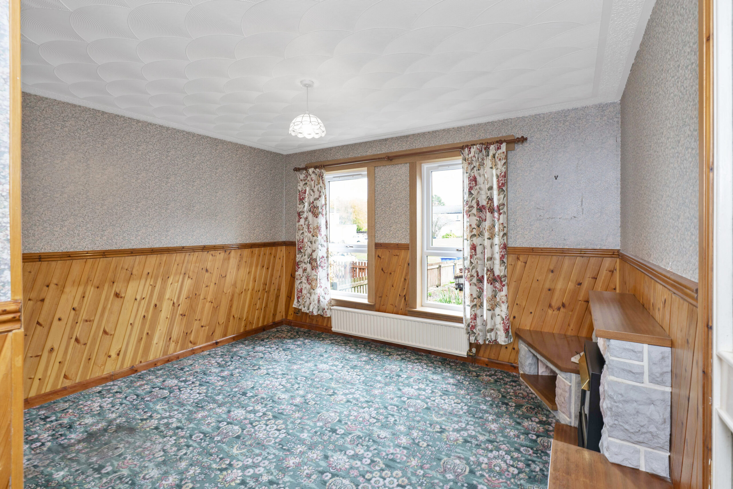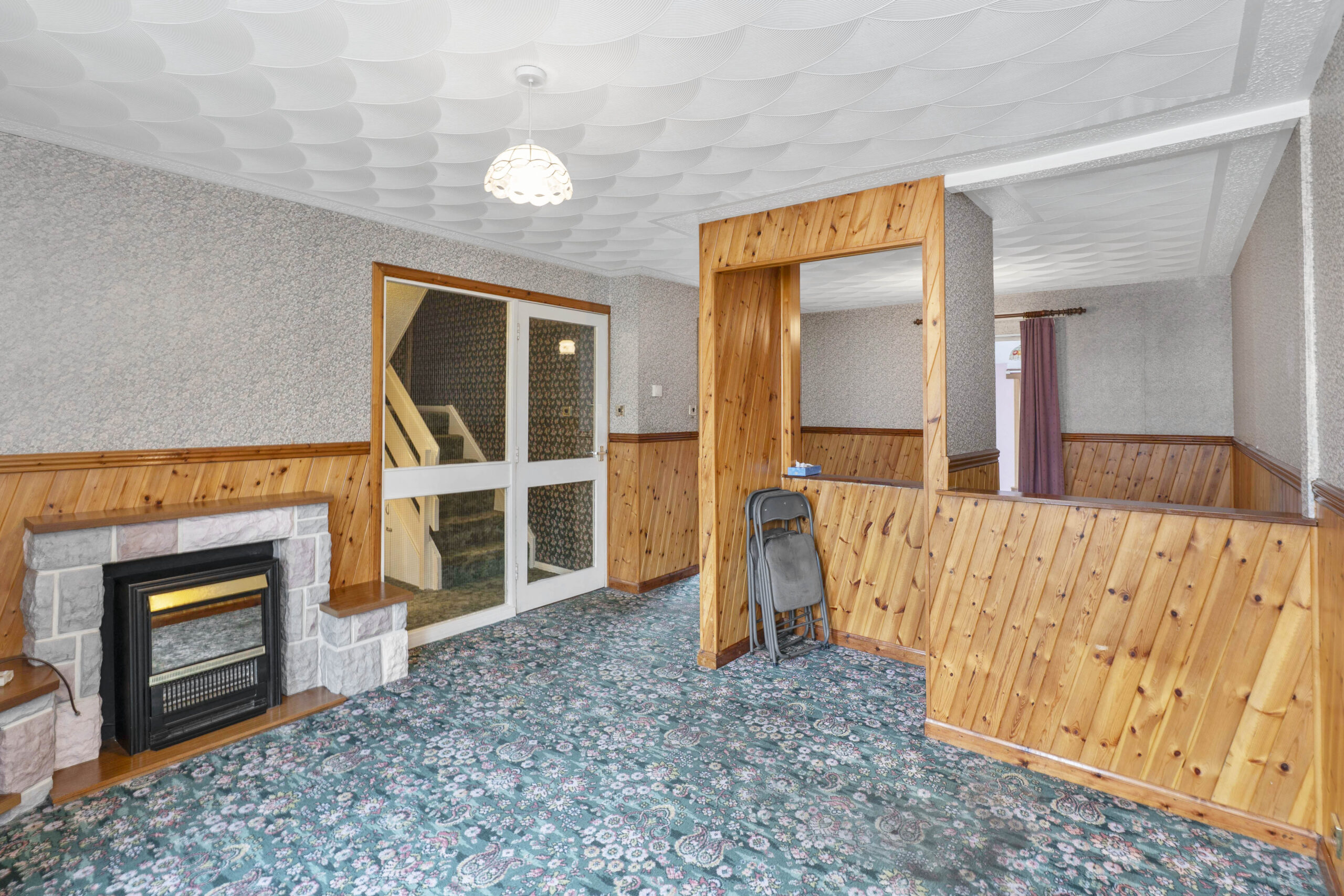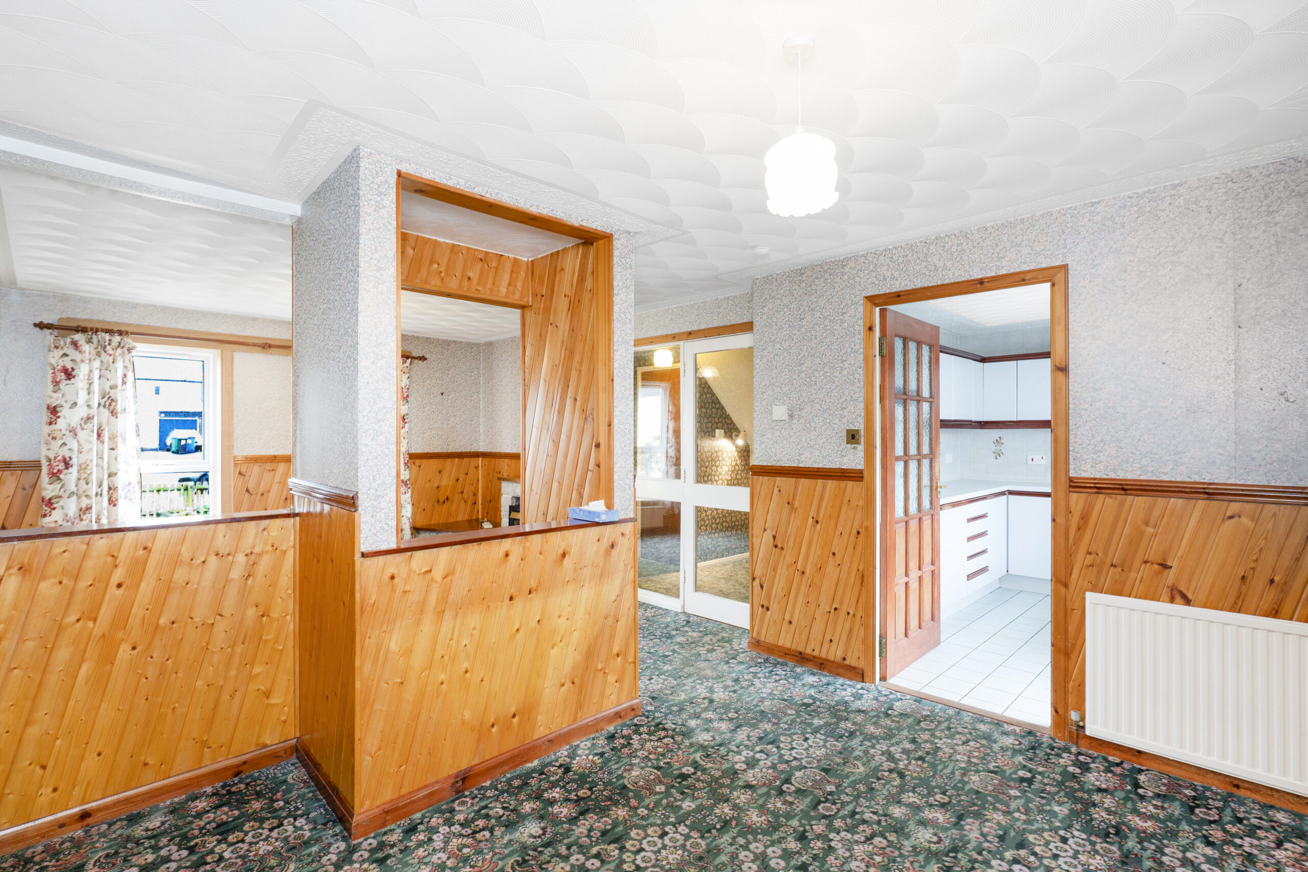 To the right-hand side, you’ll find the generously sized lounge, a warm and inviting space that can comfortably accommodate two or three large sofas along with a media wall. A character fireplace adds a cosy touch, while the room’s proportions also allow for a dining area if desired. There’s also a small partition wall that could be removed to open up the space even further, giving buyers the flexibility to adapt the layout to their needs.