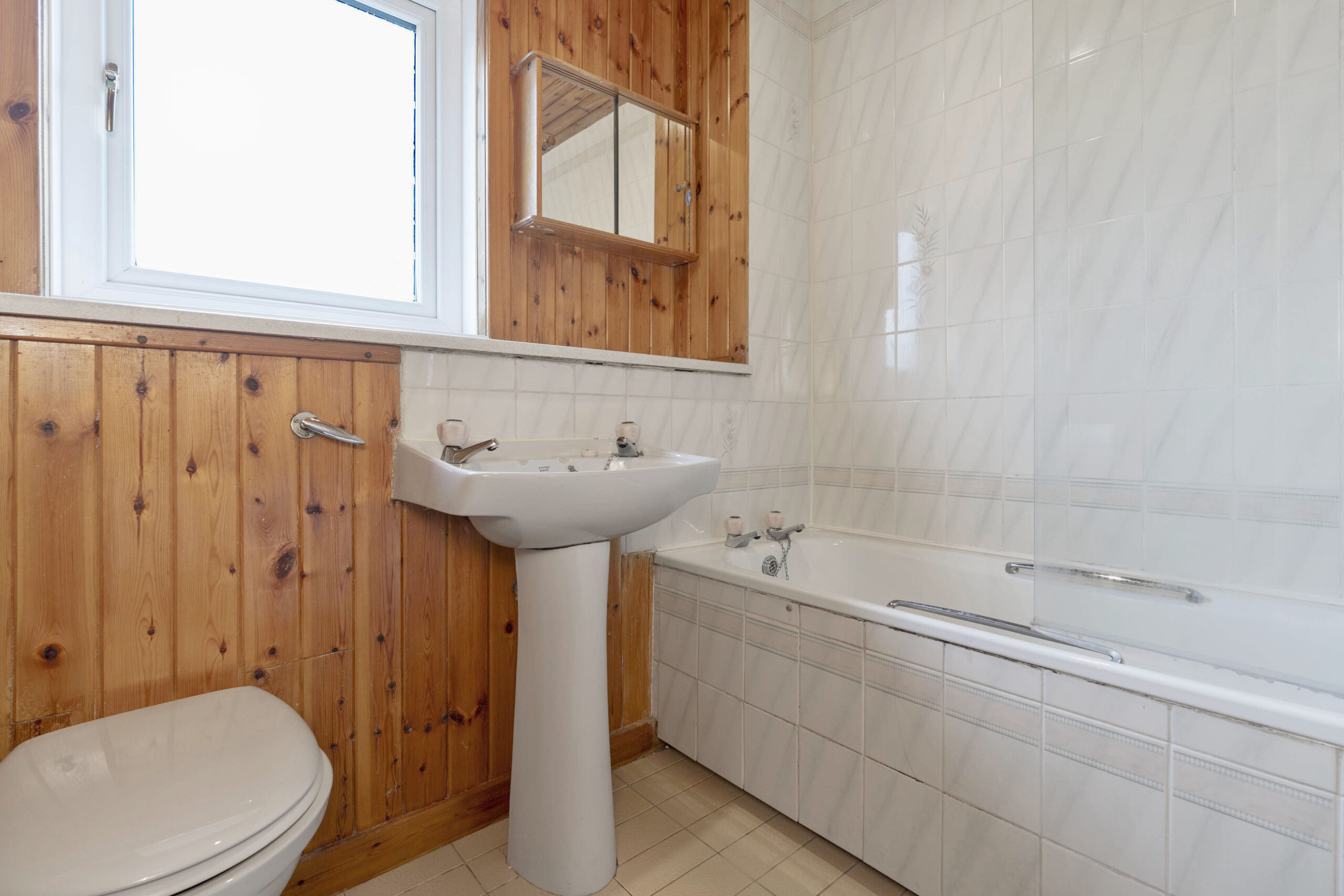 The family bathroom is finished to a high standard, featuring a modern three-piece suite with a bathtub, an overhead shower, full tiling, and chrome fittings.