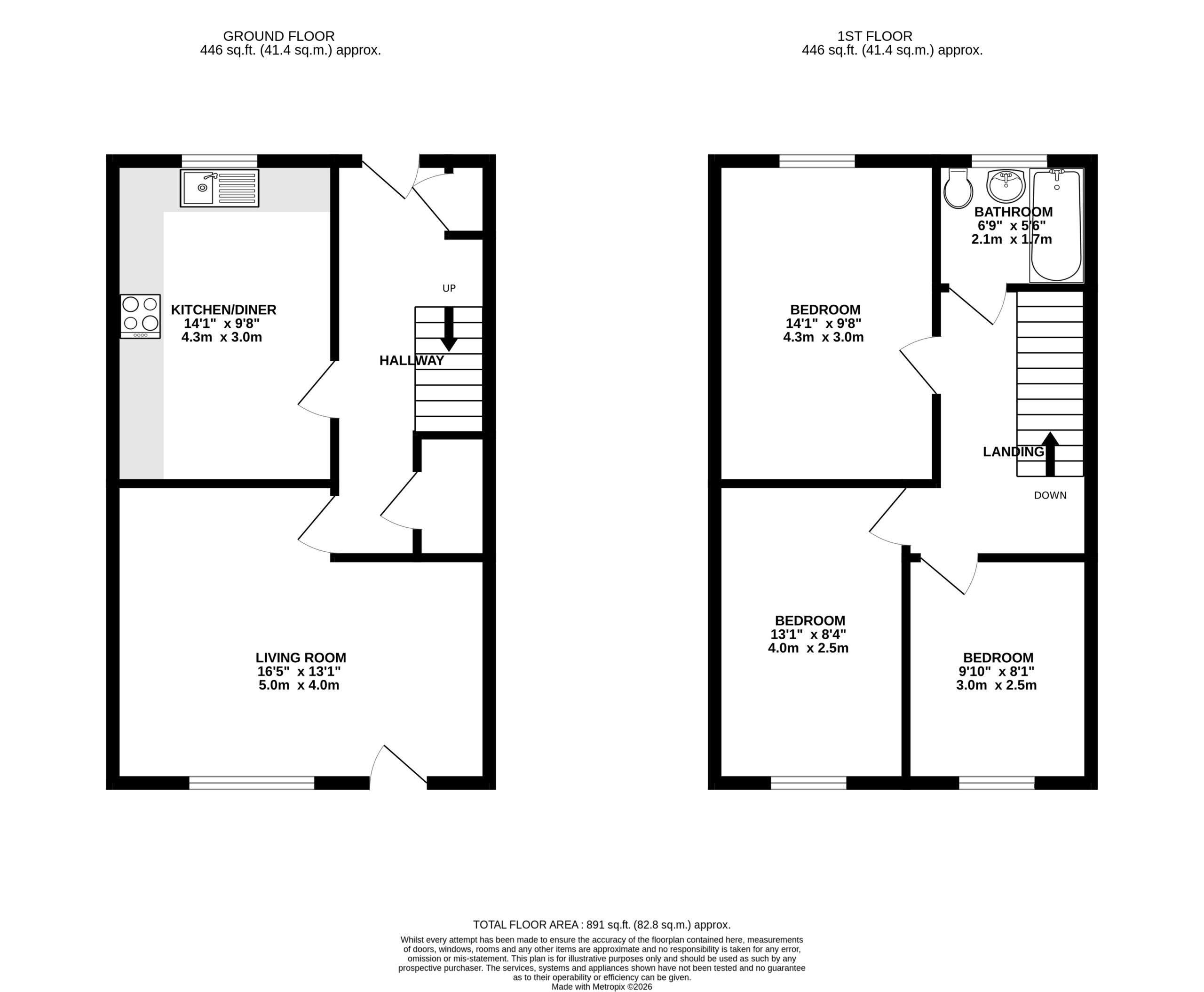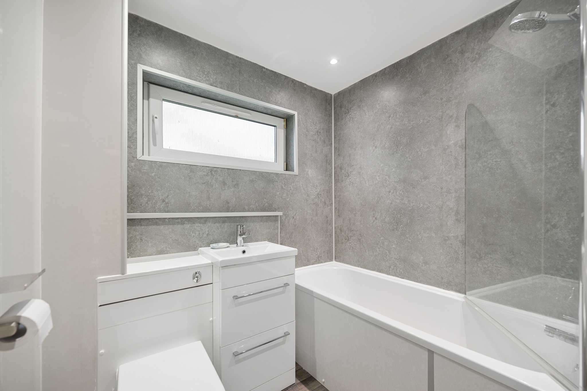 Completing the accommodation is the family bathroom, located directly ahead from the landing. The bathroom is fitted with a modern three piece suite comprising a bath with shower over, wash hand basin with vanity storage and WC. Contemporary wall panelling within the bath and shower area provides a sleek, low maintenance finish, while the room is further enhanced by modern flooring and a frosted window allowing natural light whilst maintaining privacy.