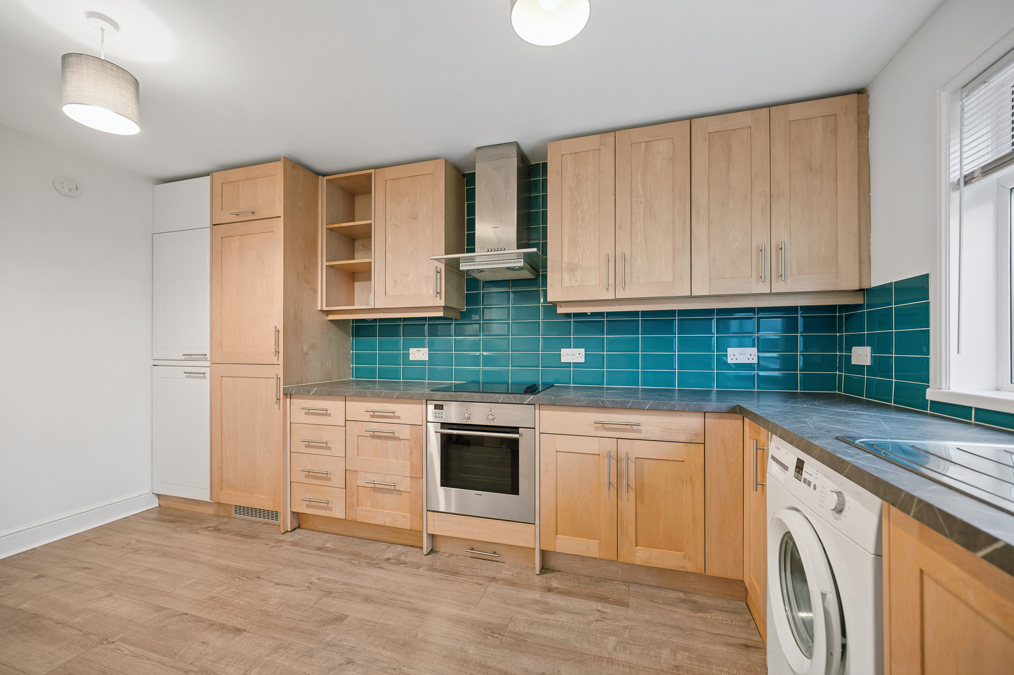 Positioned to the right hand side is the spacious kitchen diner. This well proportioned room is fitted with a range of contemporary wall and base units complemented by stylish work surfaces and a striking tiled splashback. The kitchen incorporates an oven, hob and extractor hood, along with space for additional appliances including a washing machine. There is ample room for a dining table, making this an excellent space for both everyday family living and entertaining.