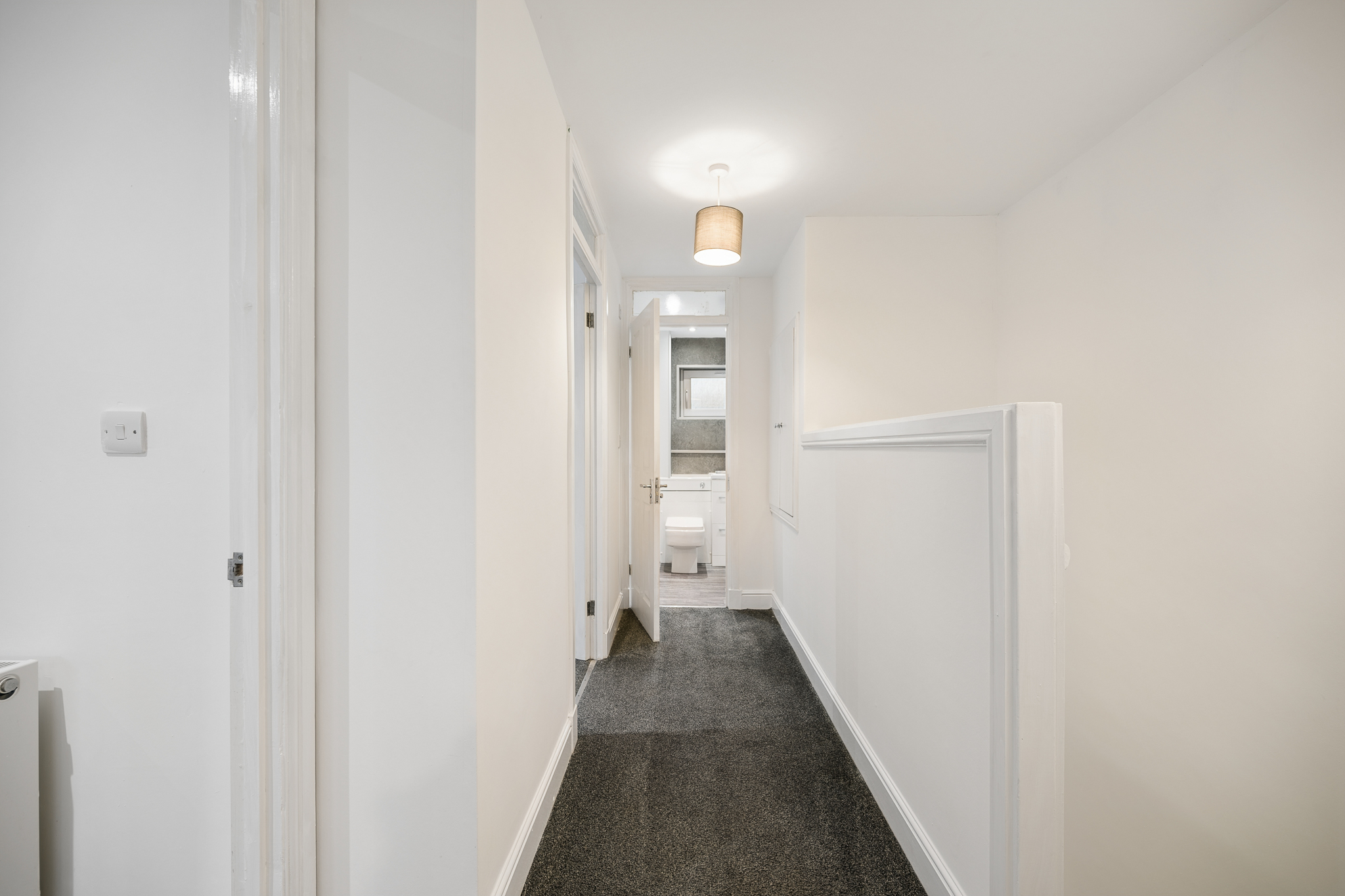 The staircase, finished with modern grey carpeting, leads to the upper landing which continues the home’s clean, neutral décor. On the landing there is a cupboard which can be utilised for bed linen or as additional storage.