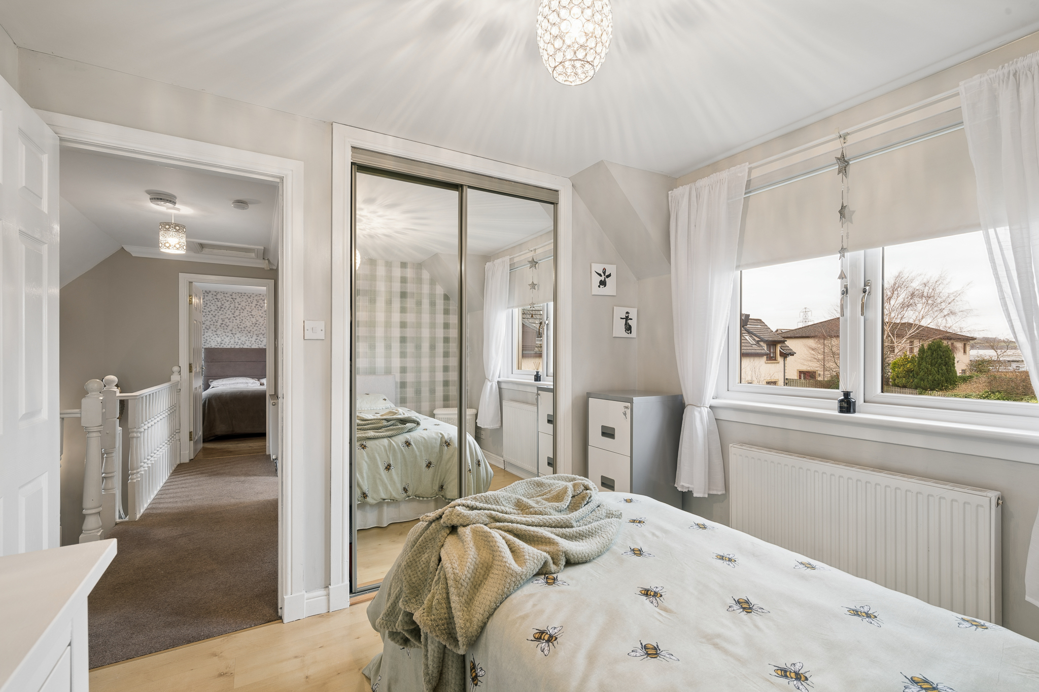 On the upper landing, turning left leads you into the principal bedroom suite. Currently configured with a king size bed, this elegant room benefits from built in mirrored wardrobes that reflect light and enhance the feeling of space. The décor is calm, neutral, and inviting, a true sanctuary for rest and relaxation.